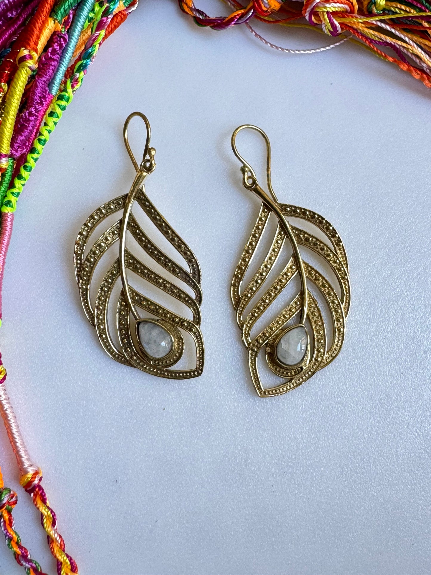 Boho style earrings in hypoallergenic brass with moonstone-like insert.