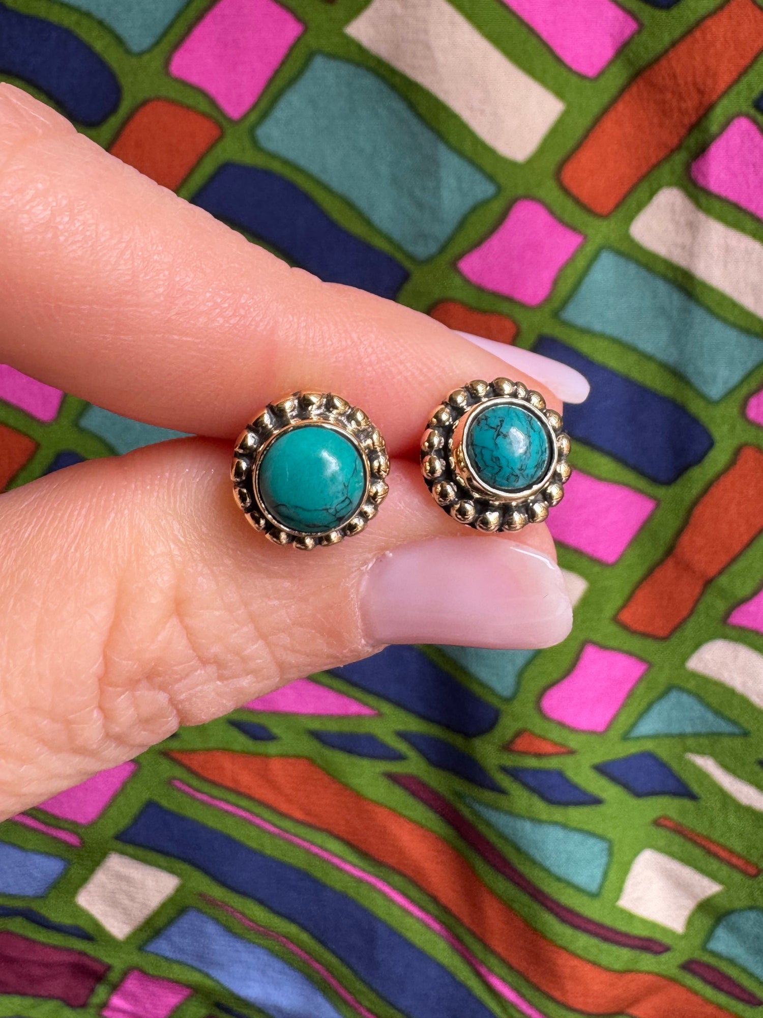Boho style earrings in hypoallergenic brass with turquoise-like insert.
