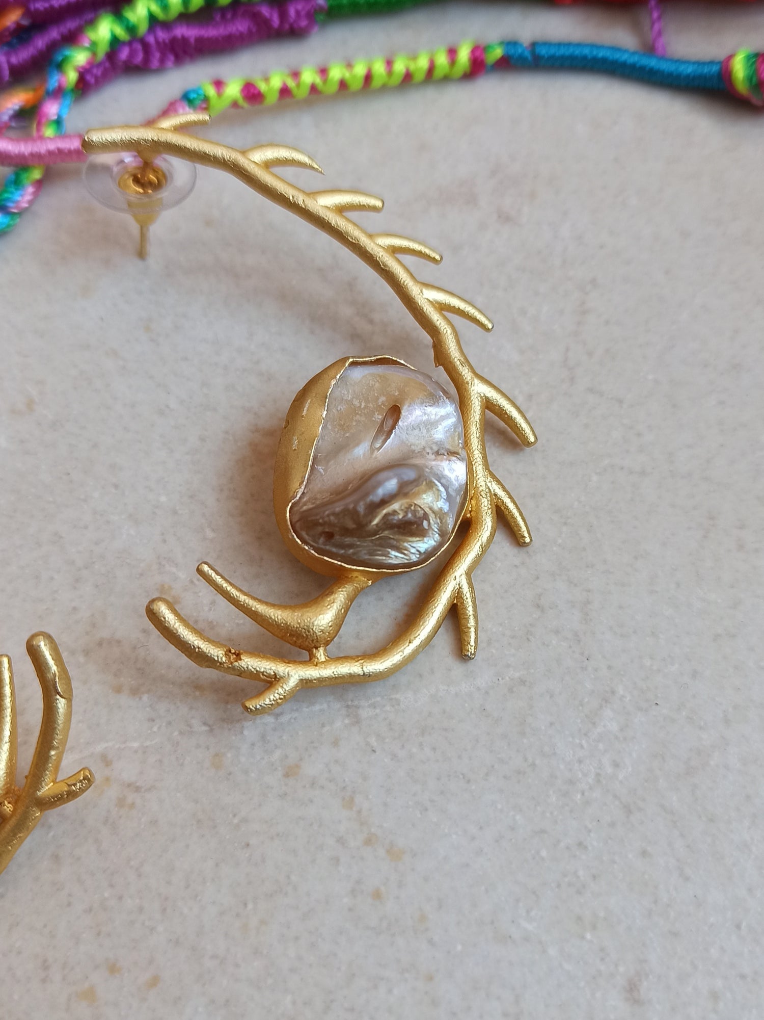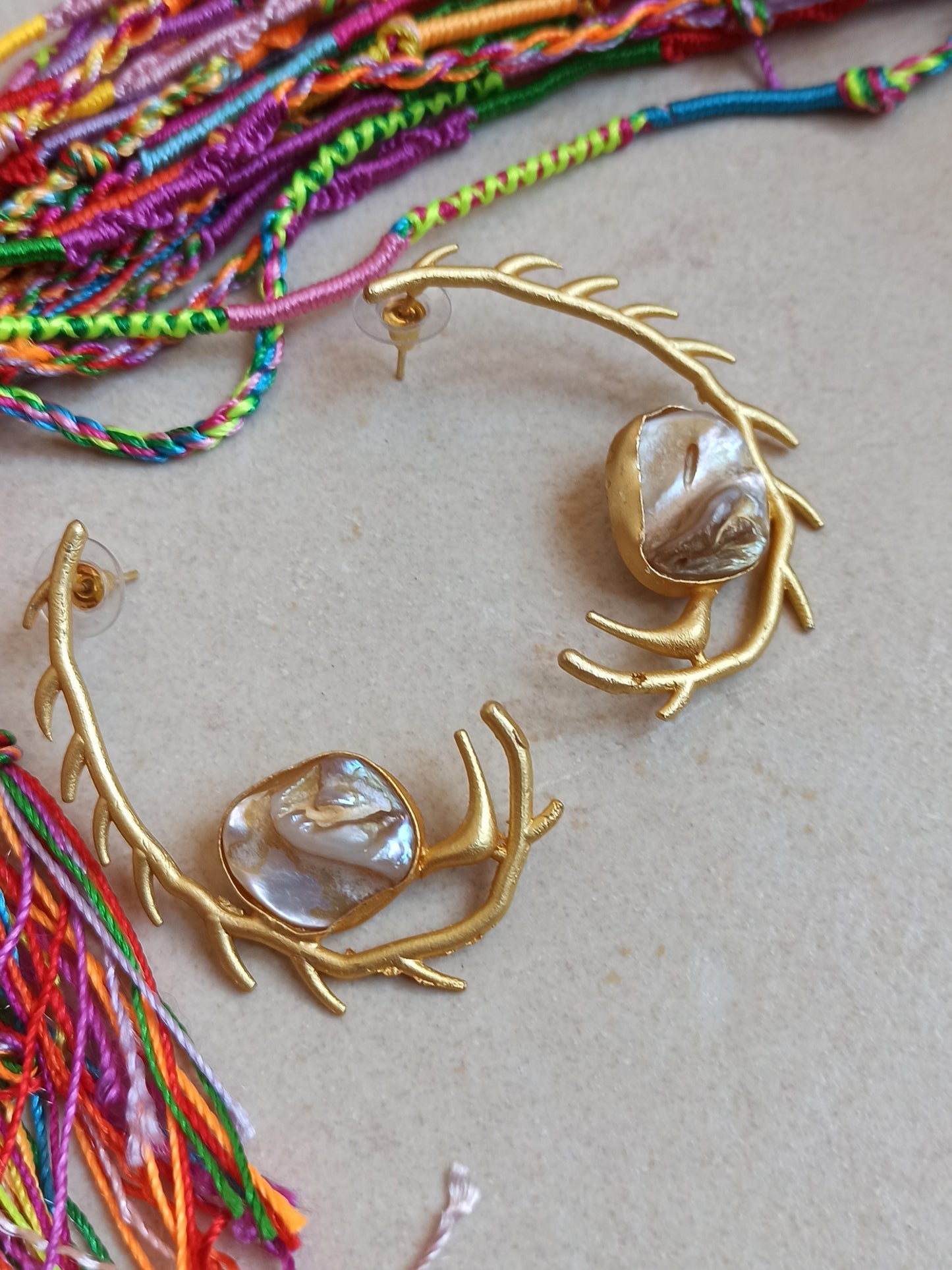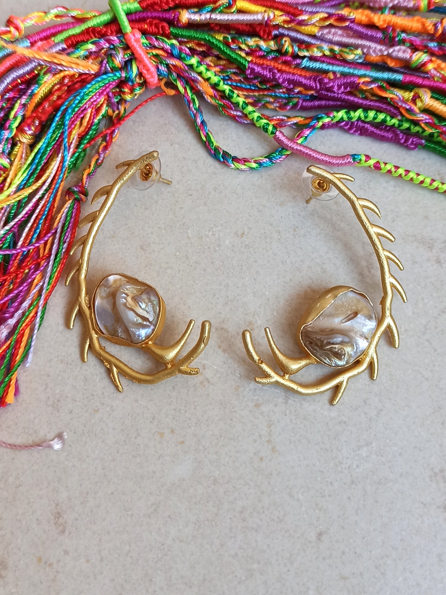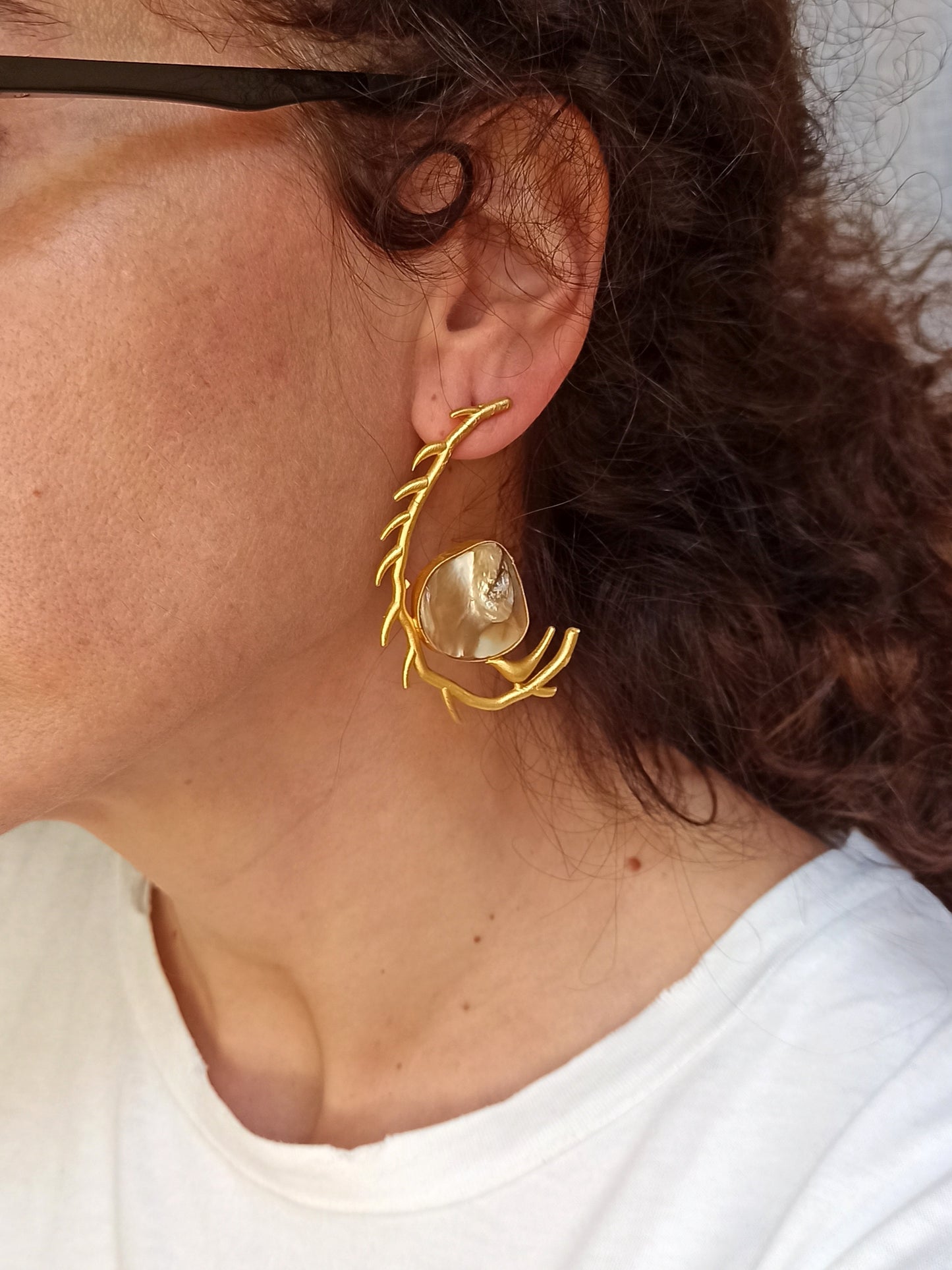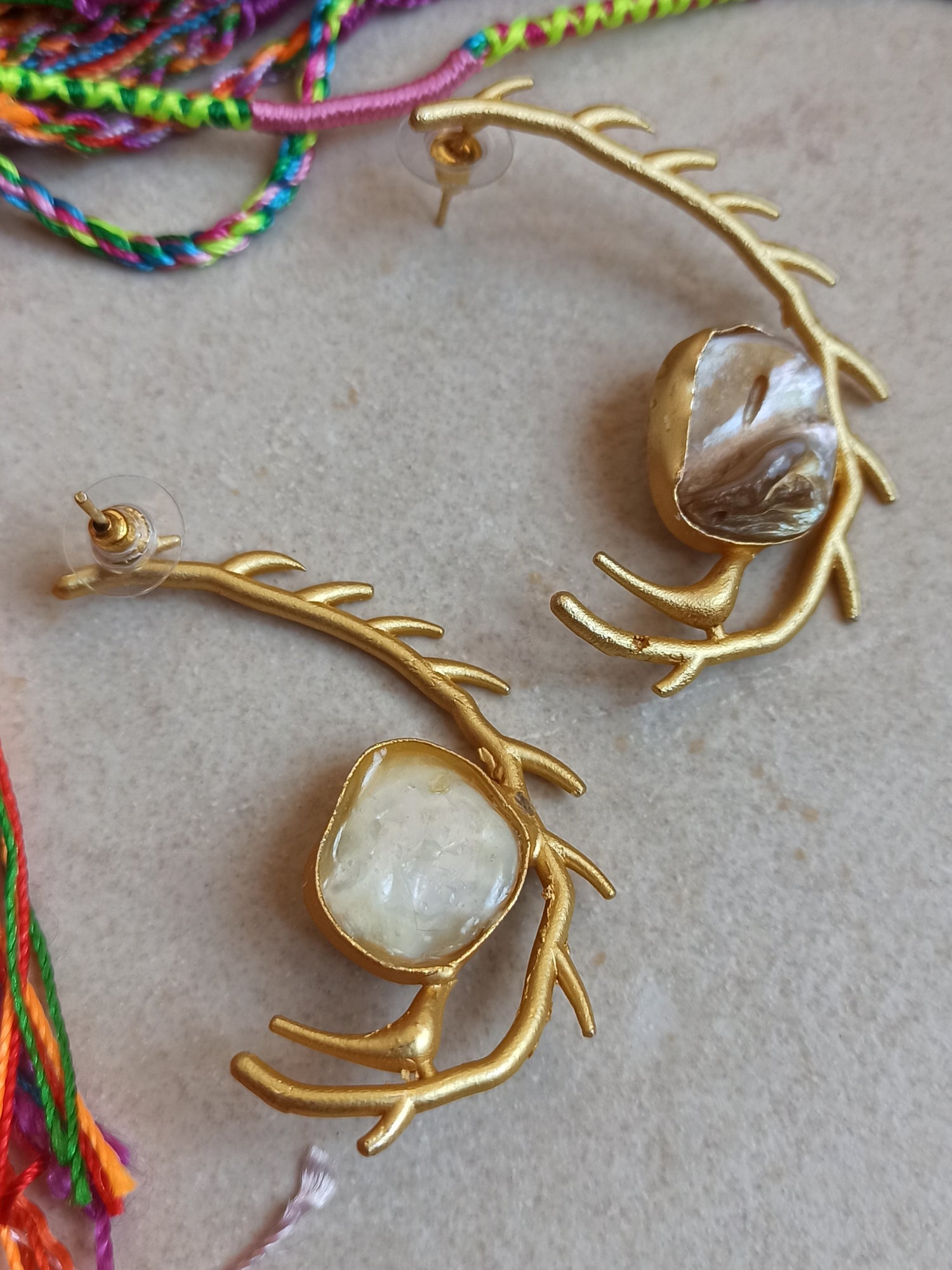 Golden metal alloy earrings with mother-of-pearl inserts.