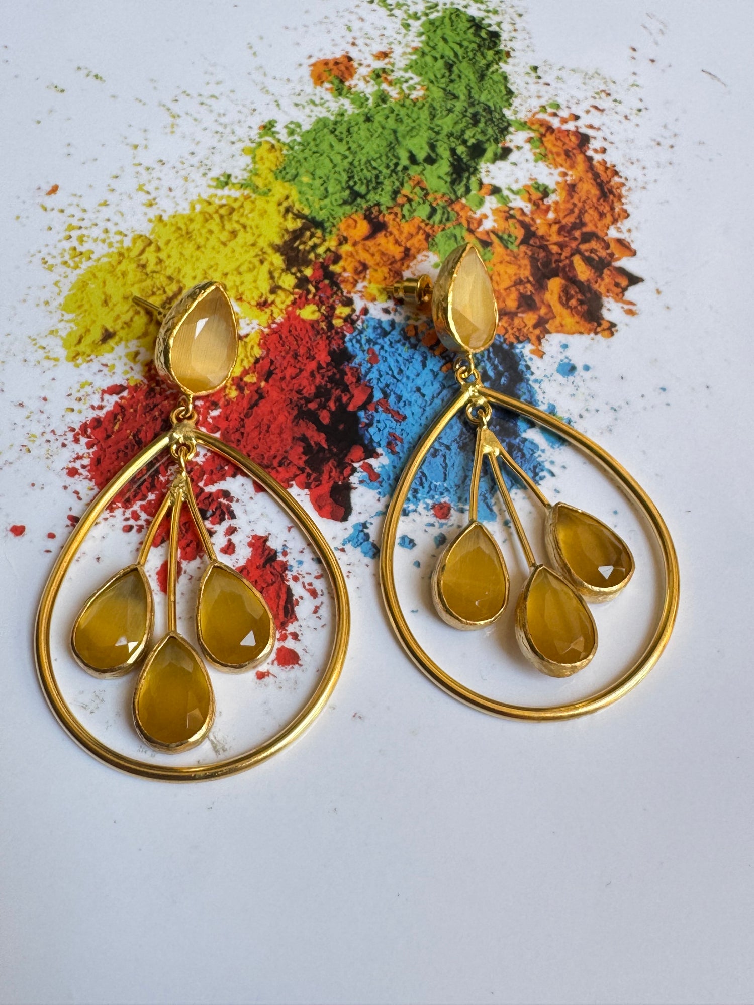 Hypoallergenic brass earrings with yellow cat's eye stones. Nickel-free. Length: 6.5 cm.
