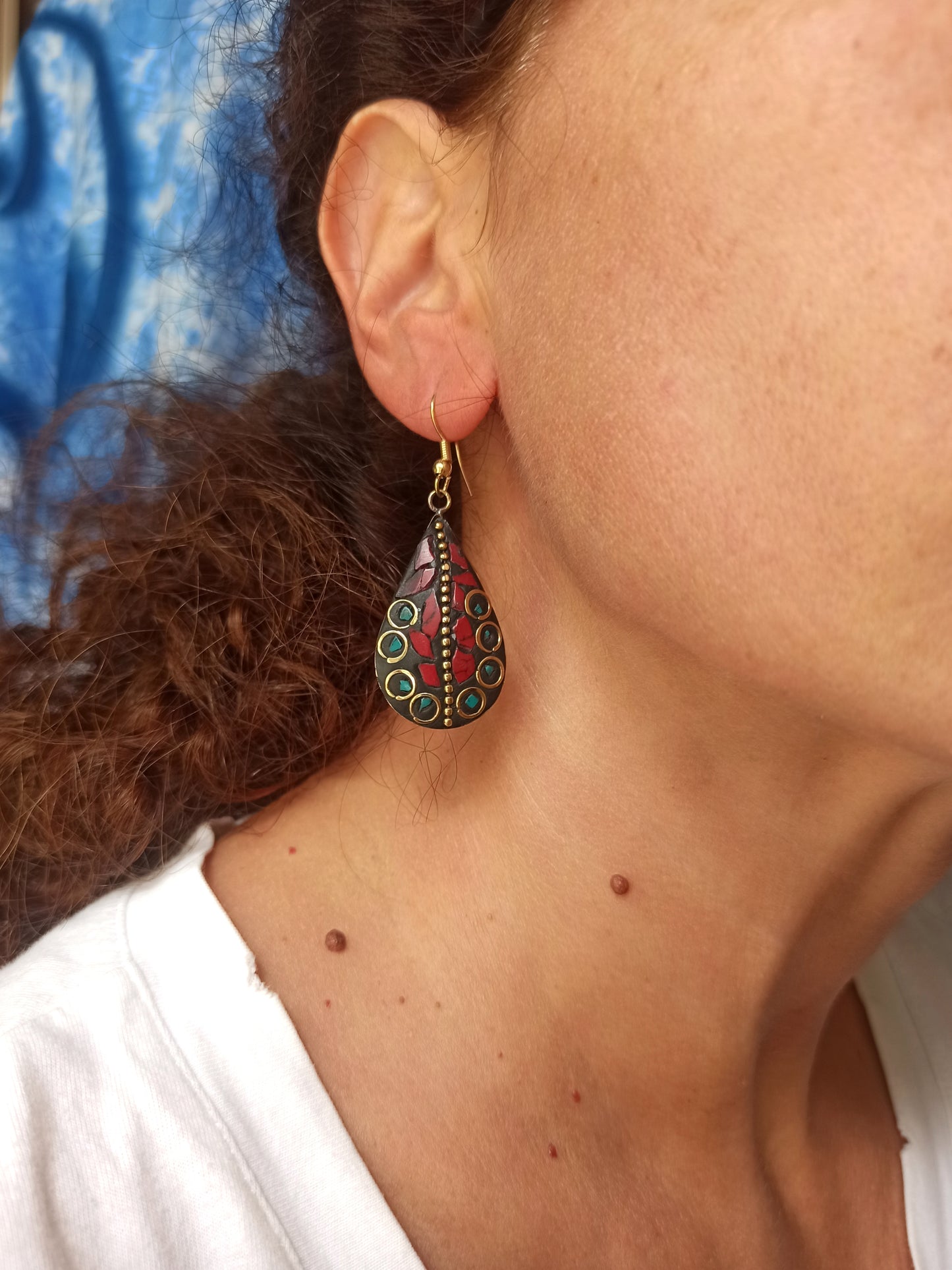 Golden metal earrings with red and turquoise chip mosaic worked according to the Nepalese tradition.