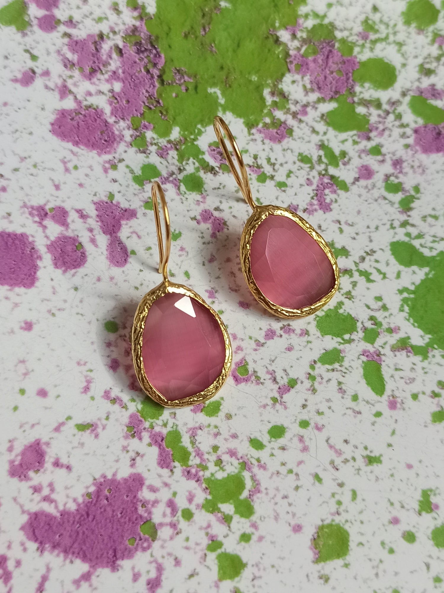 Hypoallergenic brass earrings with a cat's eye stone set by hand. Length approximately 3.5cm.
