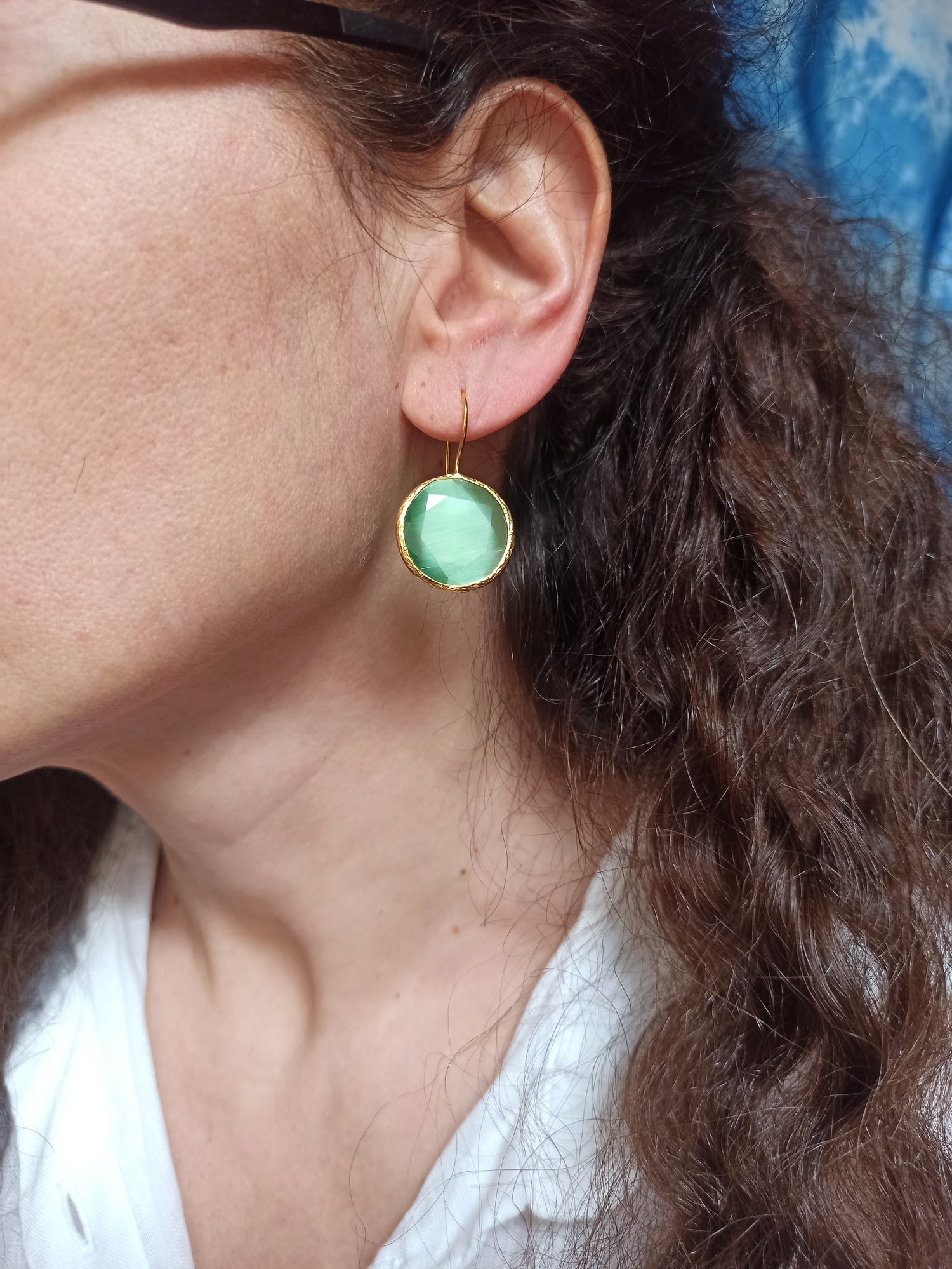 Hypoallergenic brass earrings with cat's eye stone. Length 3.5cm. Stone diameter 2cm.