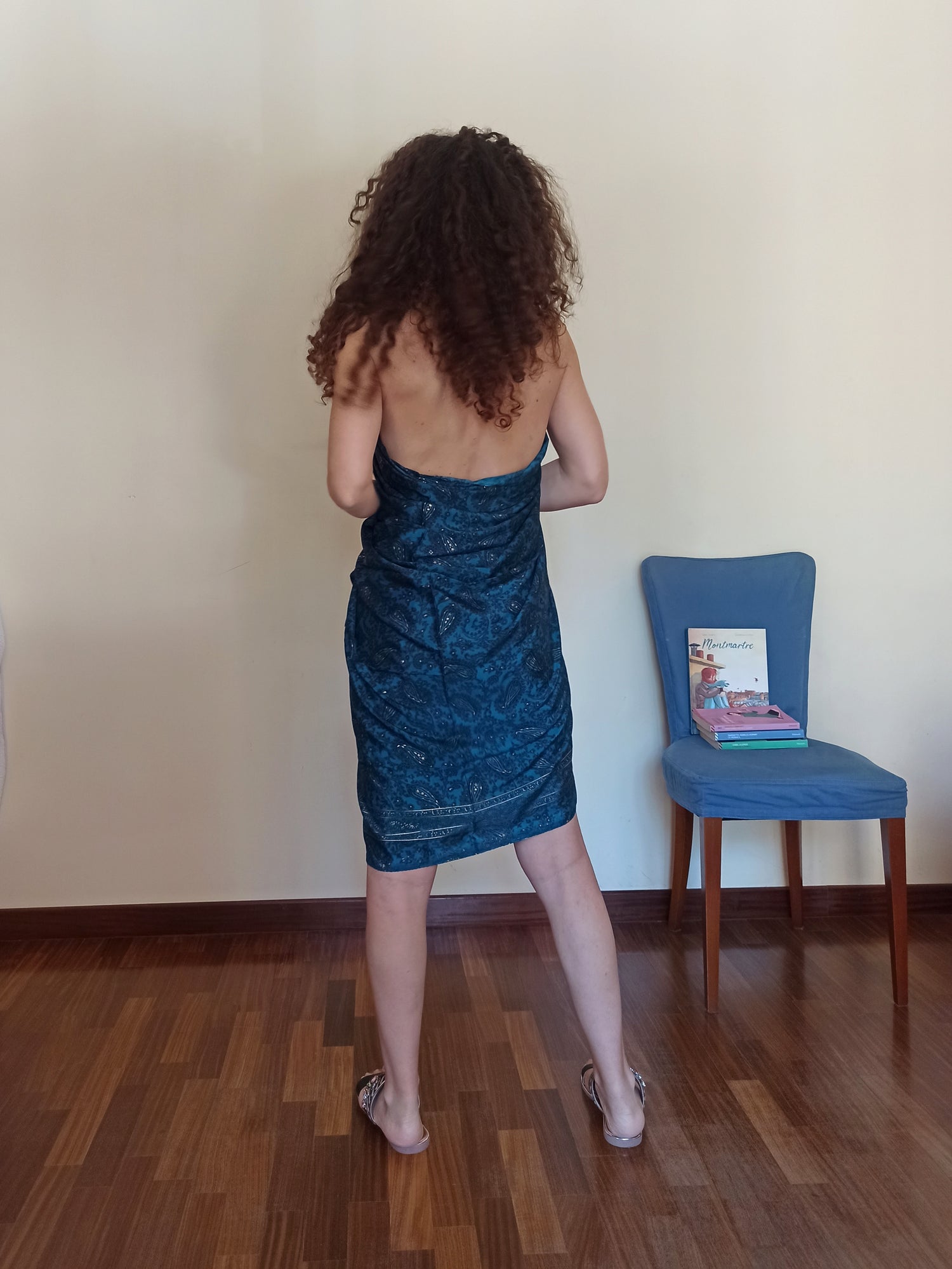 A refined piece that combines elegance and practicality, perfect for those seeking sophisticated style even in the most relaxed moments. The deep midnight blue background is enriched with a delicate tone-on-tone paisley print, enhanced by subtle gold inserts that give the fabric a luminous and precious effect.