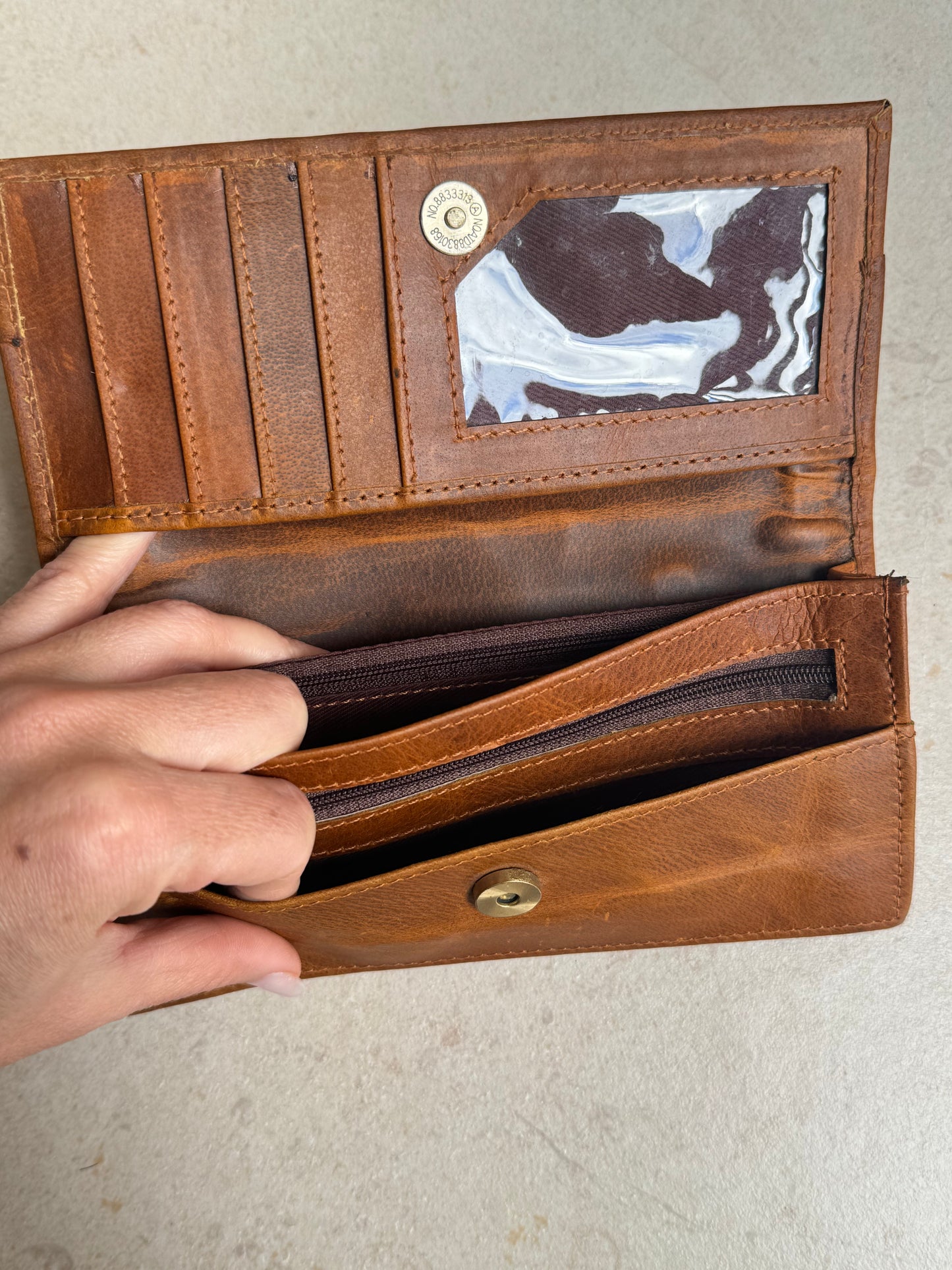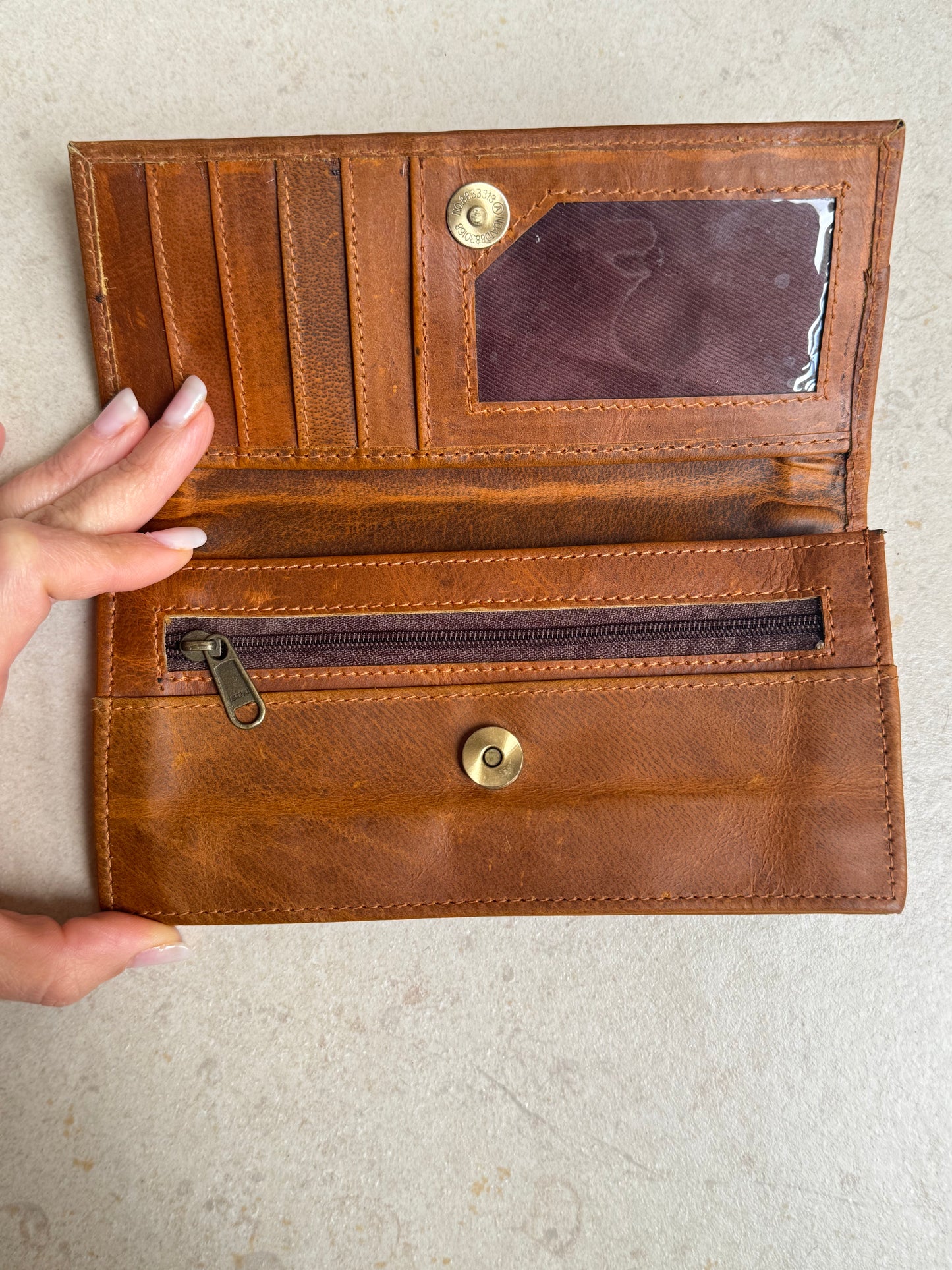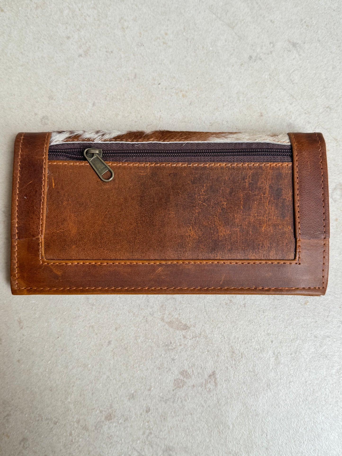 Hand-finished genuine leather wallet. Brown sheepskin flap. Super practical as it has numerous compartments.