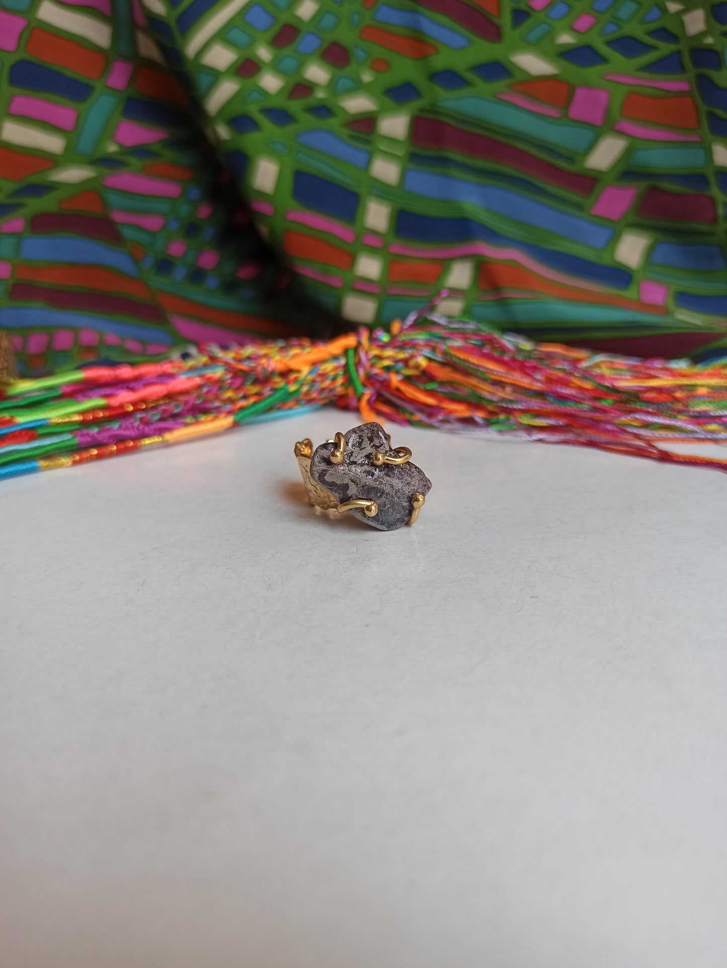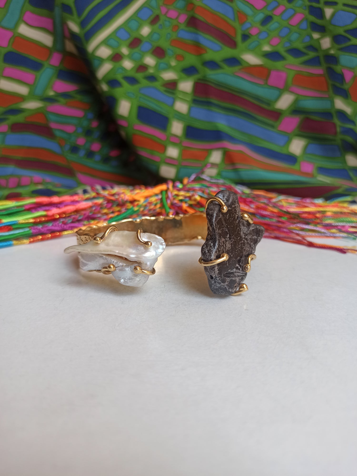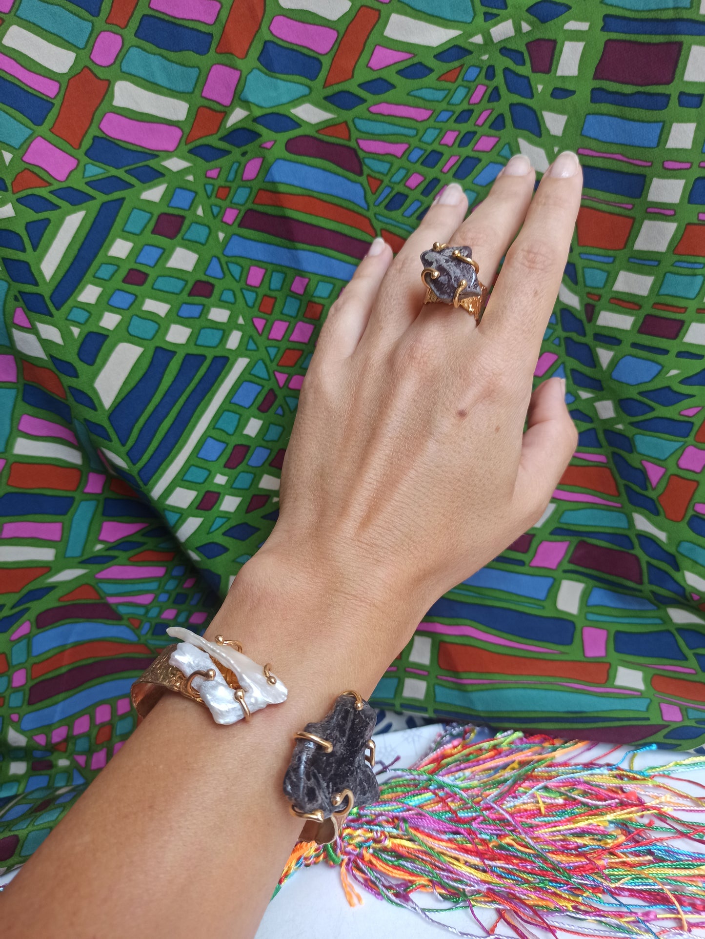 This spectacular set is composed of a bracelet and a ring in gold-plated metal alloy enriched with mother-of-pearl and an insert with shades of dark grey.