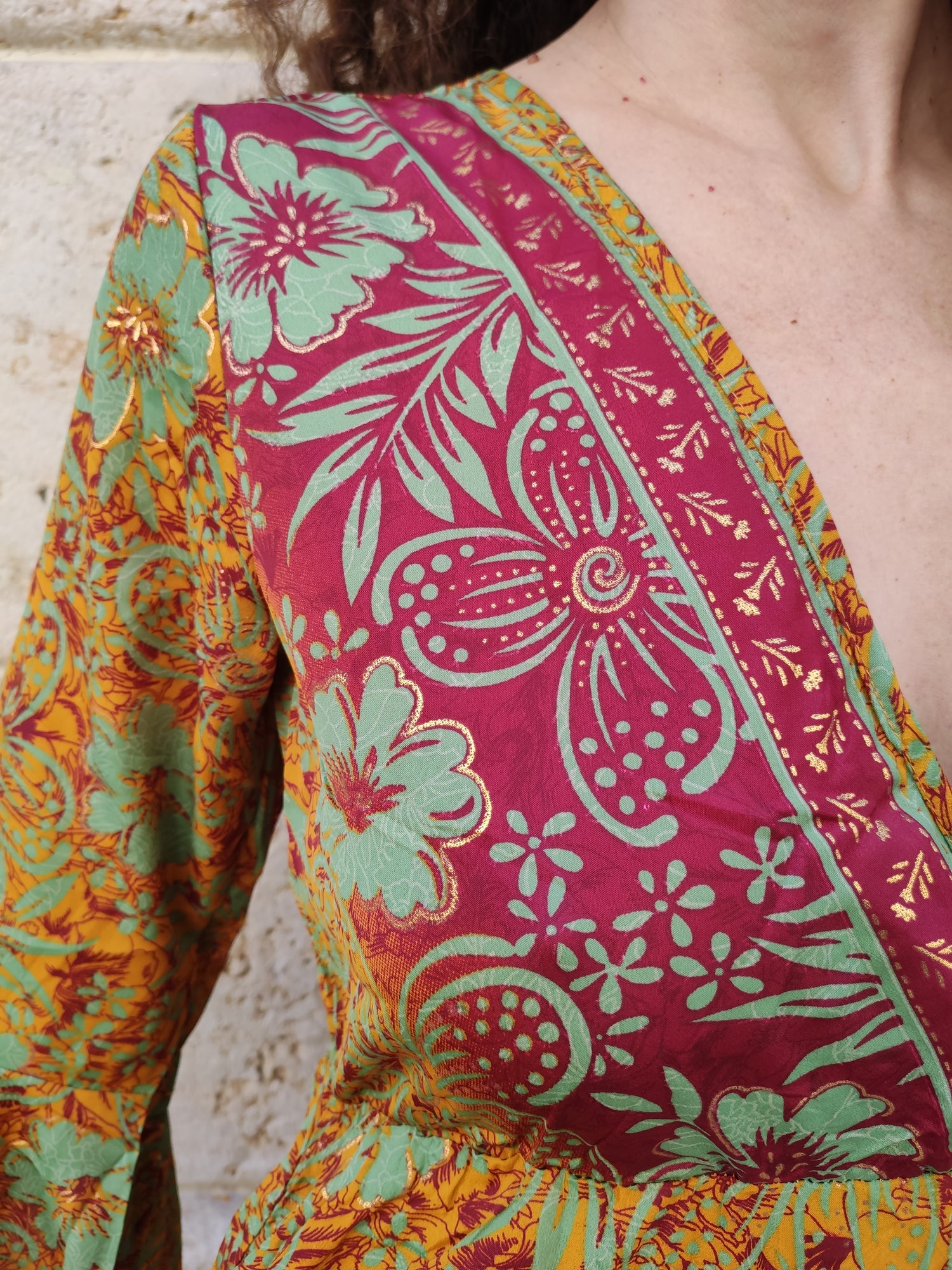Discover the timeless charm of our boho-chic dress: an explosion of warm colors and floral patterns that recall the authenticity of ethnic craftsmanship. Made of light and fluid fabric, it features a bodice with a crossed V-neckline and bell sleeves, which give movement and femininity. The contrast between the burgundy top with floral motifs and the full skirt with a green and orange background creates a unique and vibrant look.