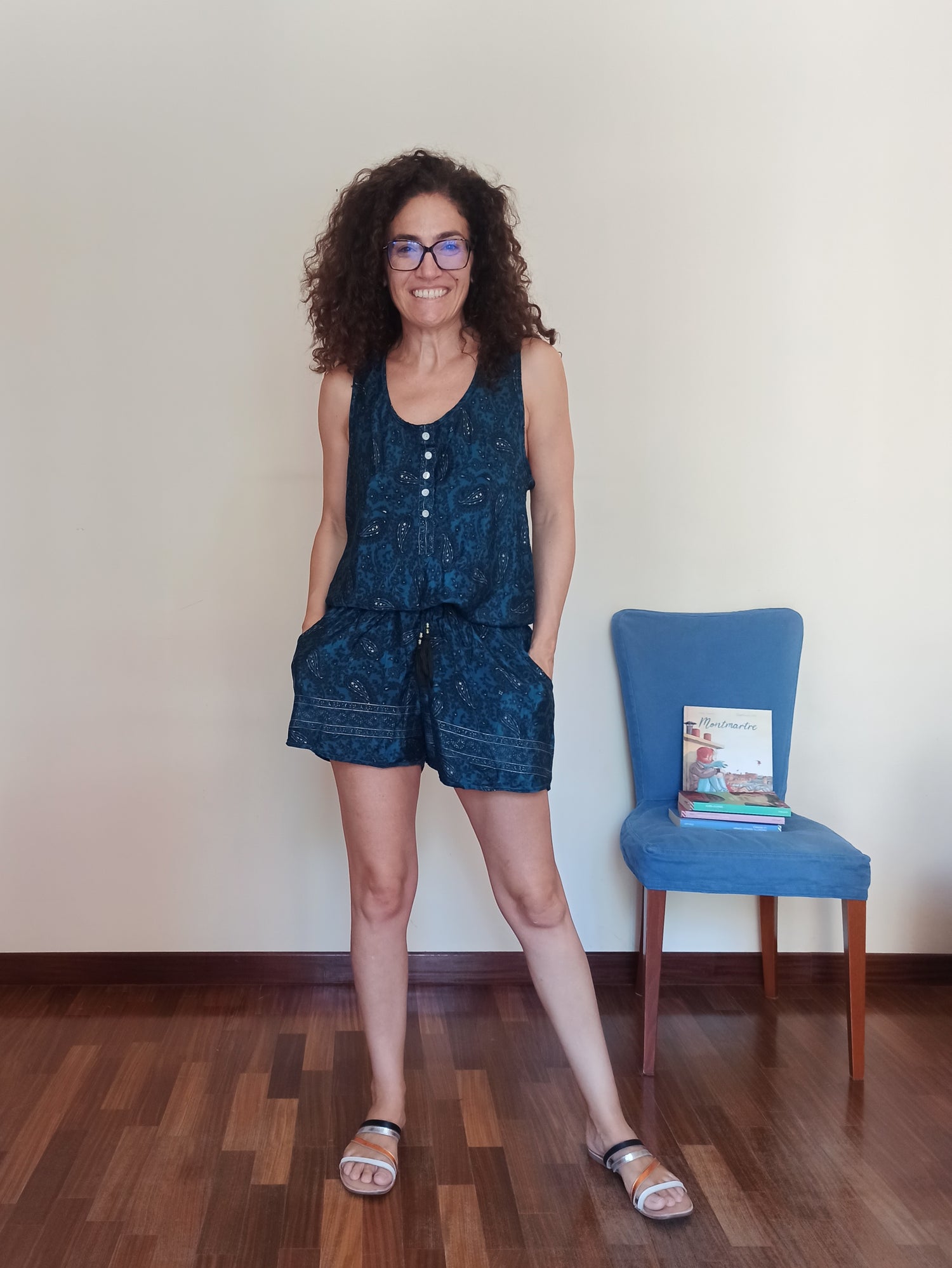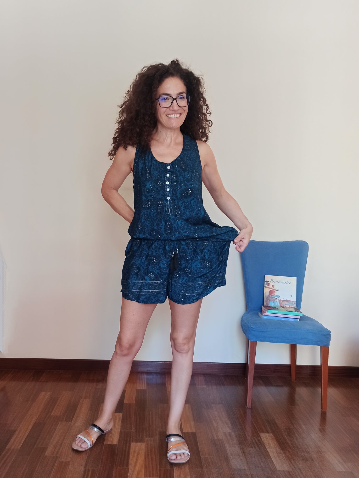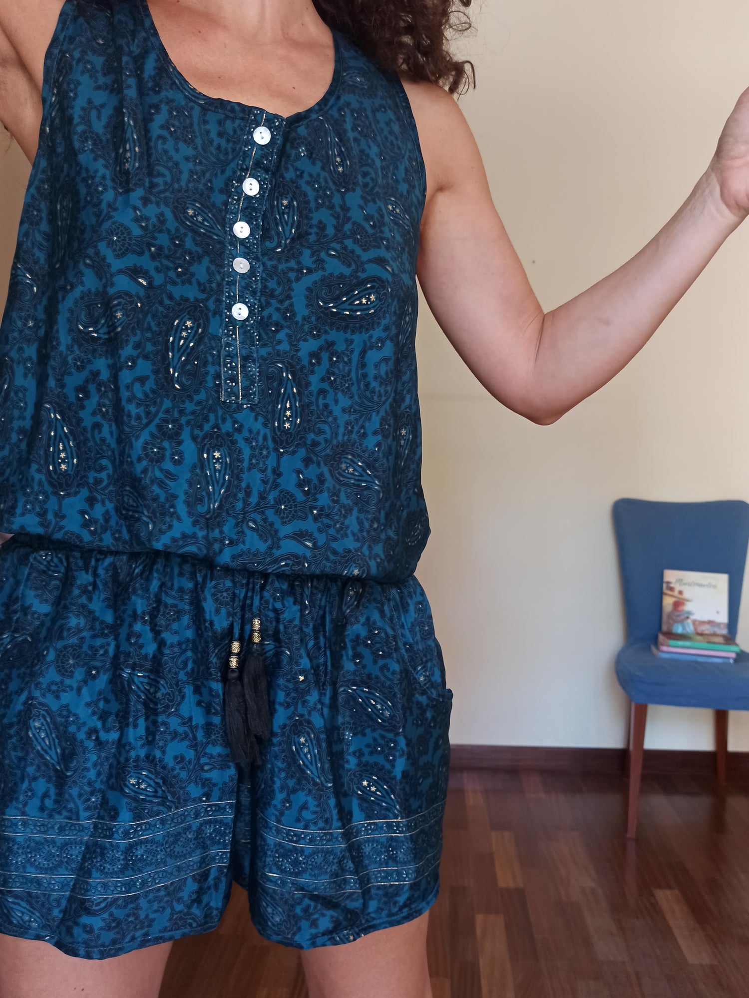 This short jumpsuit is the perfect choice for embracing summer with style and ease. It's made from a soft, cool fabric. The deep midnight blue background is embellished with a delicate tone-on-tone paisley print, enhanced by subtle gold inserts that give the fabric a luminous, luxurious look. The sleeveless cut and round neckline with buttons create a clean, youthful silhouette, ideal for warmer days.