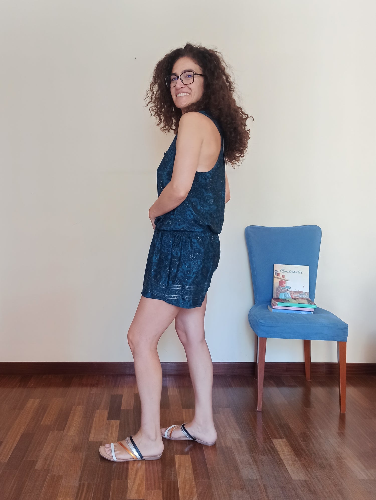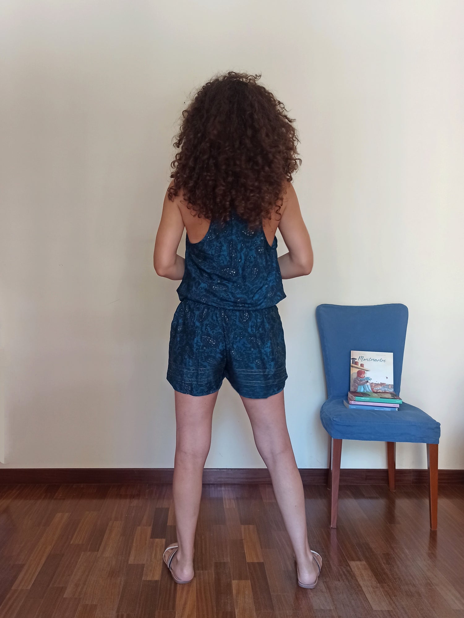 The elastic waistband allows you to adjust the fit as needed, naturally flattering your silhouette. The bottoms of the shorts are finished with a delicate decorative trim that matches the main motif, adding a refined touch to the design. Practical and comfortable thanks to the side pockets, this jumpsuit is easy to pair with sandals or espadrilles for a fresh and carefree outfit.