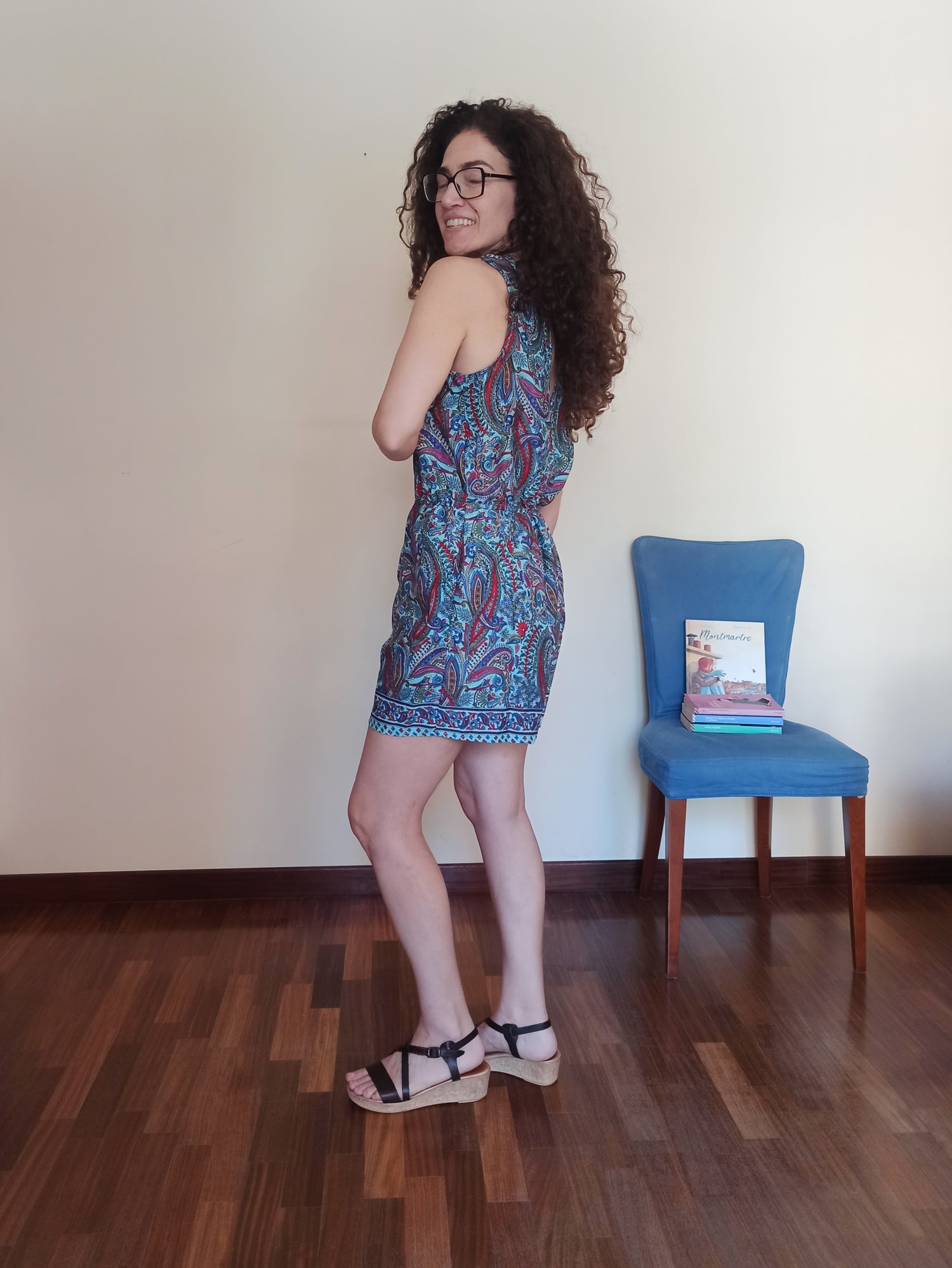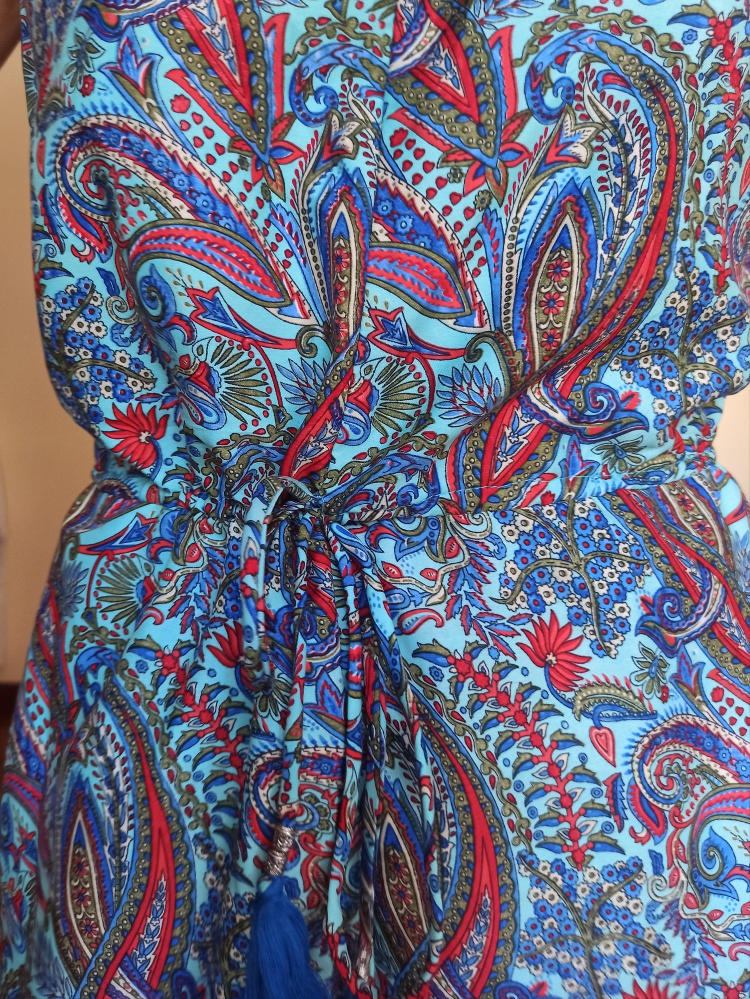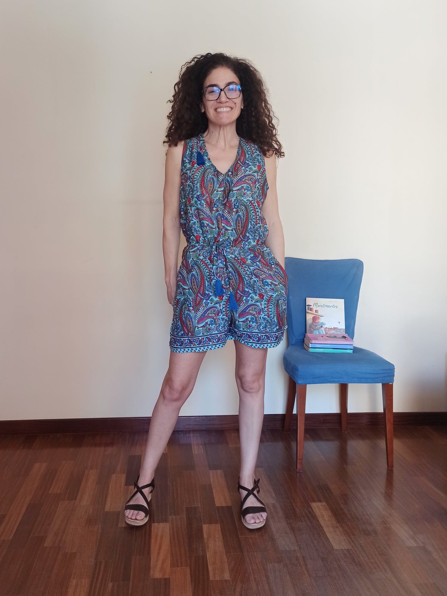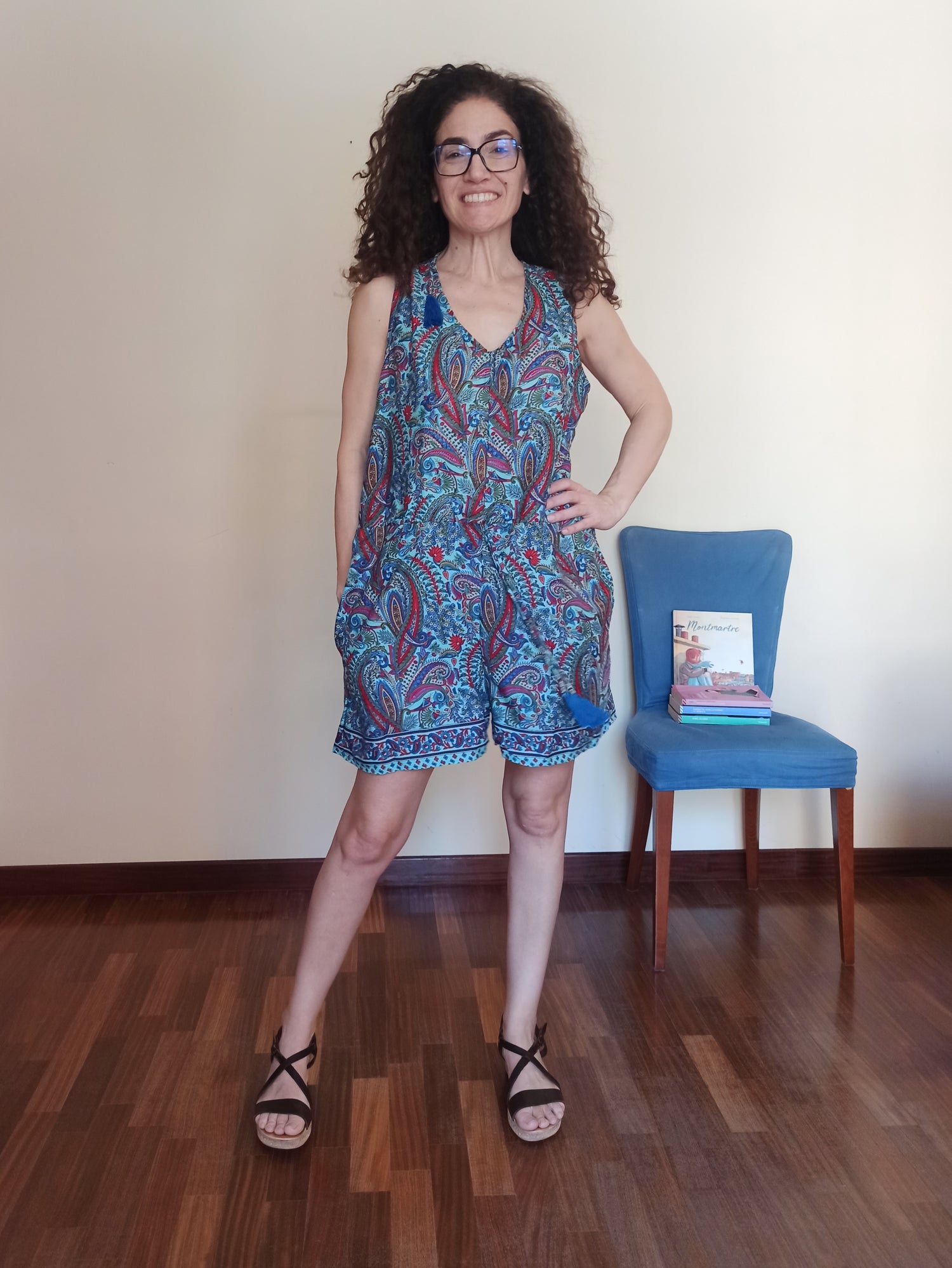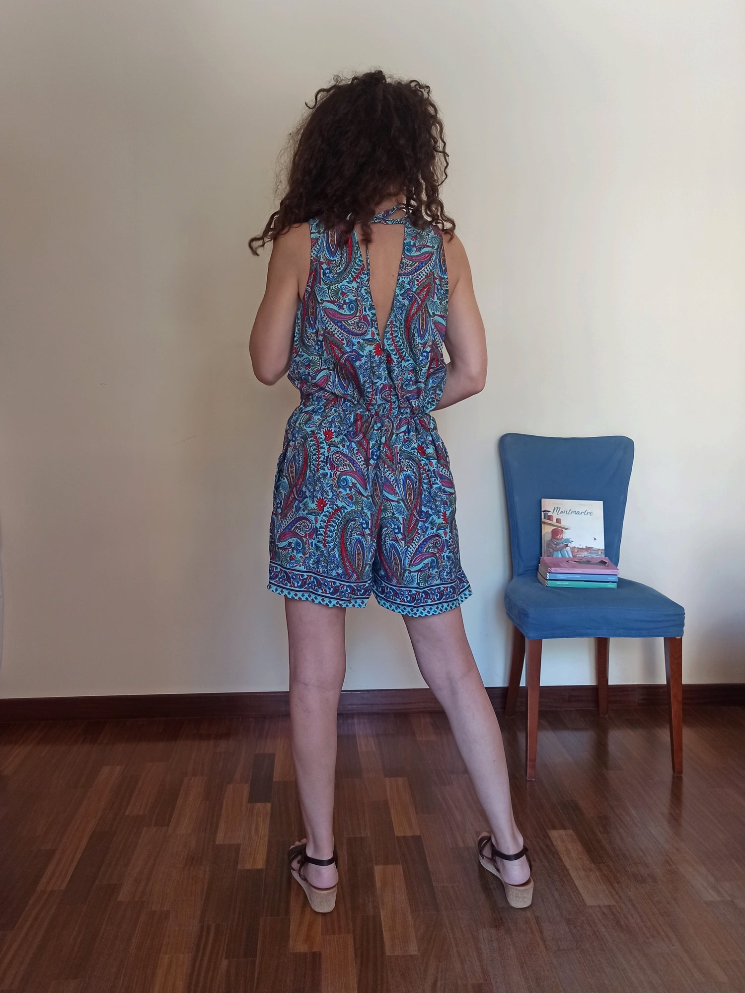 This short jumpsuit is the perfect choice for embracing summer with style and ease. Crafted from a soft, cool fabric, it features a vibrant paisley pattern in shades of blue, red, and green, adding character and originality to the look. The sleeveless cut and V-neck create a clean, airy silhouette, ideal for warmer days.