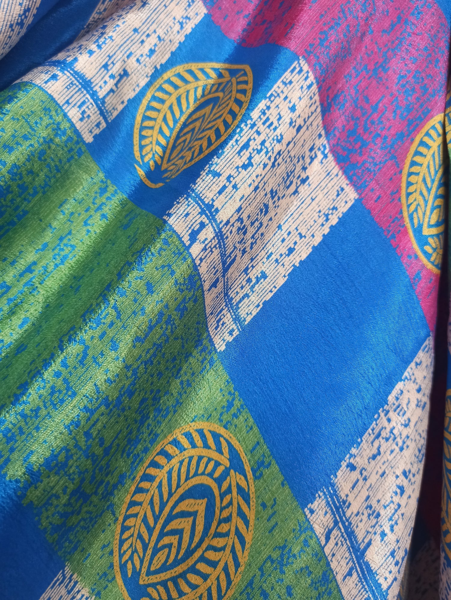 This long dress is a celebration of summer, with its vibrant color palette and vibrant details that instantly convey energy and cheer. Crafted from a light and airy fabric, it stands out for its vibrant shades of blue, emerald green, and purple, interspersed with ethnic motifs reminiscent of distant cultures and seascapes. The deep, feminine V-neckline, along with the tie at the back, enhances the silhouette, lending a sense of elegance and movement.