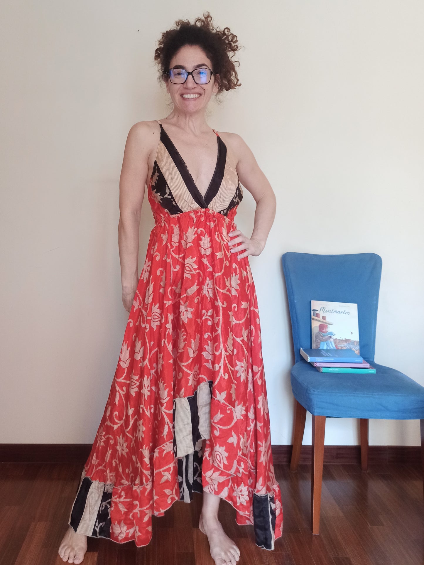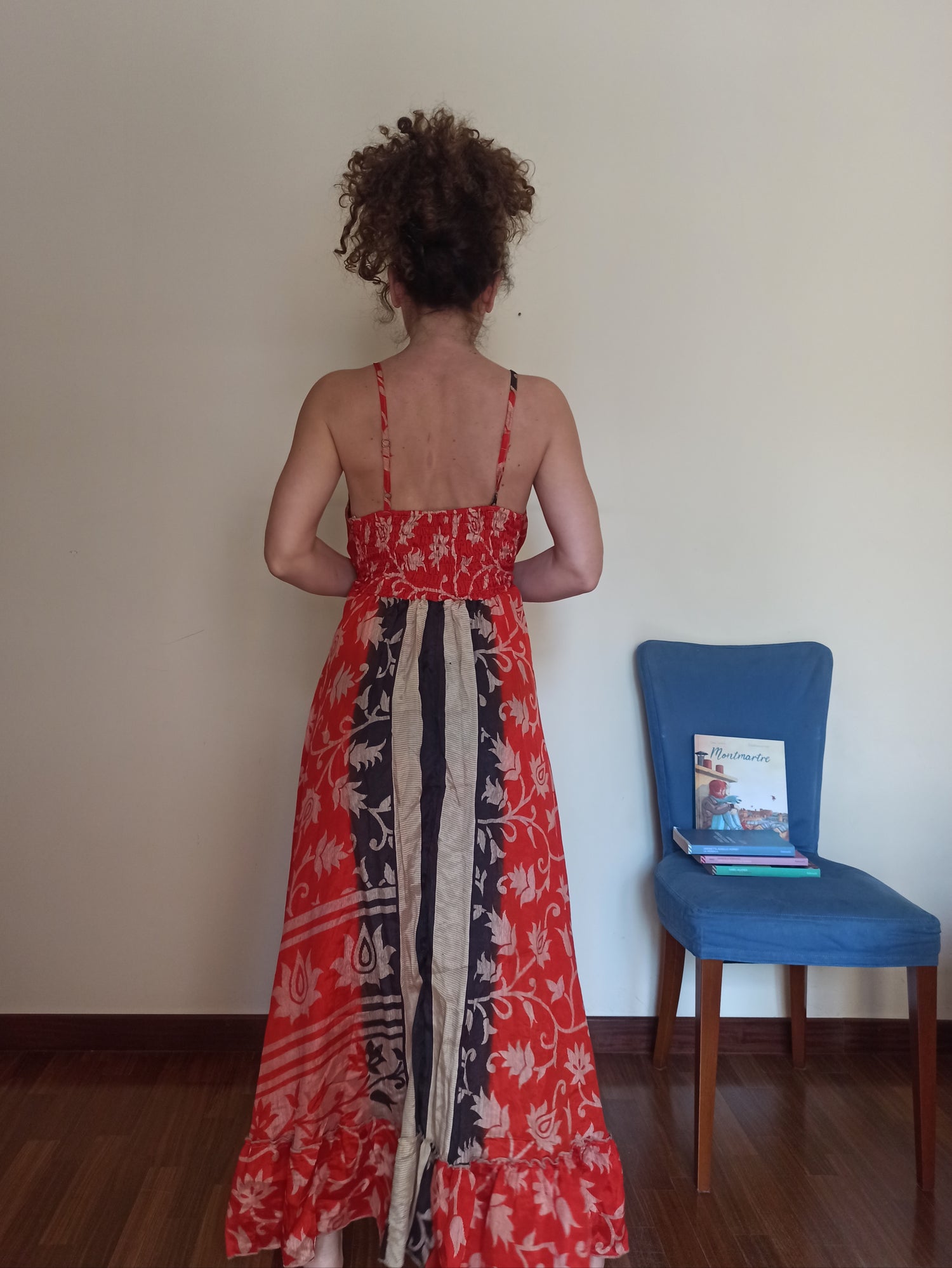 Flared dress with ruffles, adjustable thin straps and wide neckline at the back.