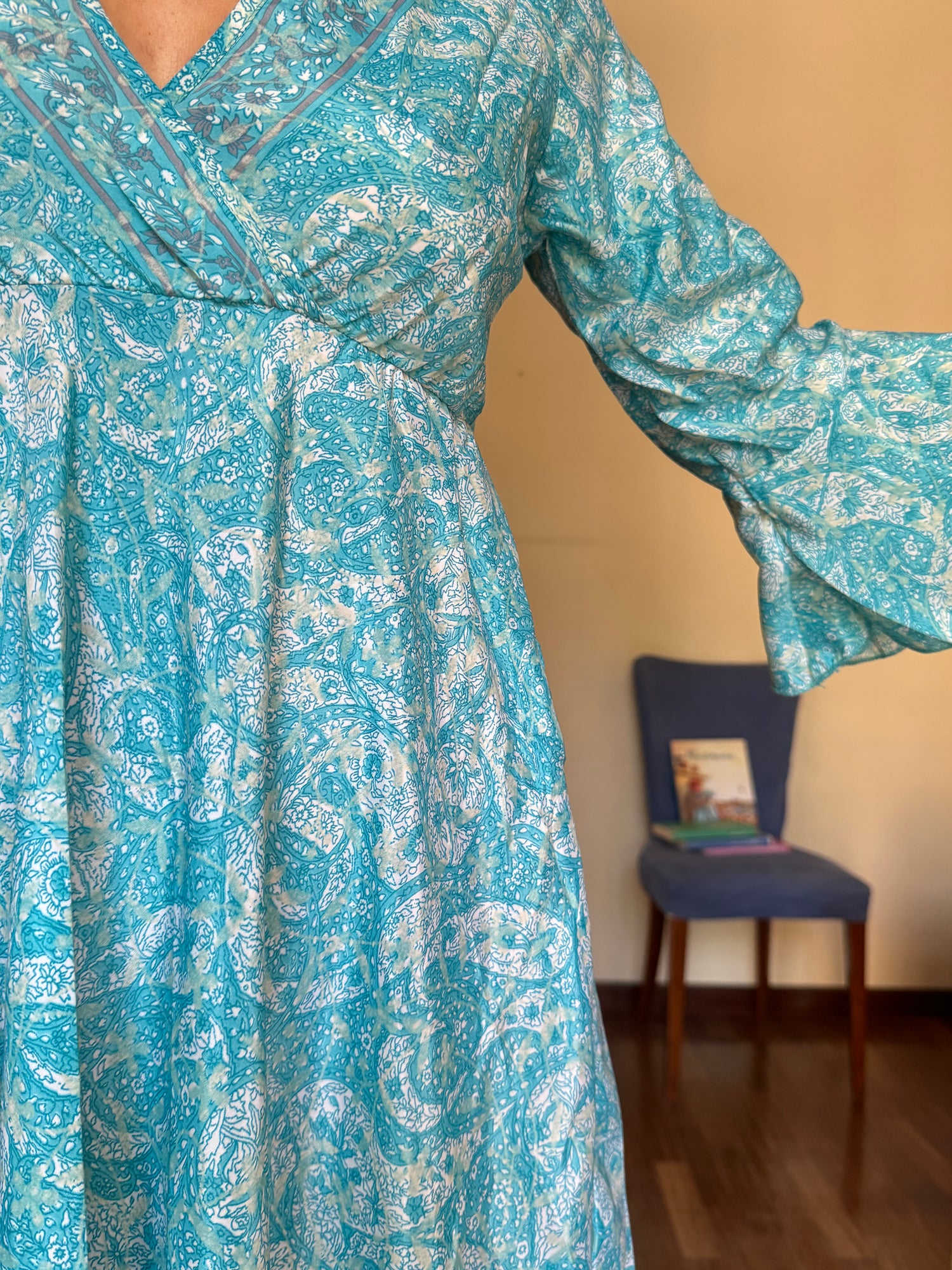 The crossed V-neck bodice adds depth and character to the entire look. The slightly flared three-quarter sleeves add a romantic touch, while the long, full skirt falls softly, creating harmonious movement with every step. A perfect dress for both day and night, to feel feminine, free, and radiant on every occasion.