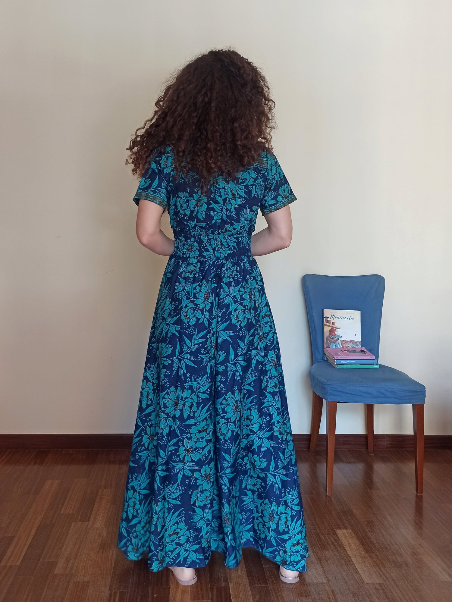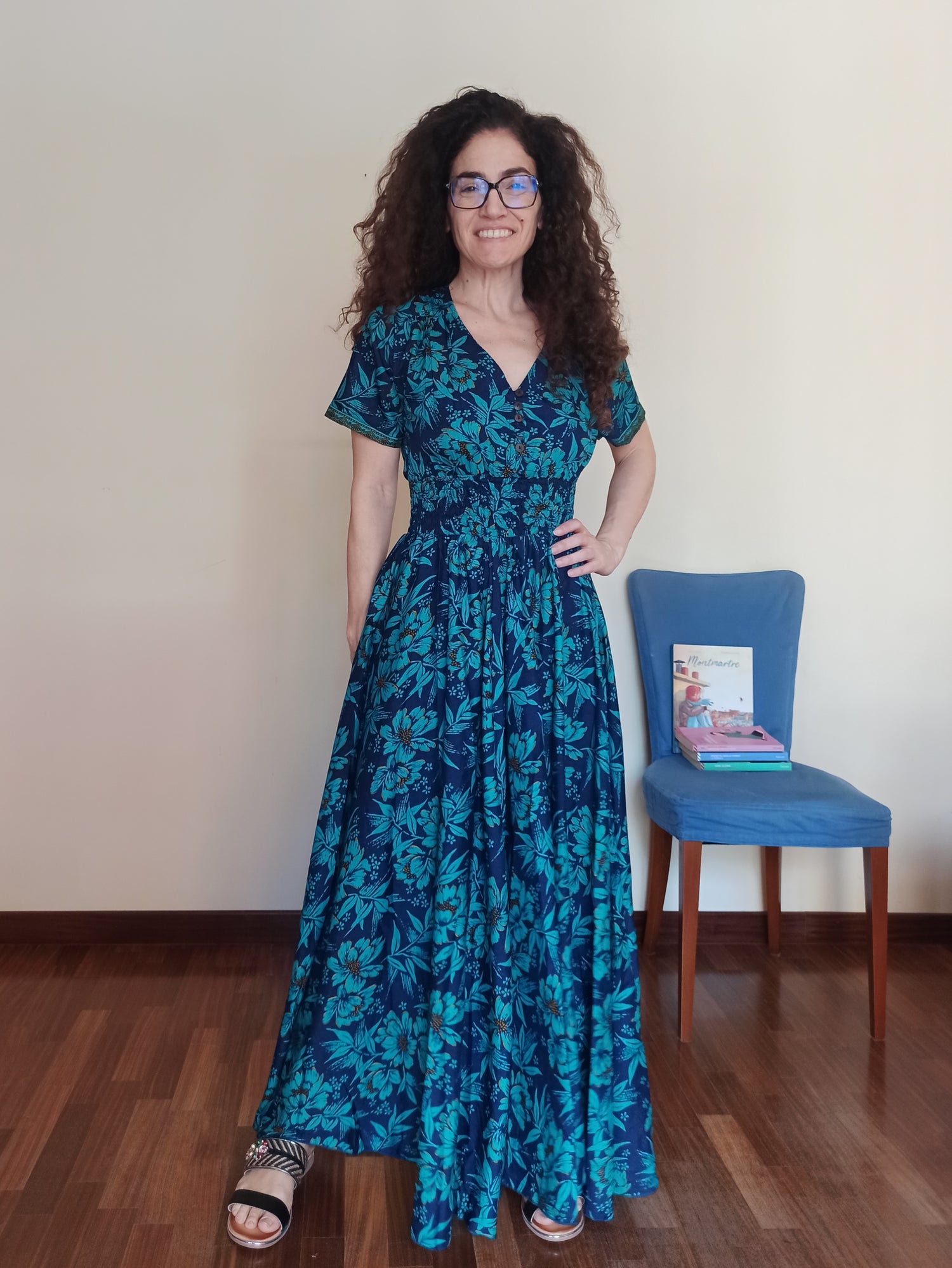 This long dress, with its vibrant floral pattern in shades of blue and turquoise, is the perfect choice for those seeking a comfortable yet refined look. The design is carefully crafted to naturally accentuate your curves, thanks to the gathered waist and loose-fitting skirt.