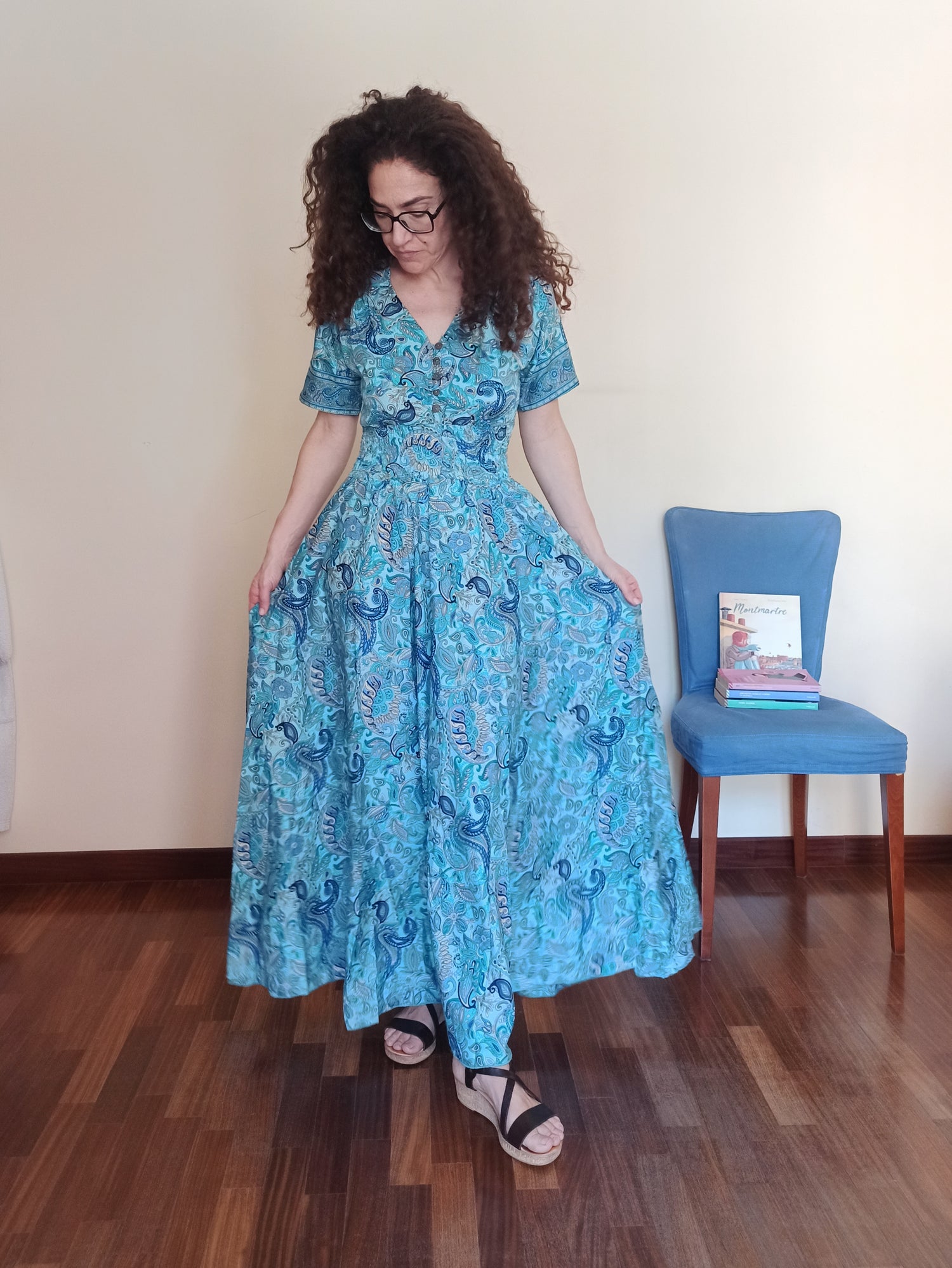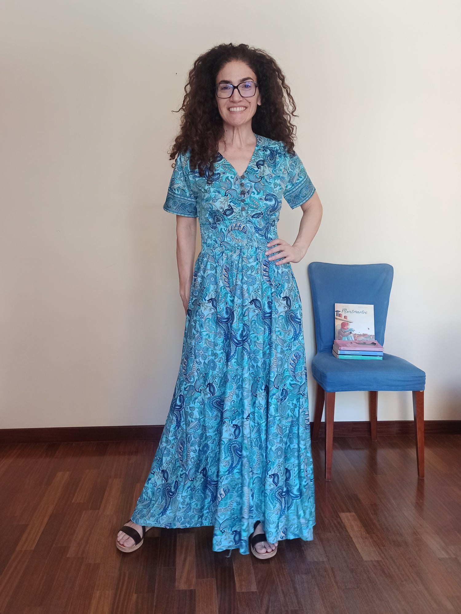 This long dress, embellished with a vibrant floral motif in shades of blue and turquoise, perfectly balances comfort and style. The design is designed to naturally flatter the figure: the fitted bodice with elasticated gathers at the waist accentuates the silhouette without constricting, while the soft line of the long skirt adds movement and elegance to every step.