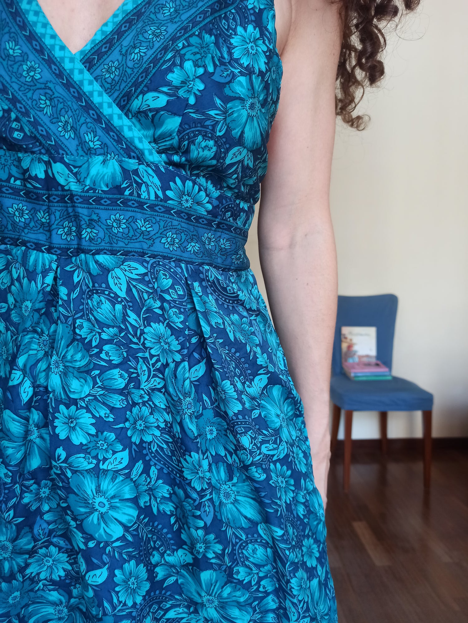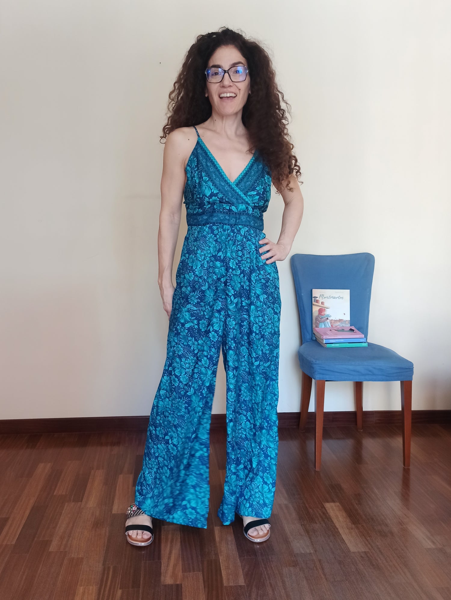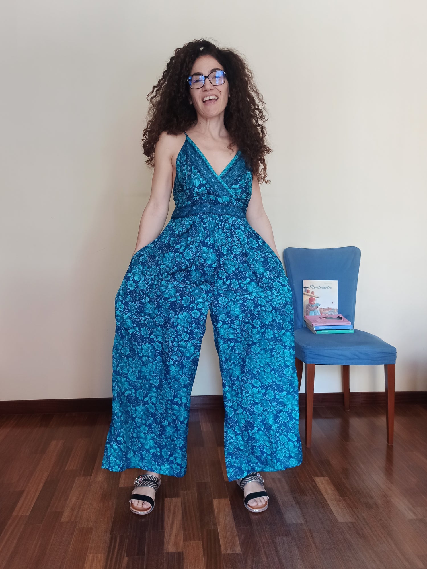 This jumpsuit is an ode to summer and freedom of movement, perfect for those seeking a fresh, dynamic, and sensual style without sacrificing comfort. The lightweight, flowing fabric features a vibrant floral pattern in shades of turquoise and blue, lending depth and vitality to the piece. The wrap-around bodice with a V-neckline accentuates the décolleté, while the cinched waist creates a balanced silhouette that slims the figure.