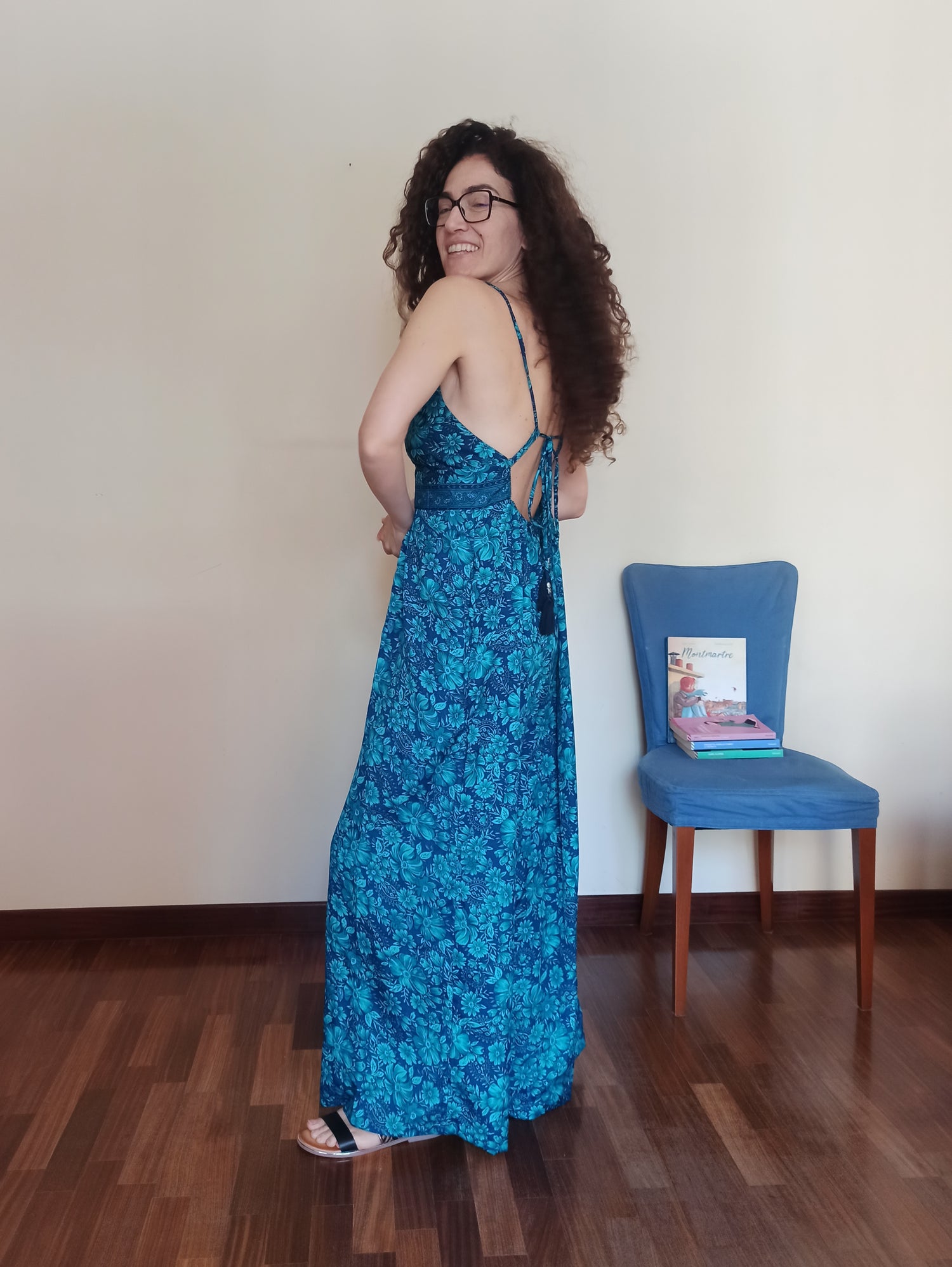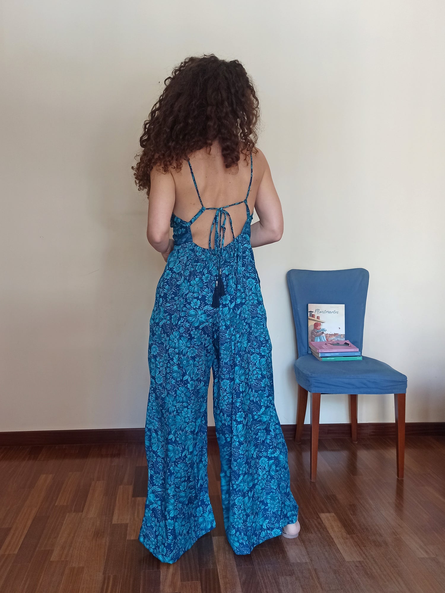 At the back, the design becomes even more interesting with a refined interweaving of thin straps that tie in a central knot, leaving the back elegantly exposed. The wide, flowing legs add a touch of glamour and boho, perfect for dancing at sunset or strolling along the seafront.