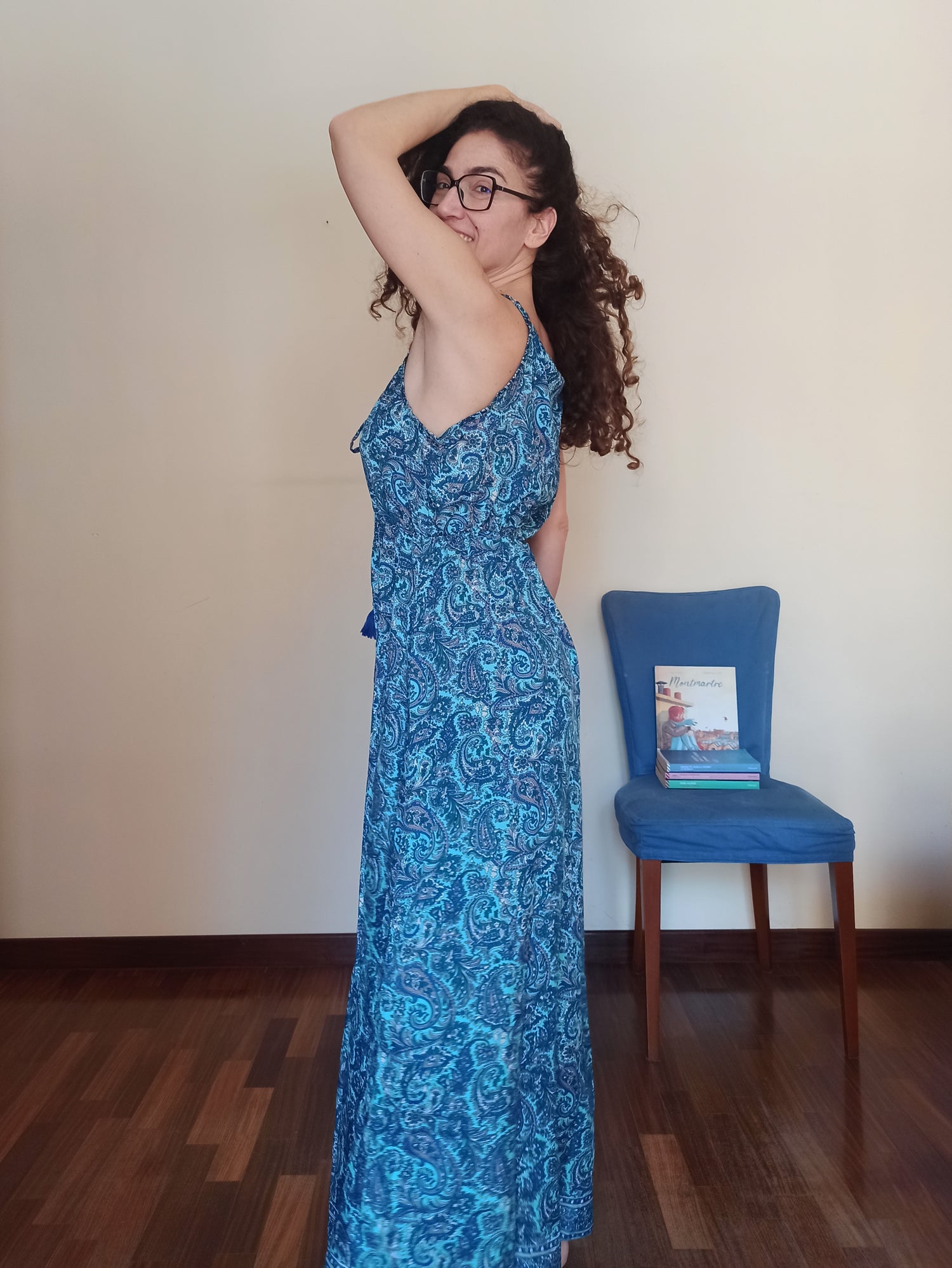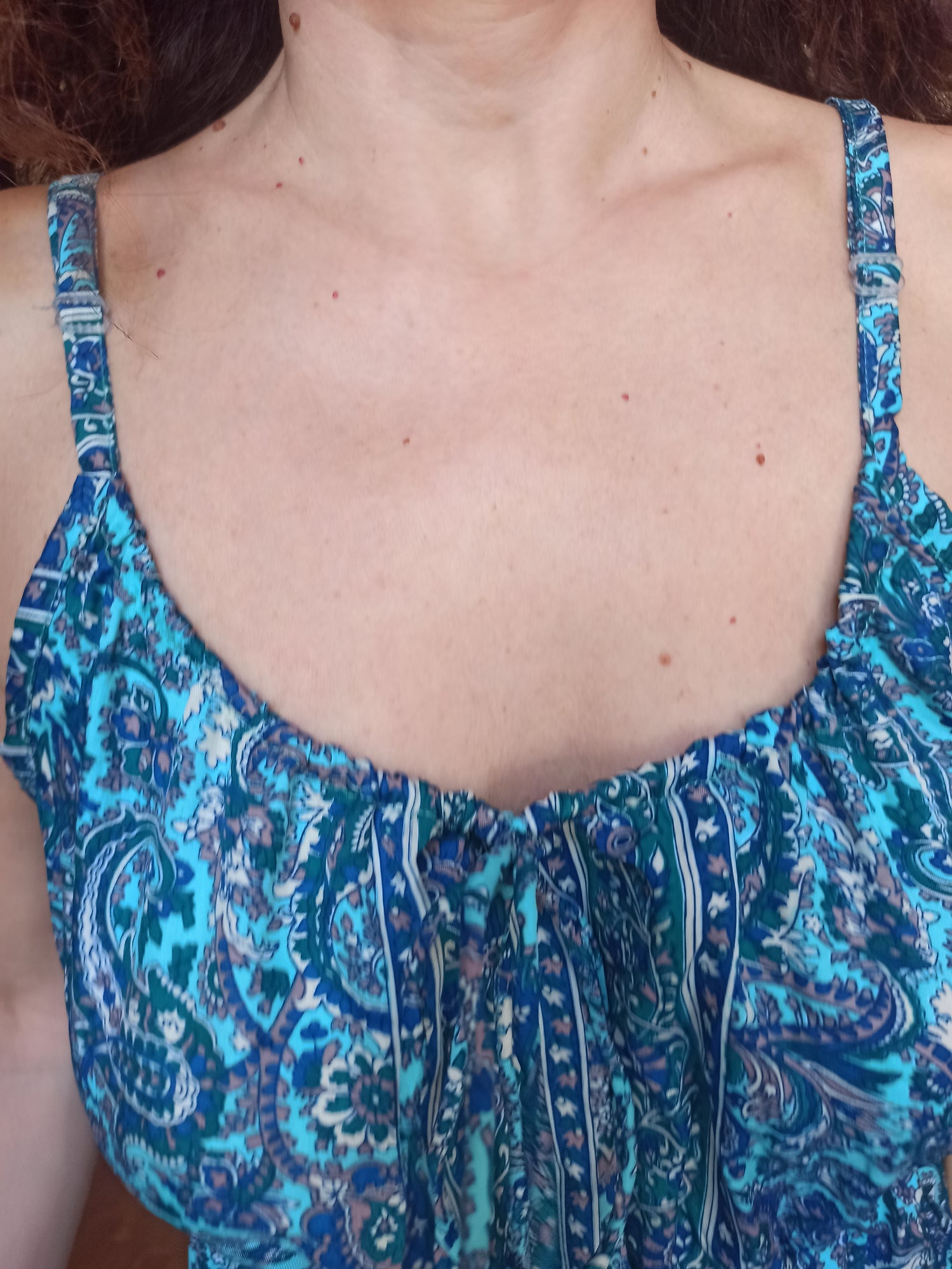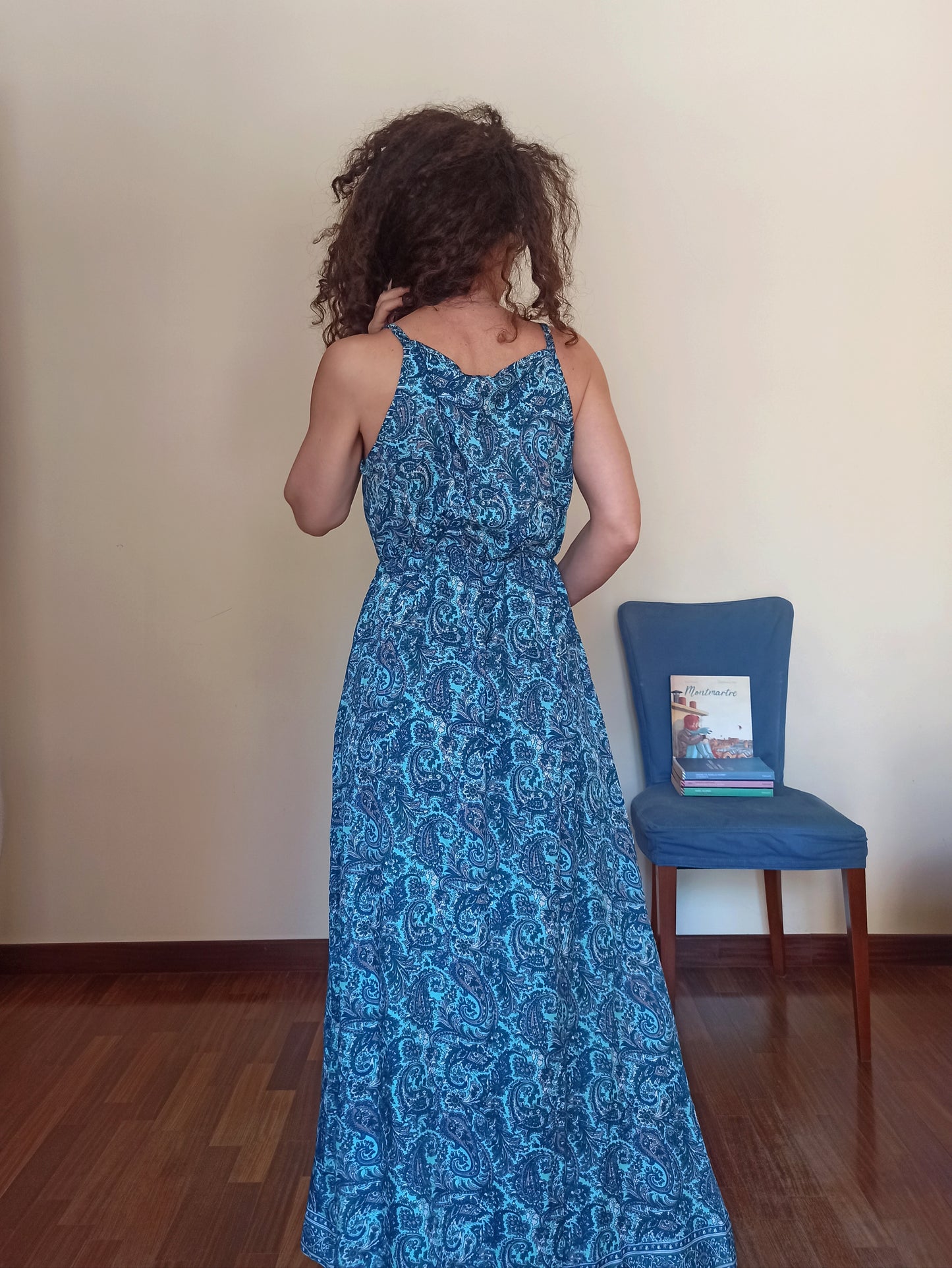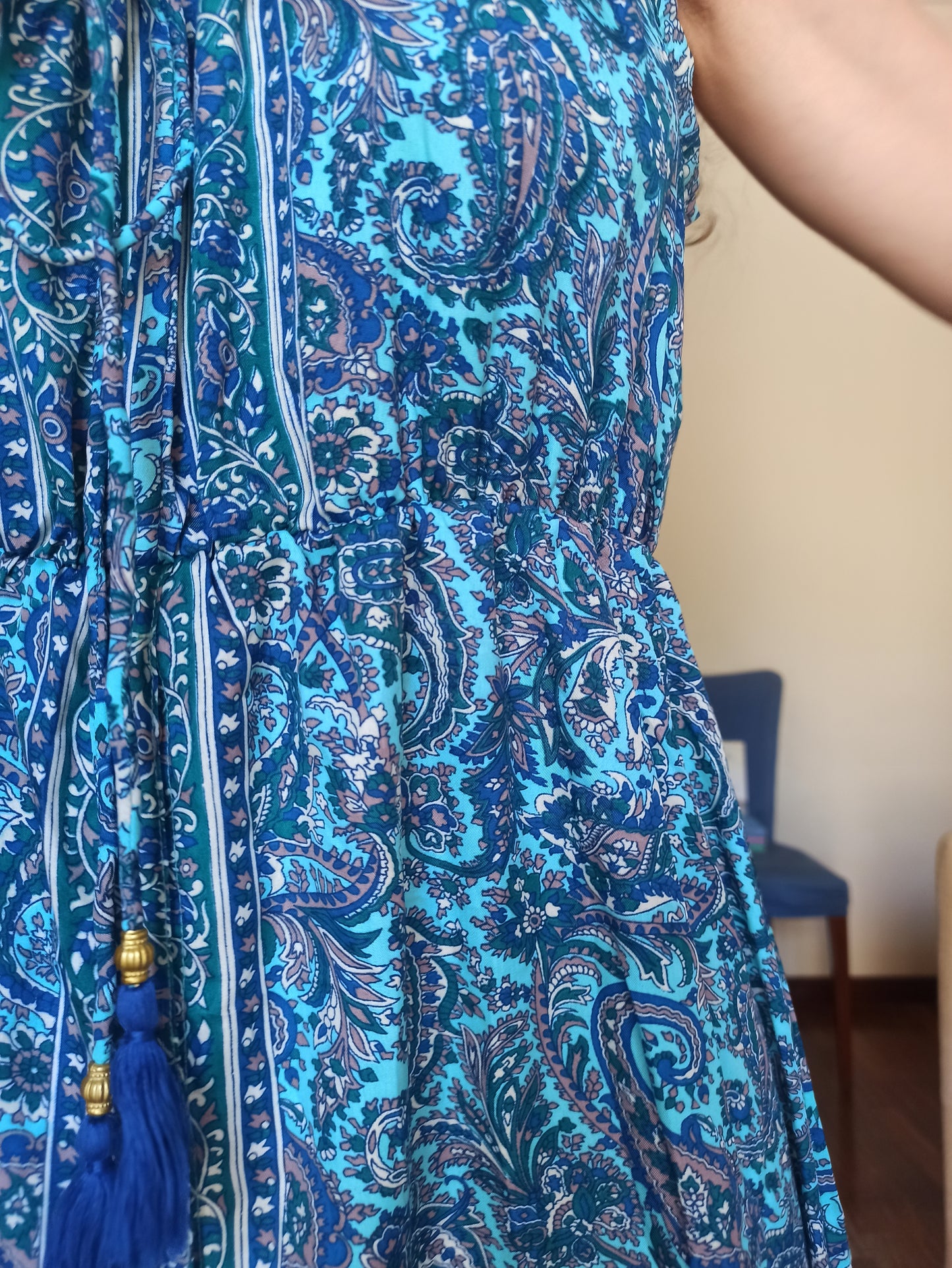 Vivi l’estate con stile grazie a questo abito lungo in perfetto stile boho, pensato per offrire freschezza e femminilità nelle giornate più calde. Realizzato in un tessuto fluido e traspirante, è decorato con una raffinata fantasia paisley nei toni del blu e del turchese, che dona un’eleganza leggera e un tocco esotico al tuo look.