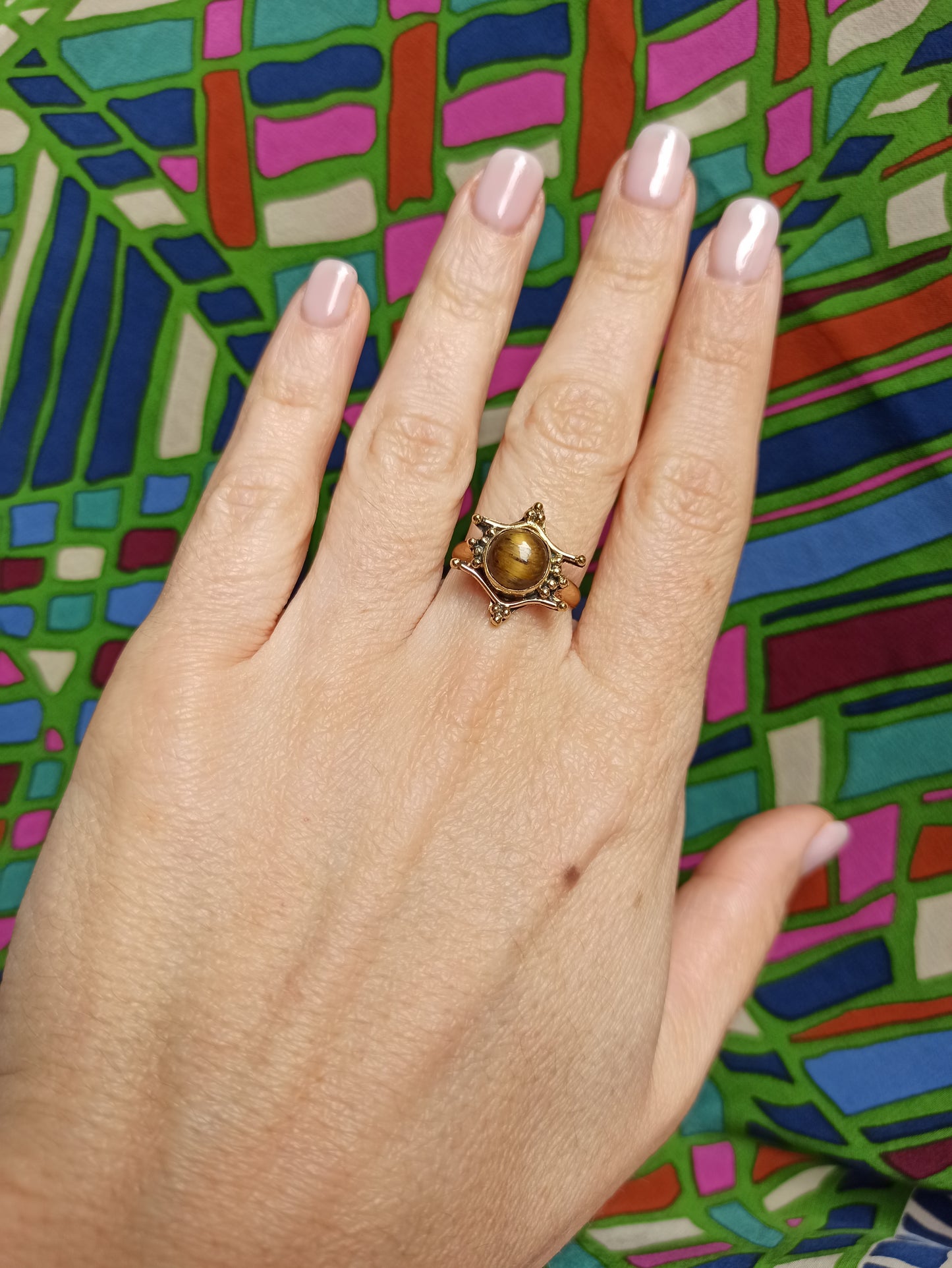 Anello in ottone dorato anallergico con resina simil occhio di tigre. Regolabile.