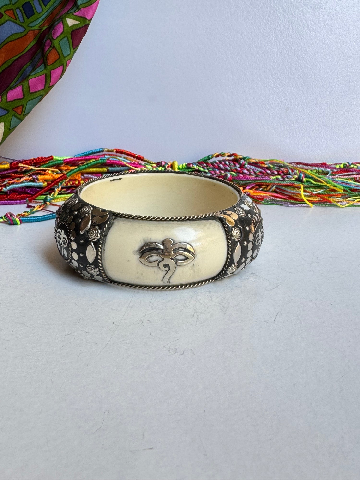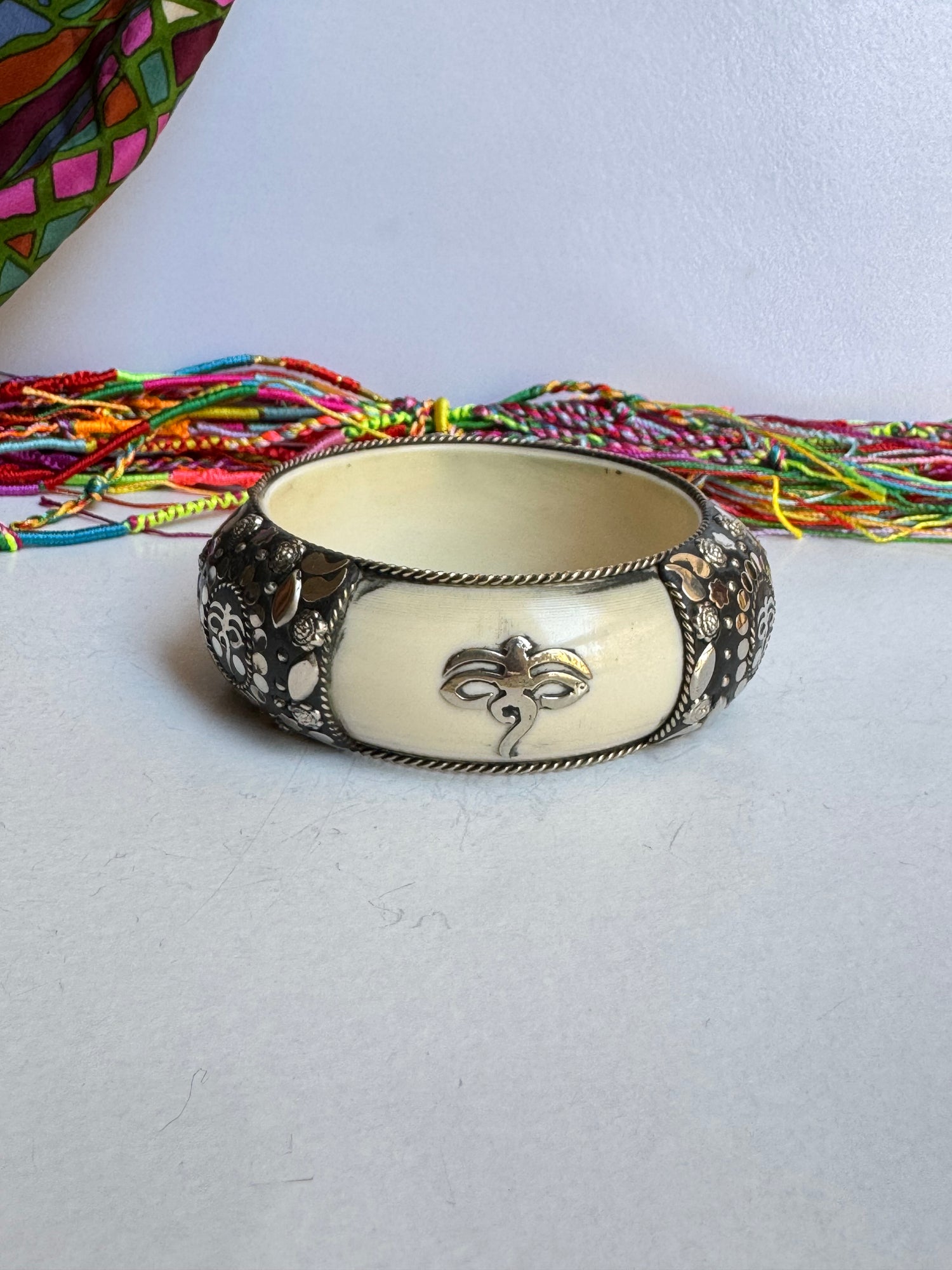 Bracciale rigido artigianale di origine indiana, caratterizzato da un design etnico e spirituale unico. Realizzato con finitura bicolore argento brunito e dettagli dorati, presenta eleganti decorazioni incise e applicazioni in rilievo. Al centro spicca il simbolo sacro Om, emblema universale di energia, armonia e connessione spirituale nella tradizione induista.