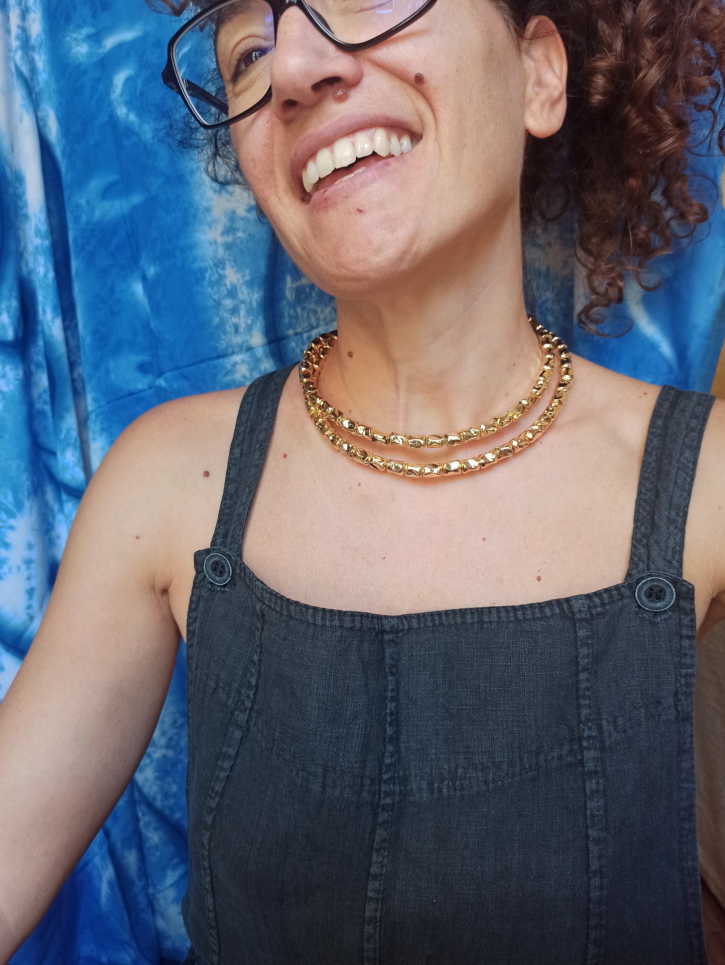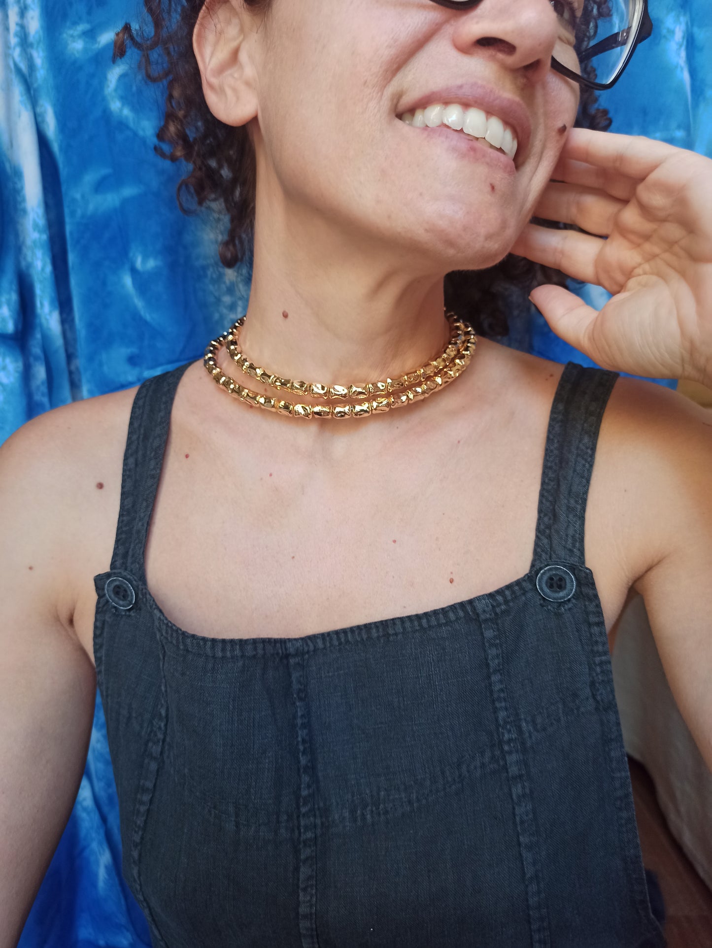 Una collana speciale in lega di metallo che può essere parzialmente modificata per poter essere indossata come collarino stretto a due giri, come collana larga a due giri o con un giro più stretto e uno più largo.
