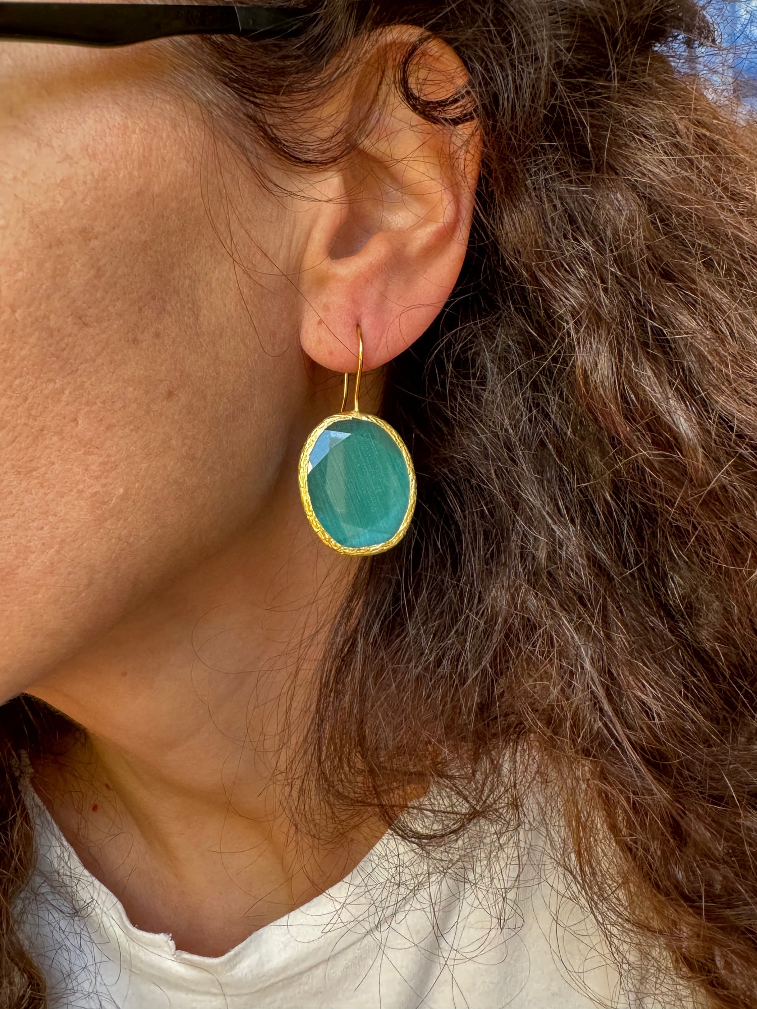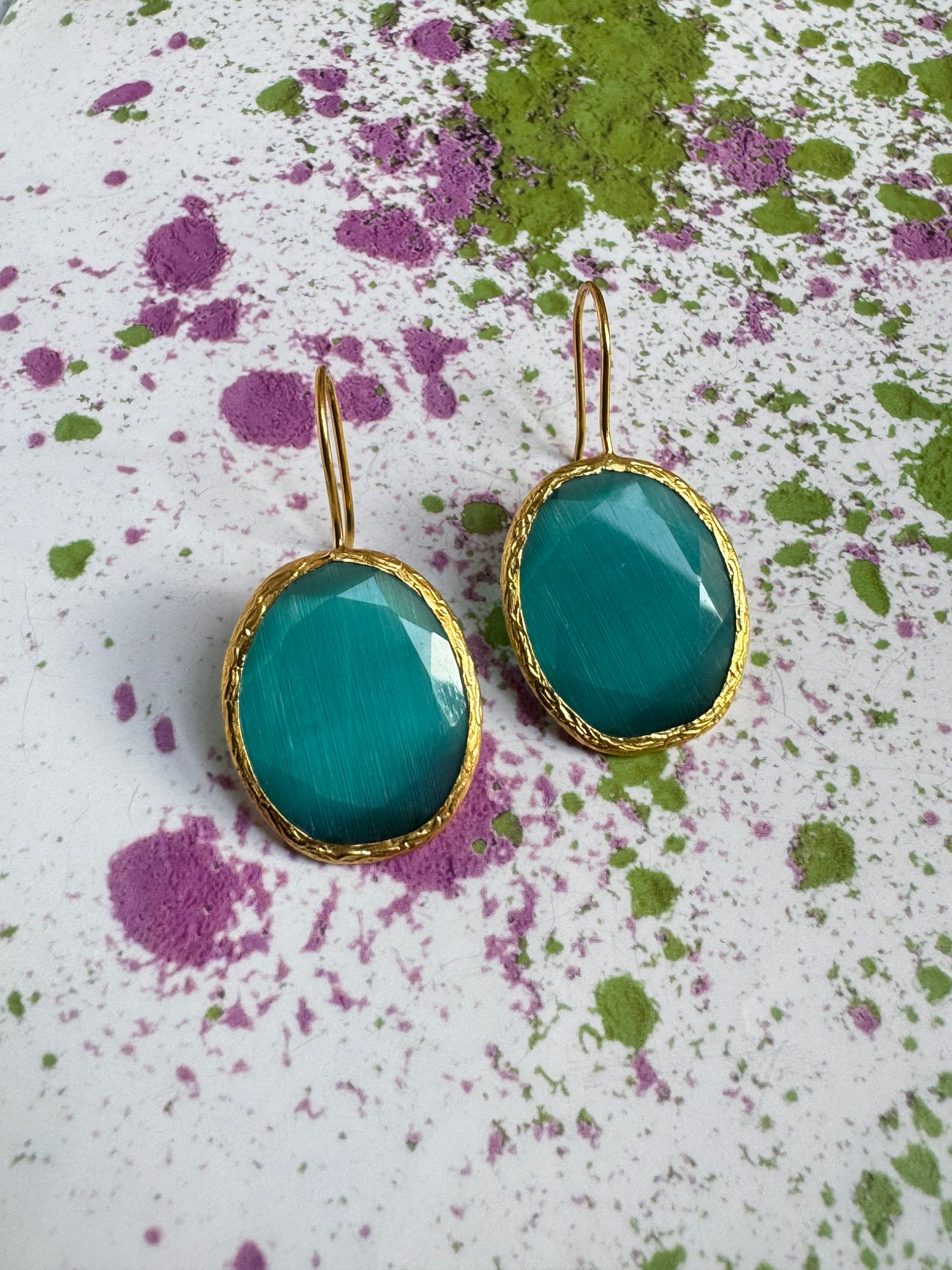 Orecchini in ottone anallergico con pietra occhio di gatto colore verde bottiglia. Nichel free. Lunghezza 4cm.