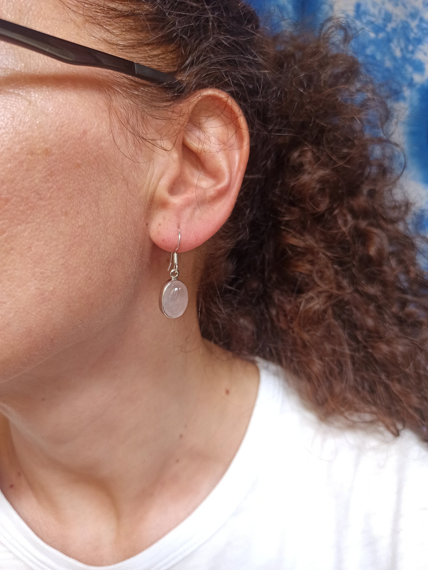 Orecchini in argento 925 con una pietra di quarzo rosa incastonata. Lunghezza 3 cm