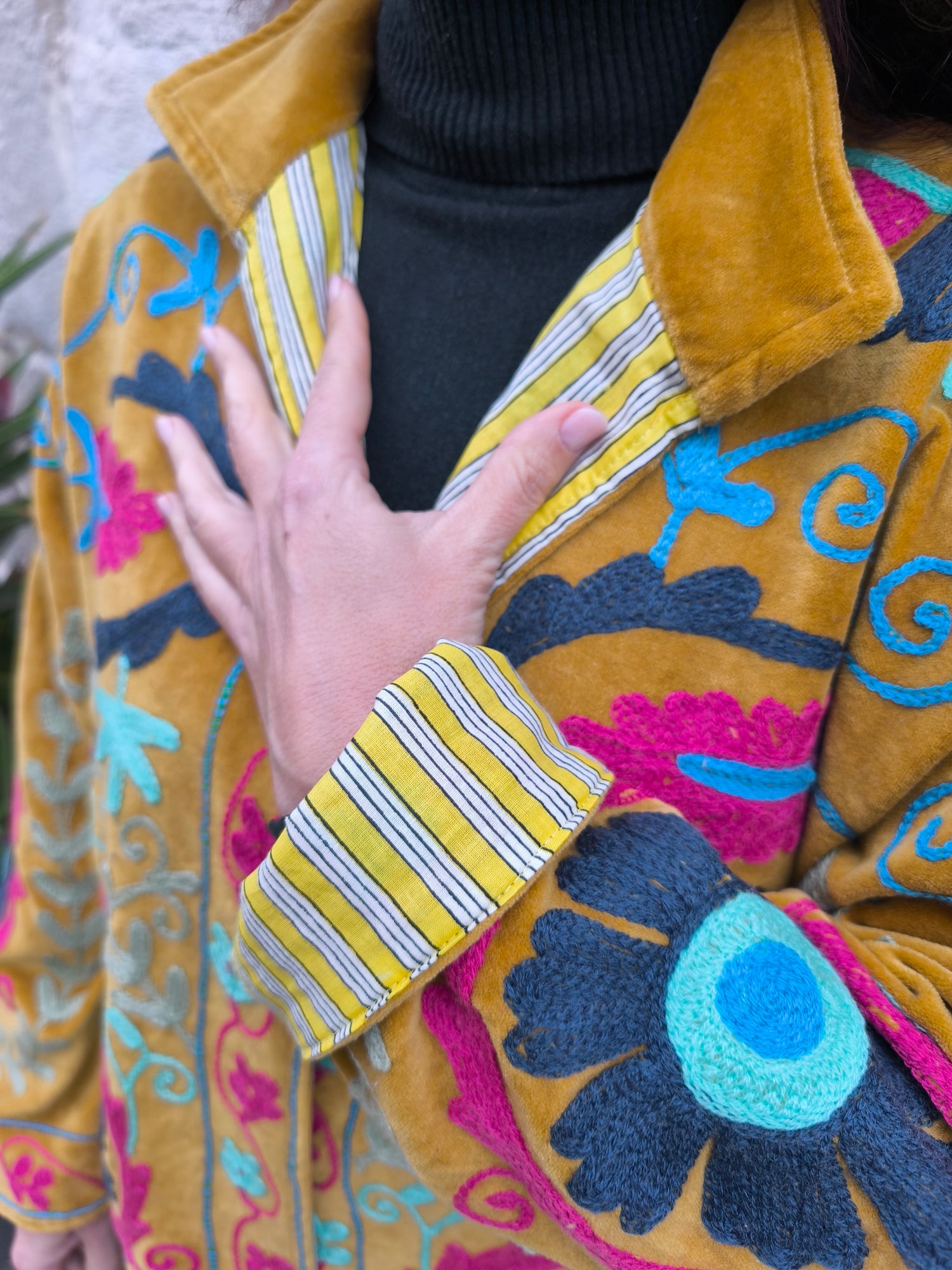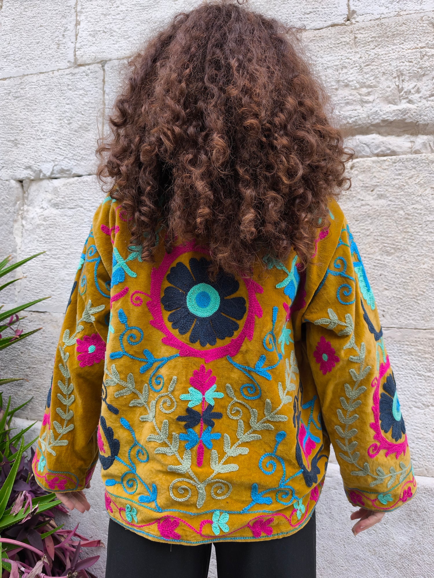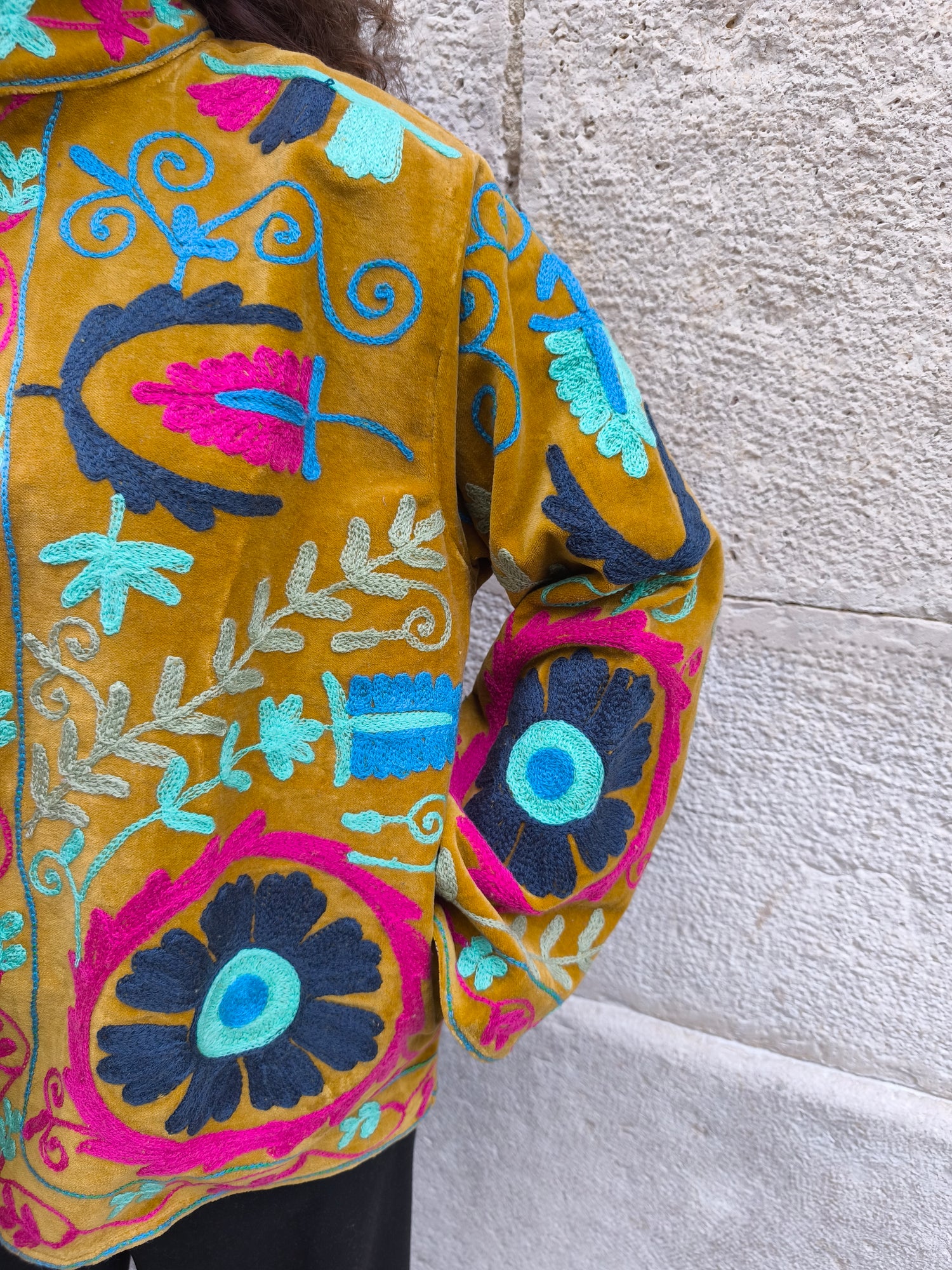 Colorata, luminosa e ricca di dettagli artigianali, questa giacca Suzani è un capo che unisce tradizione e creatività. Realizzata in velluto con ricami fatti a mano.