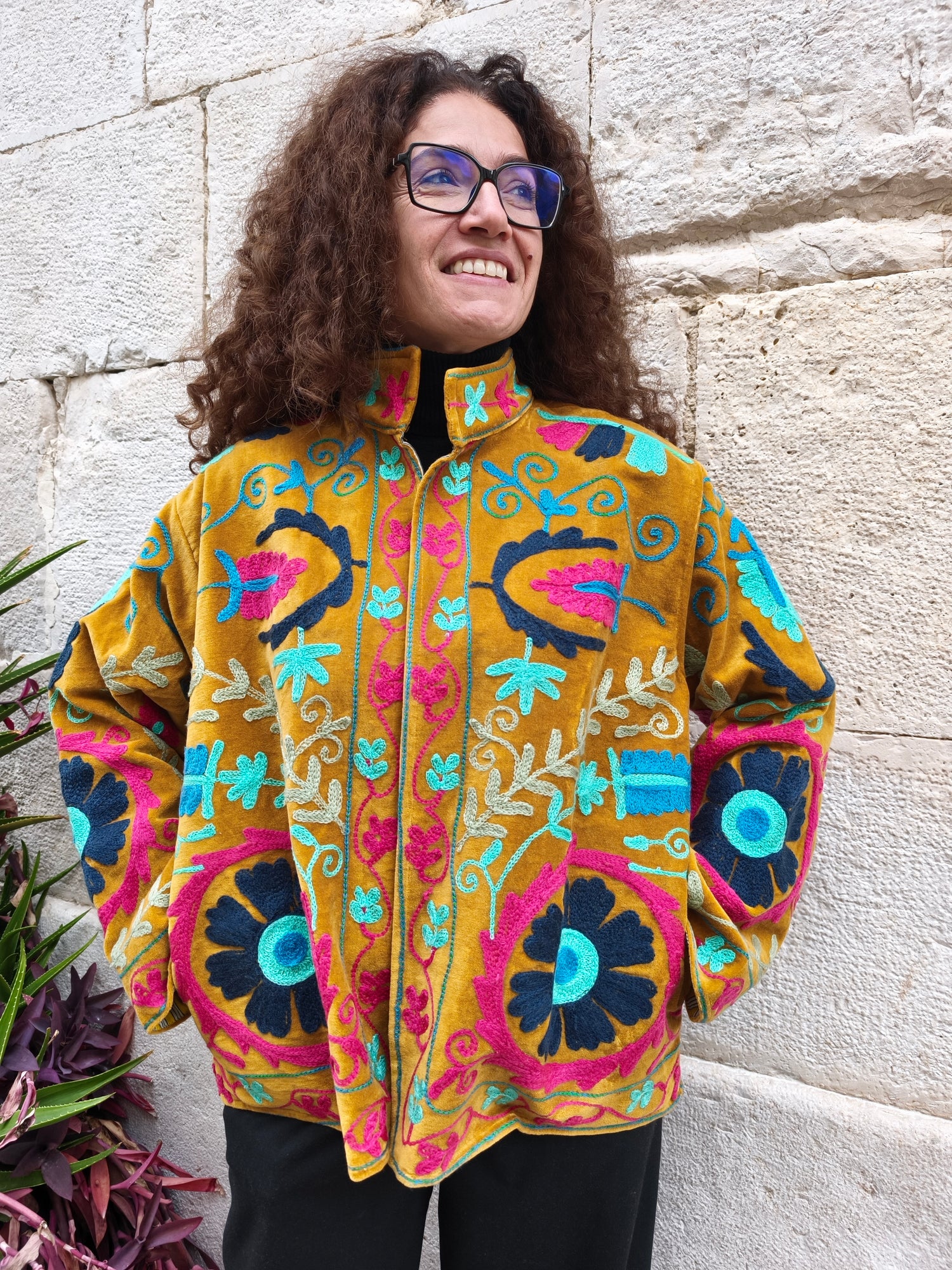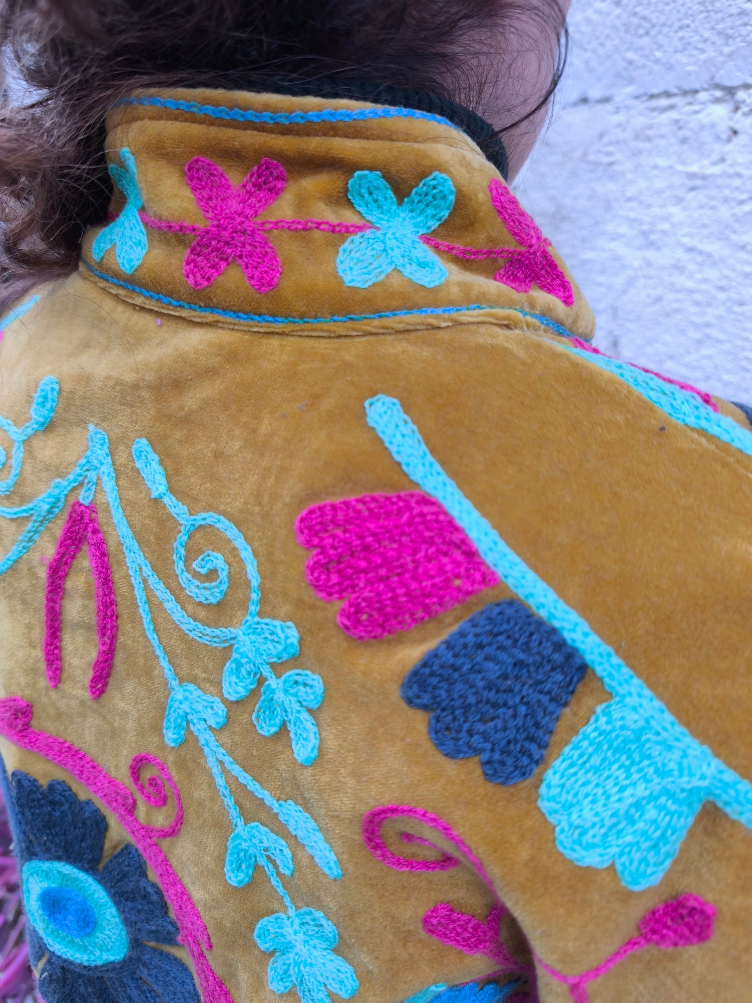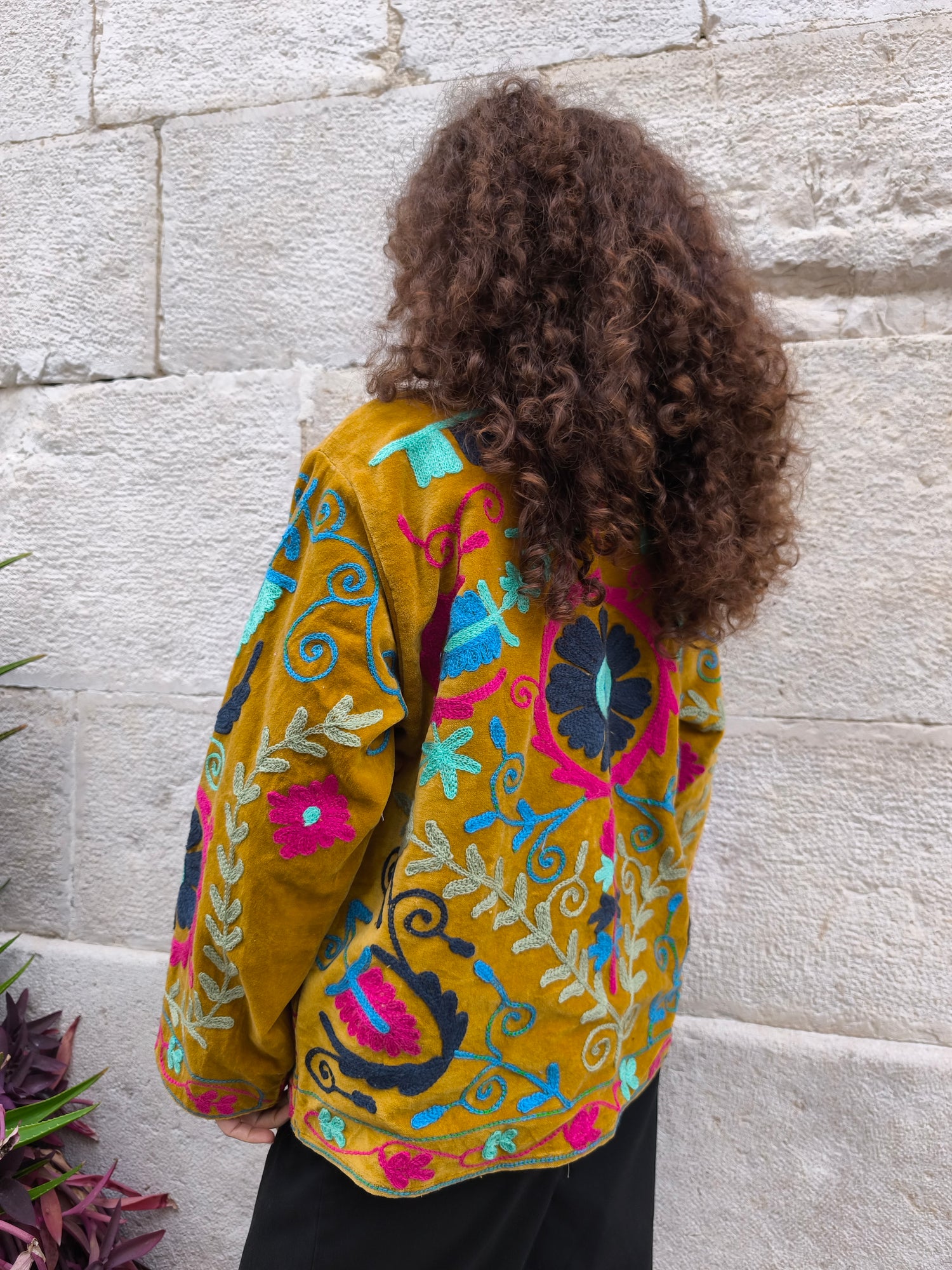 Colorata, luminosa e ricca di dettagli artigianali, questa giacca Suzani è un capo che unisce tradizione e creatività. Realizzata in velluto con ricami fatti a mano.