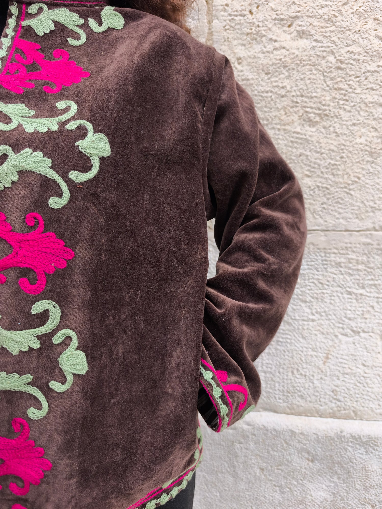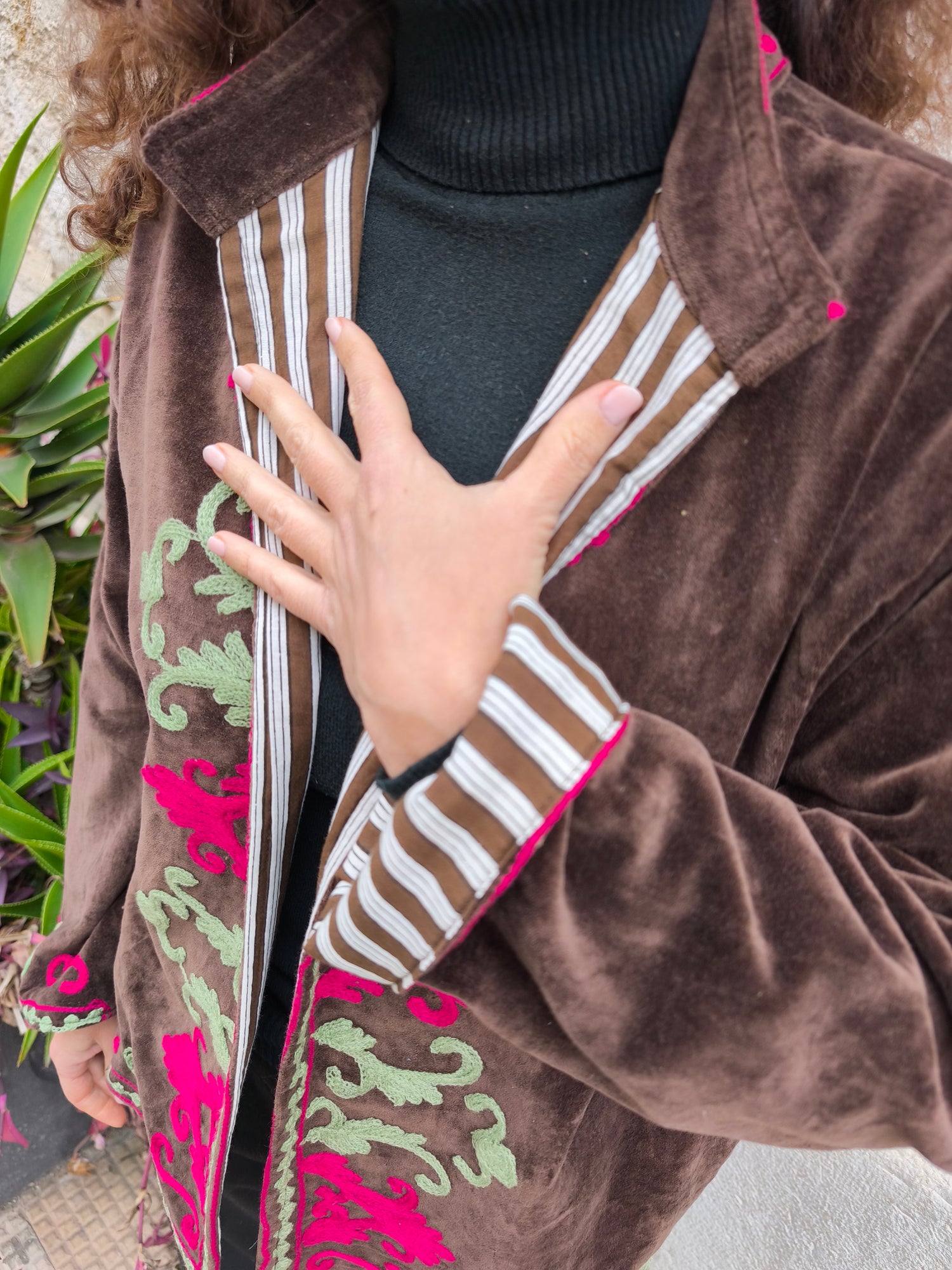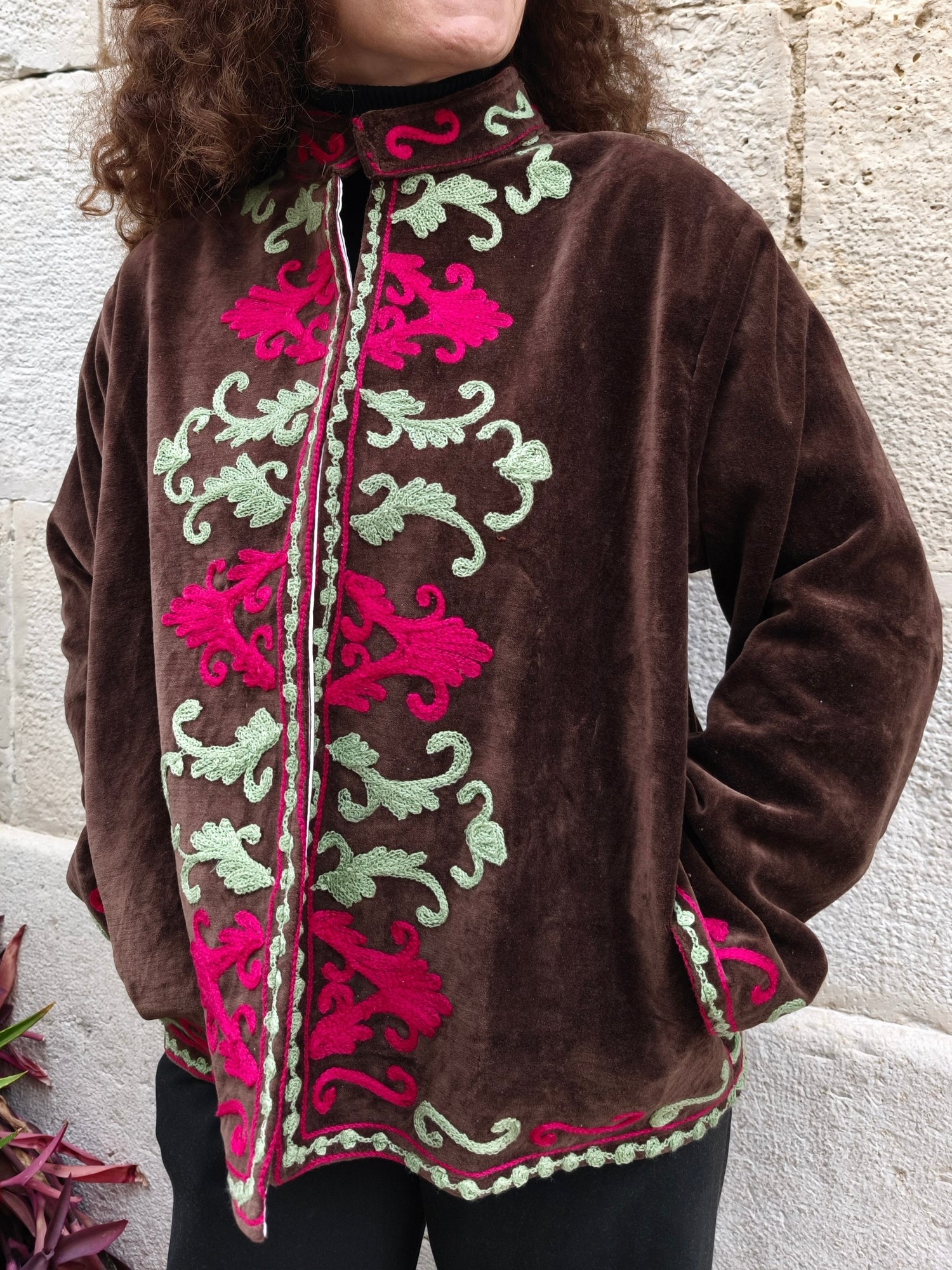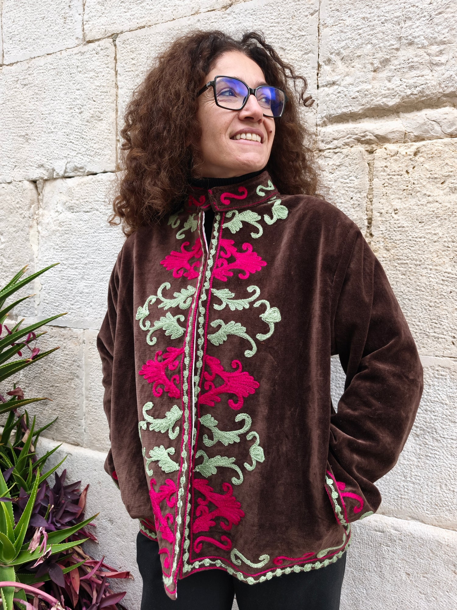 Colorata, luminosa e ricca di dettagli artigianali, questa giacca Suzani è un capo che unisce tradizione e creatività. Realizzata in velluto con ricami fatti a mano.