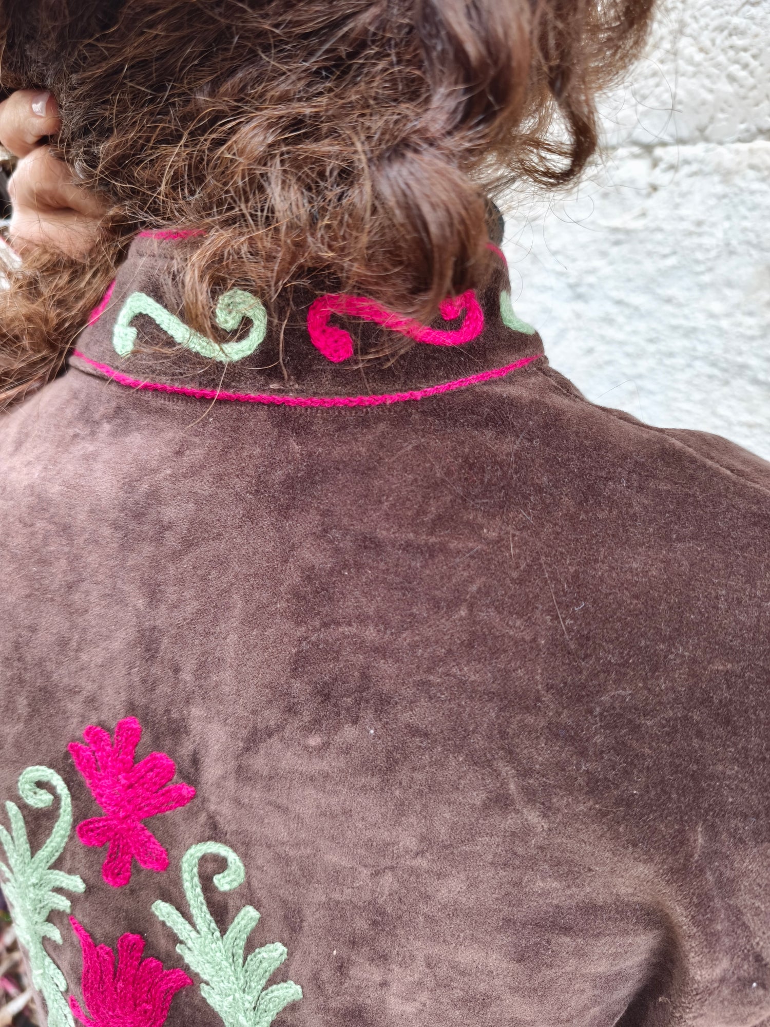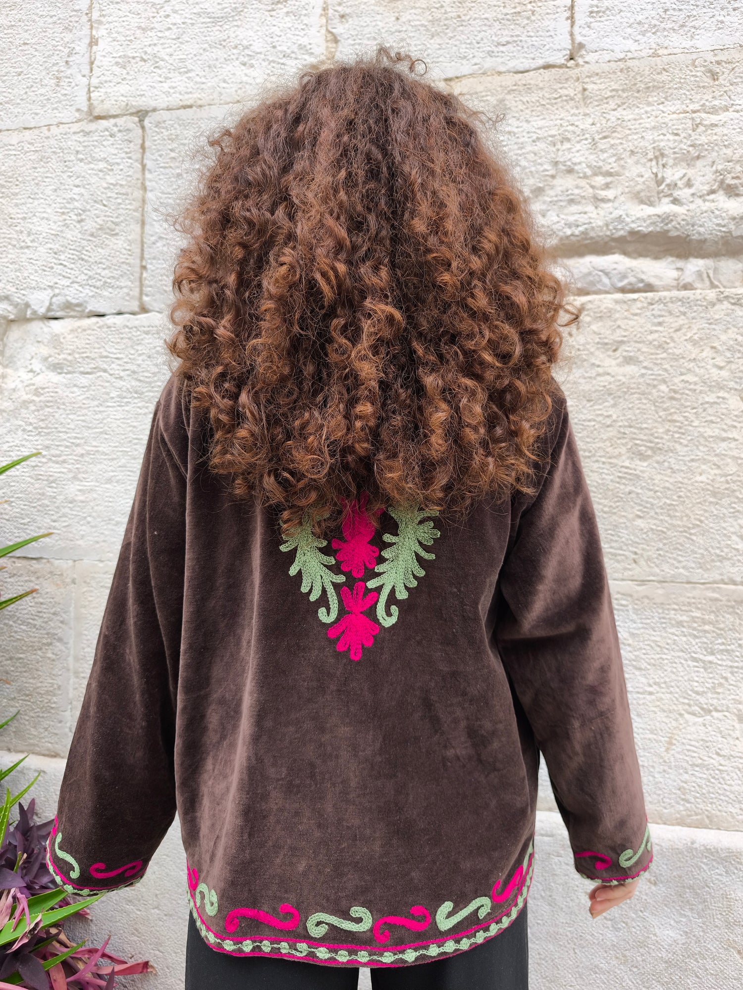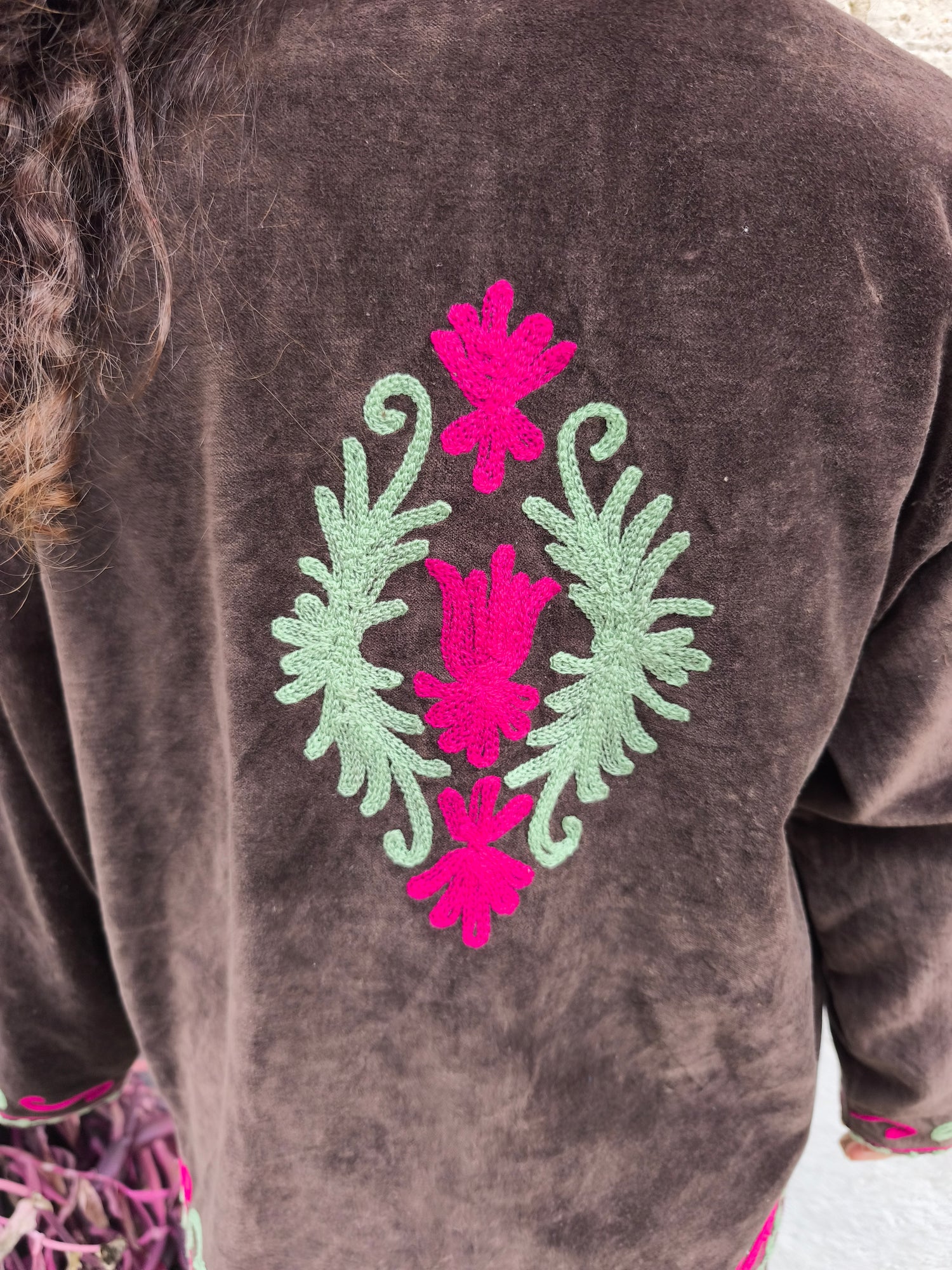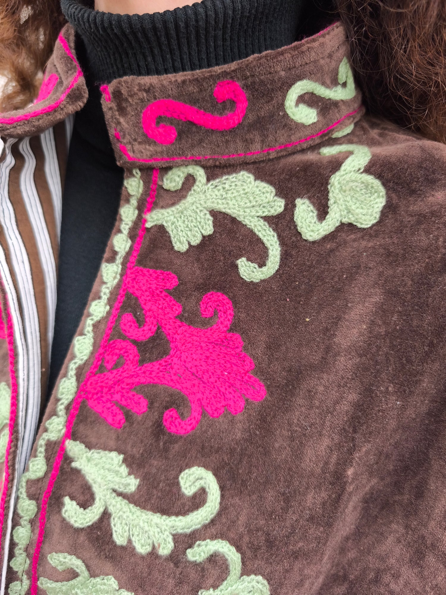 Colorata, luminosa e ricca di dettagli artigianali, questa giacca Suzani è un capo che unisce tradizione e creatività. Realizzata in velluto con ricami fatti a mano.