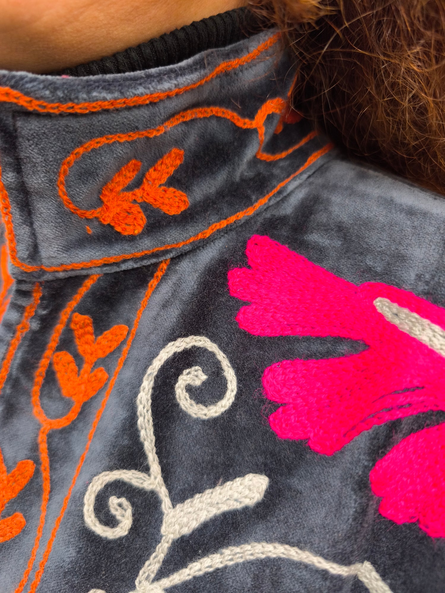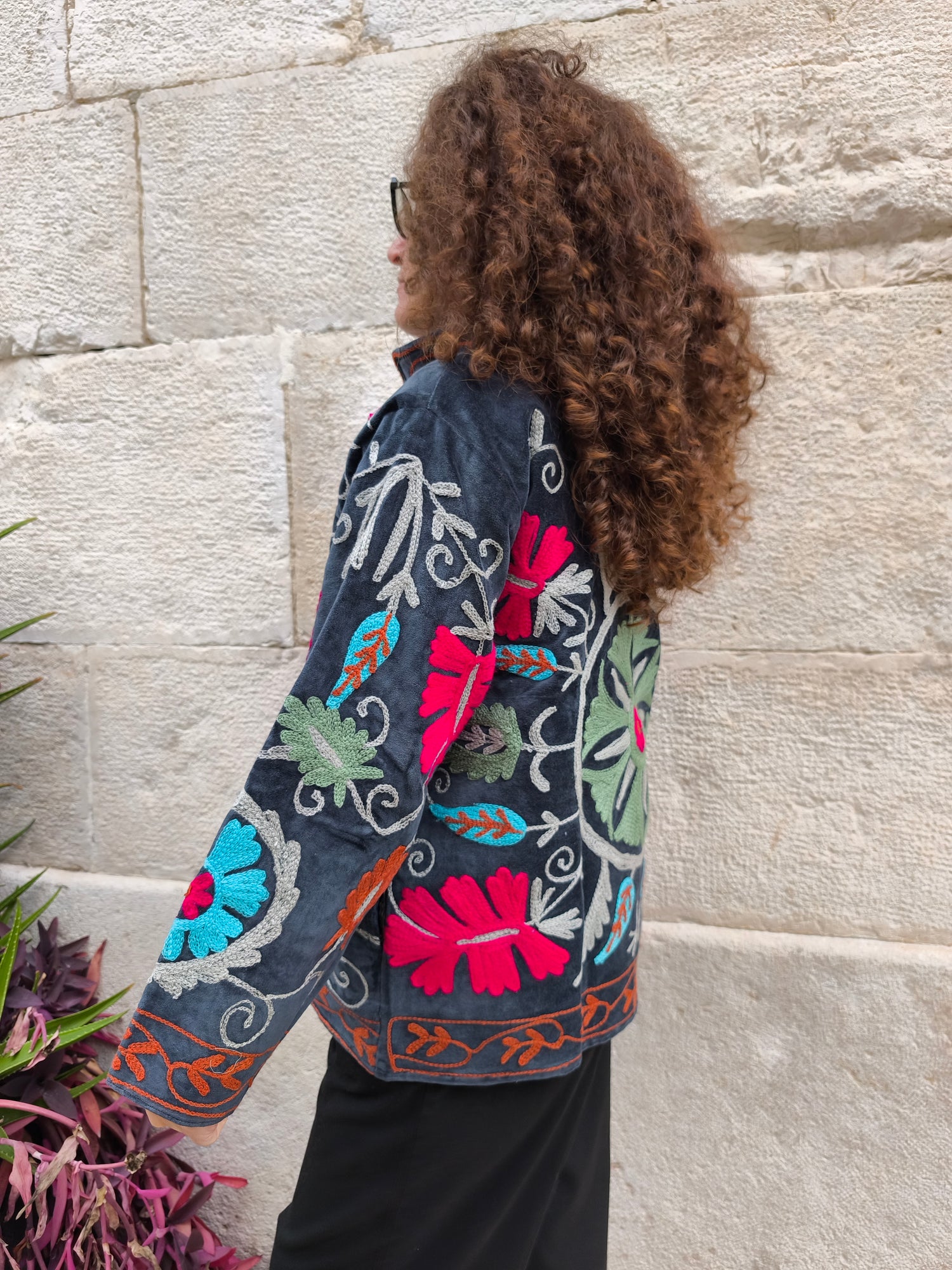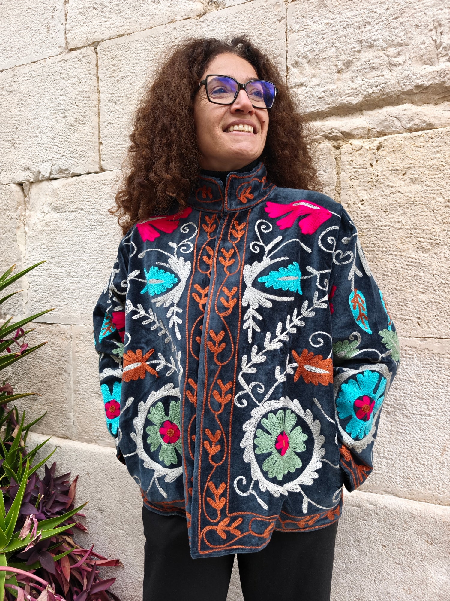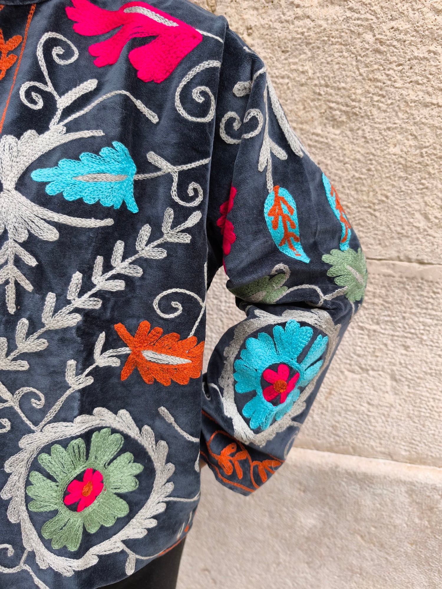 Colorata, luminosa e ricca di dettagli artigianali, questa giacca Suzani è un capo che unisce tradizione e creatività. Realizzata in velluto con ricami fatti a mano.