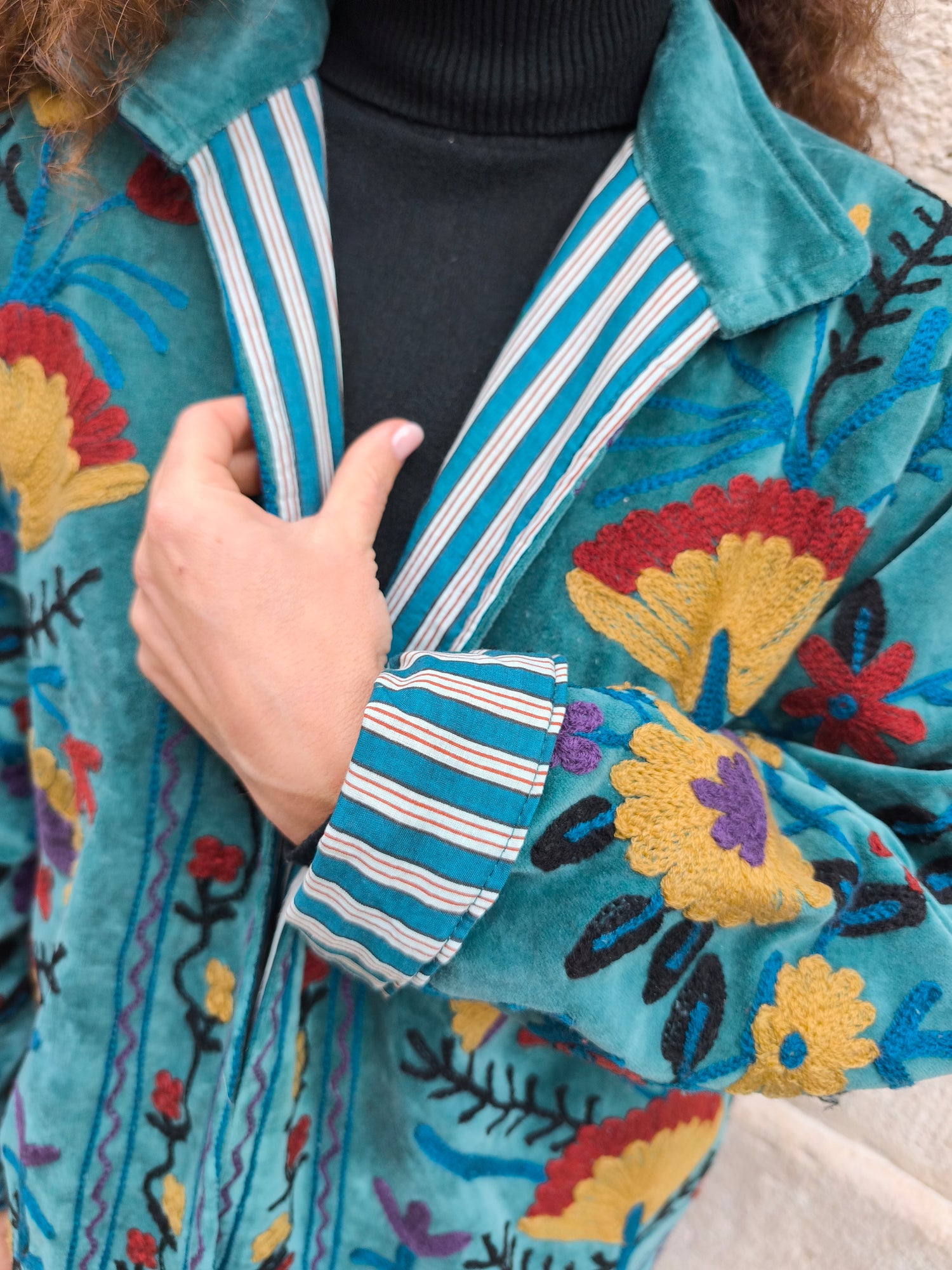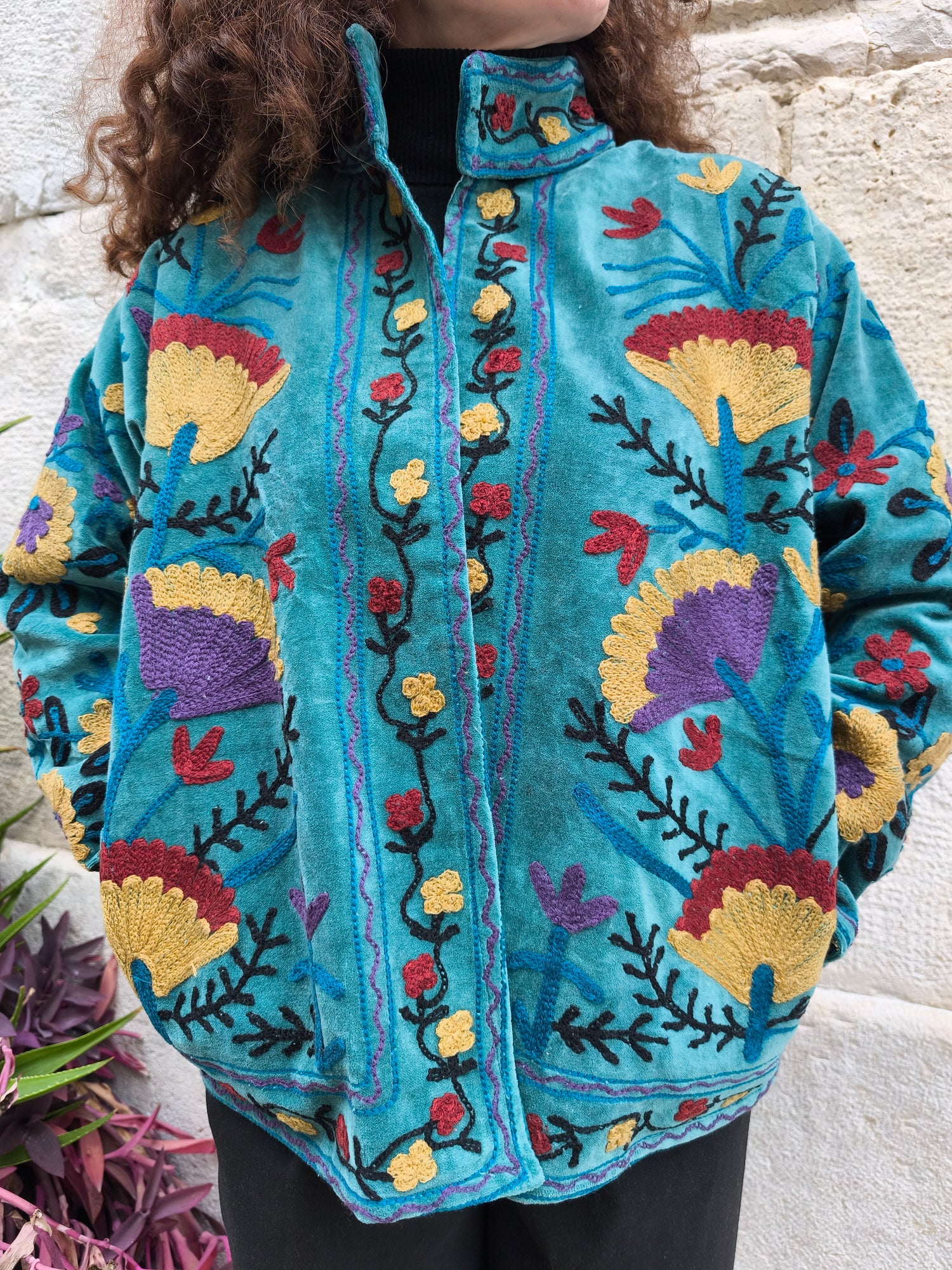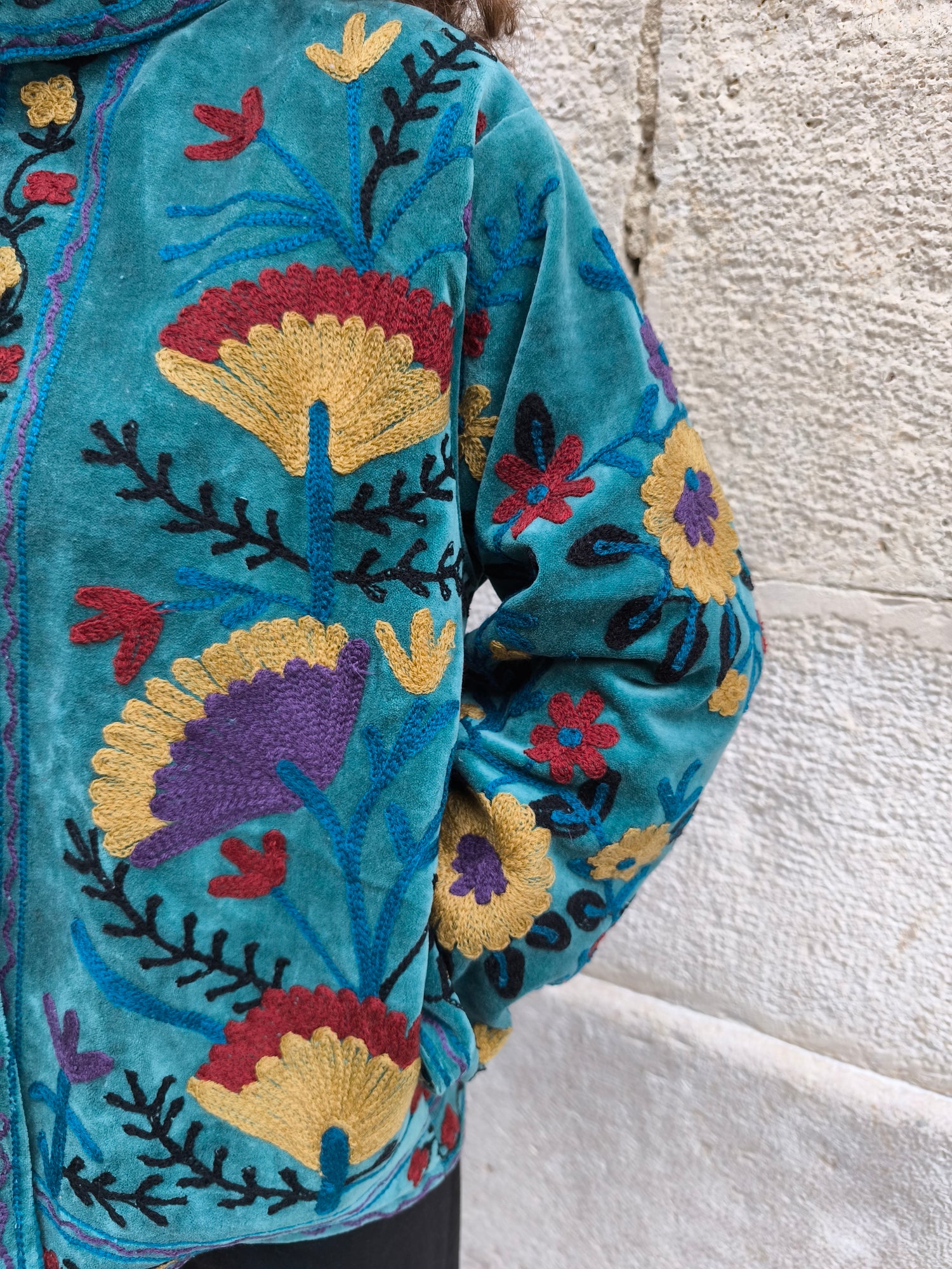 Colorata, luminosa e ricca di dettagli artigianali, questa giacca Suzani è un capo che unisce tradizione e creatività. Realizzata in velluto con ricami fatti a mano.