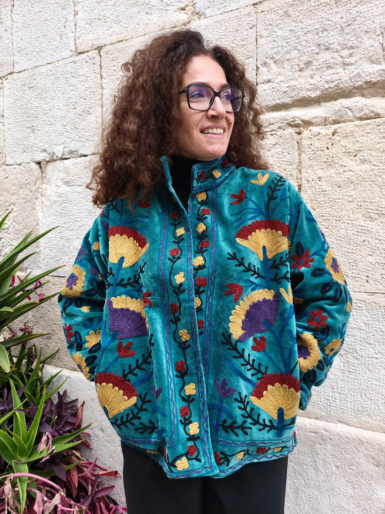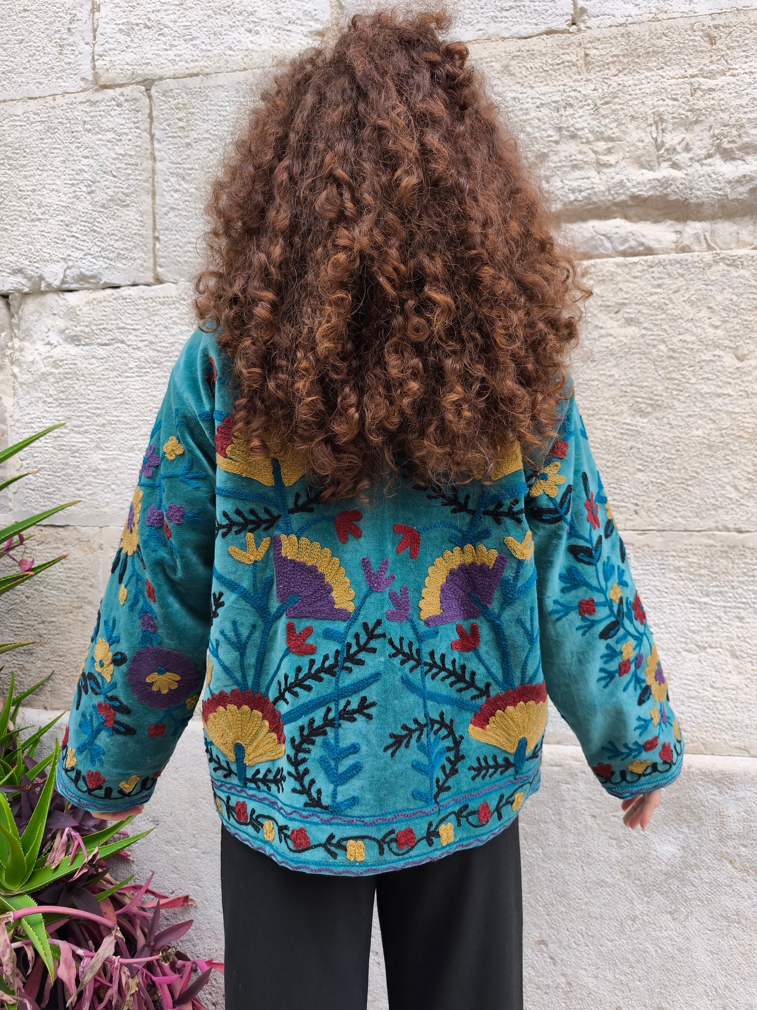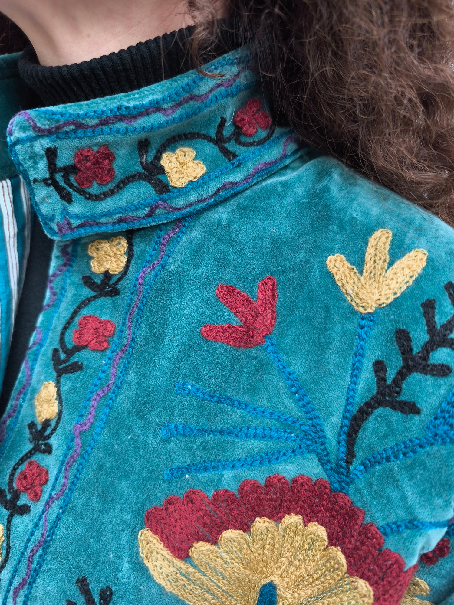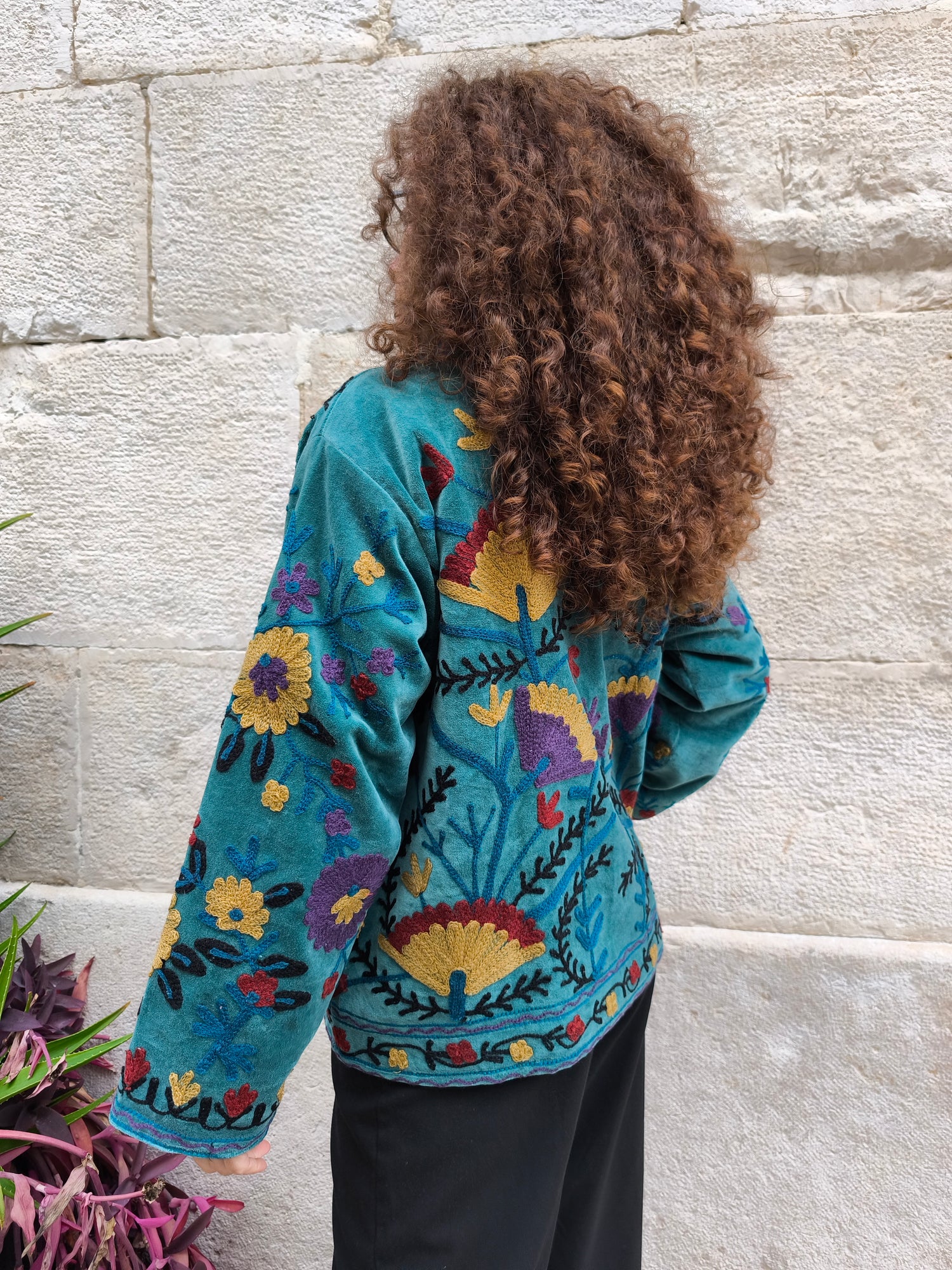 Colorata, luminosa e ricca di dettagli artigianali, questa giacca Suzani è un capo che unisce tradizione e creatività. Realizzata in velluto con ricami fatti a mano.