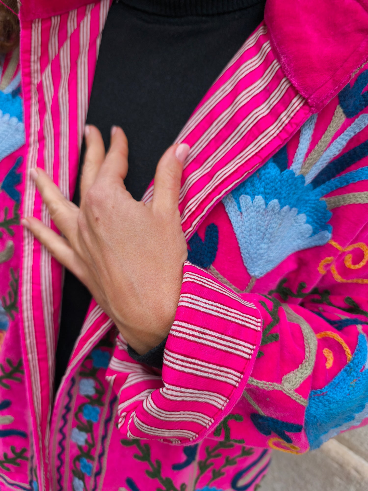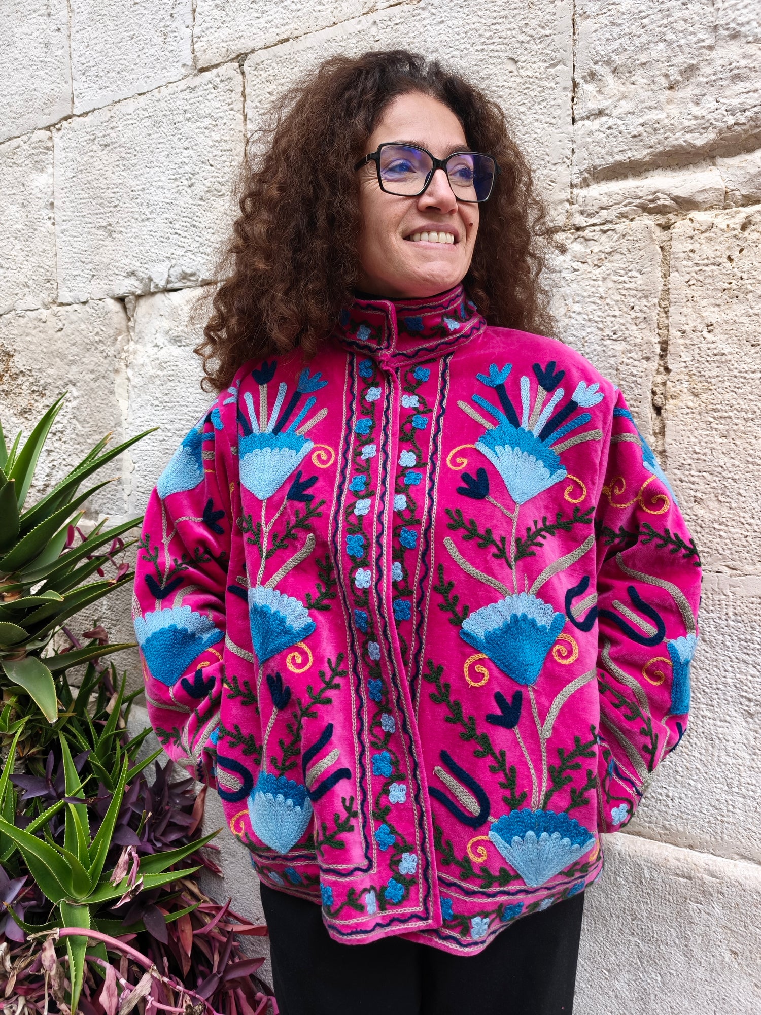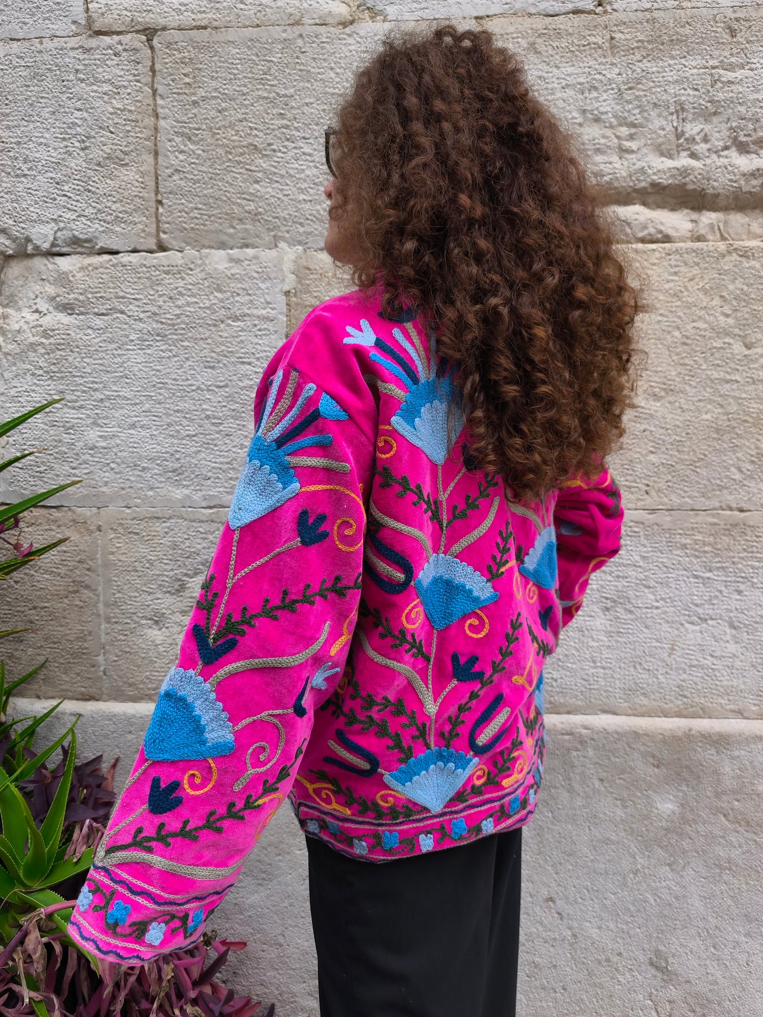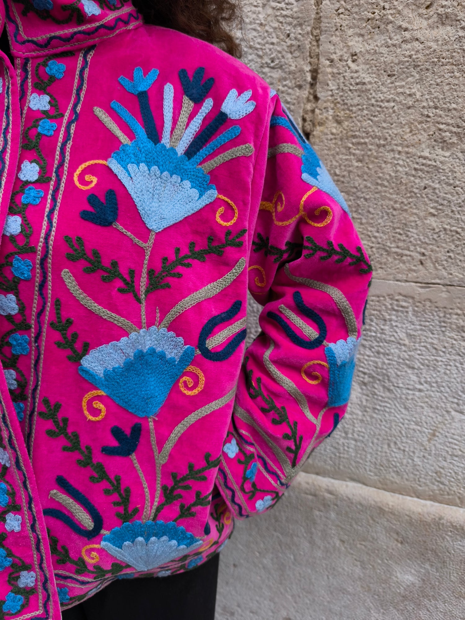 Colorata, luminosa e ricca di dettagli artigianali, questa giacca Suzani è un capo che unisce tradizione e creatività. Realizzata in velluto con ricami fatti a mano.