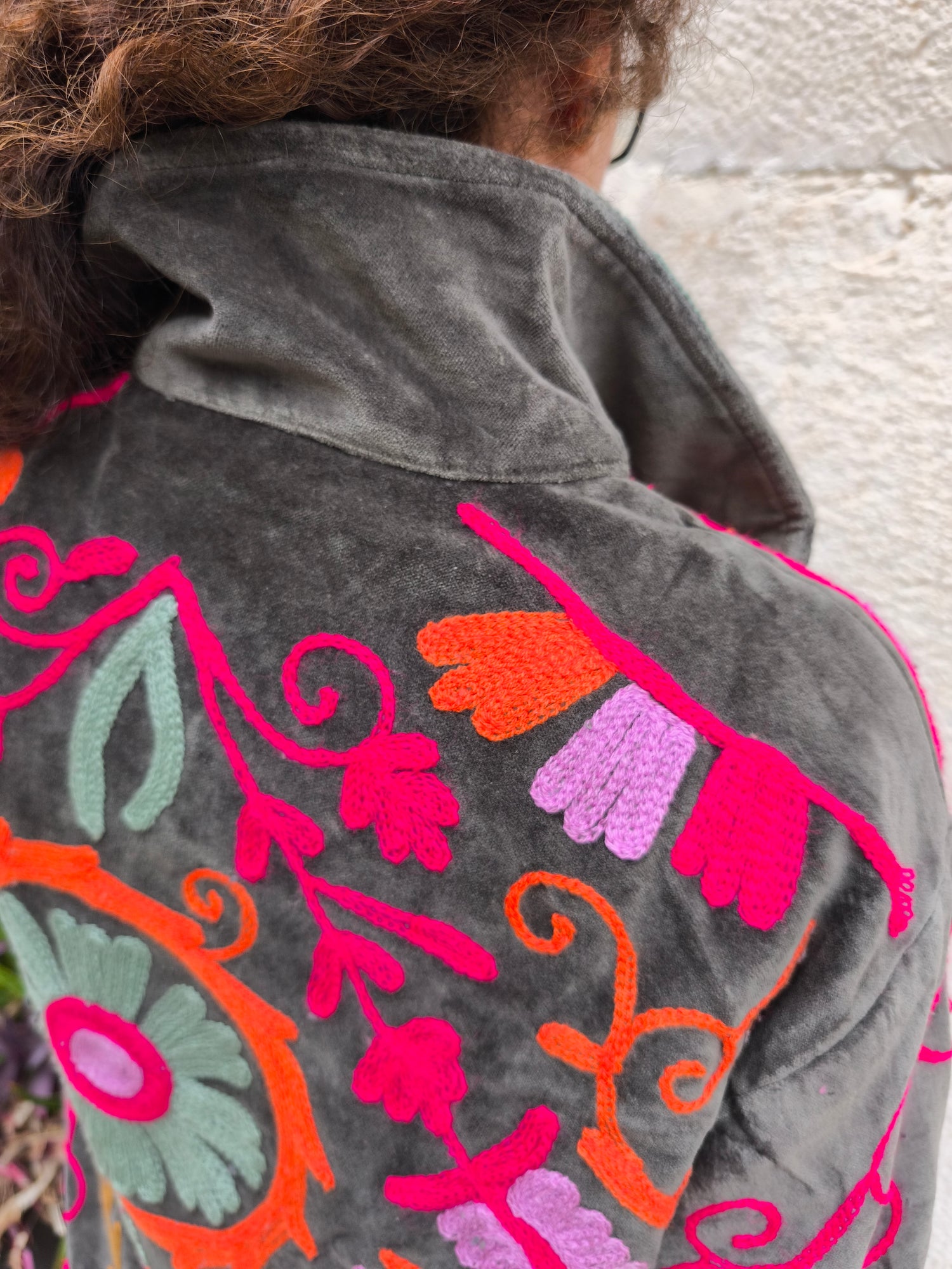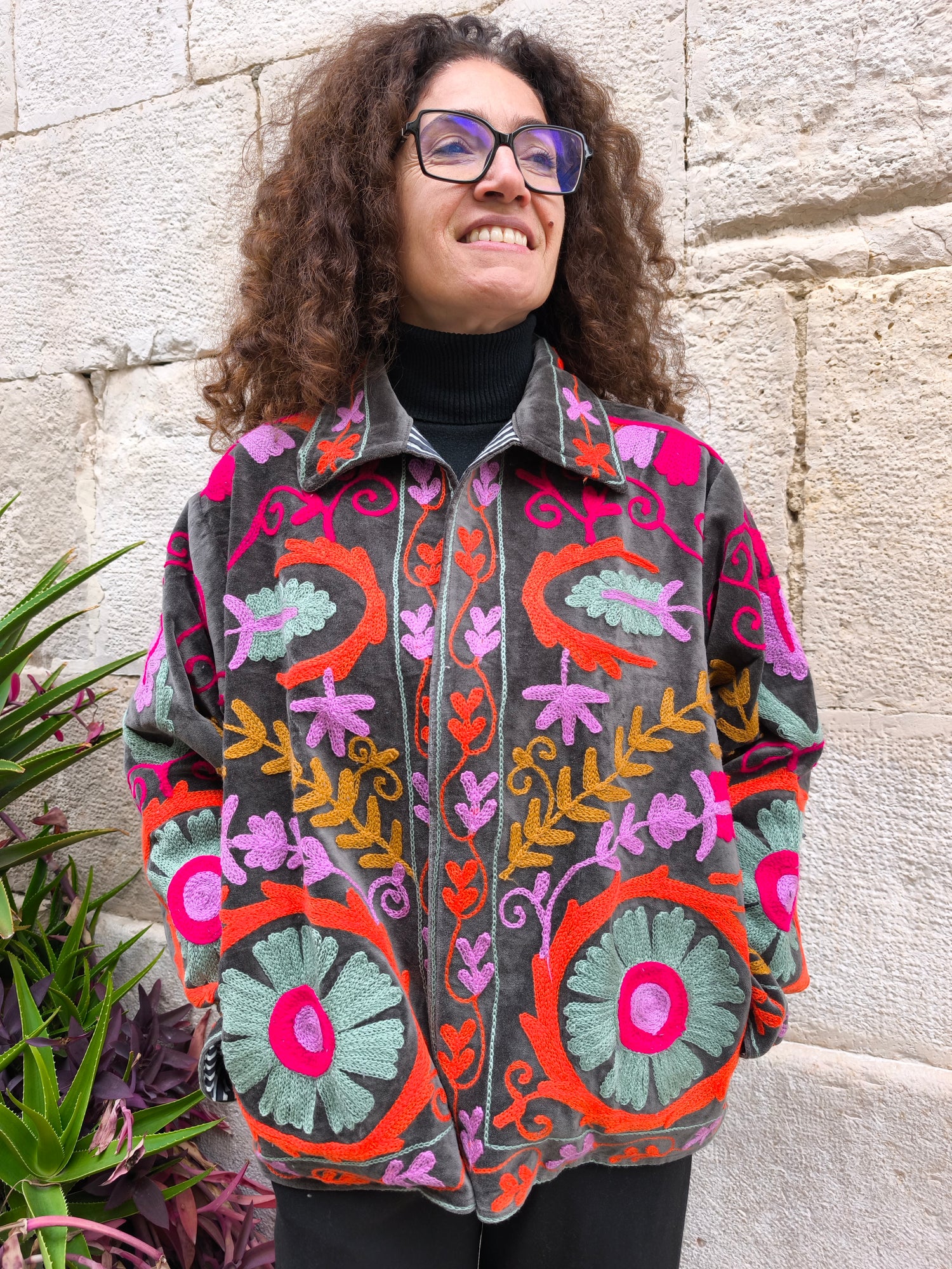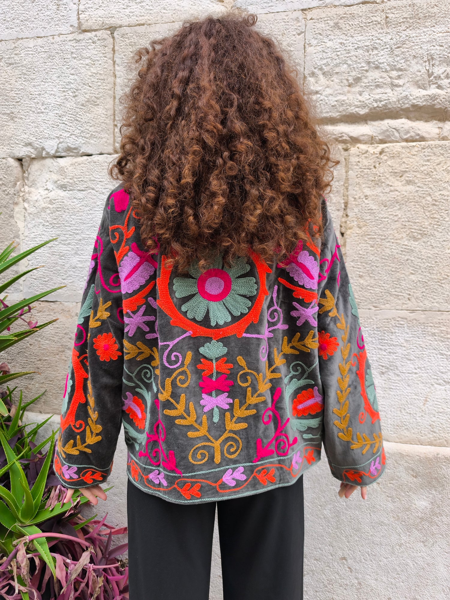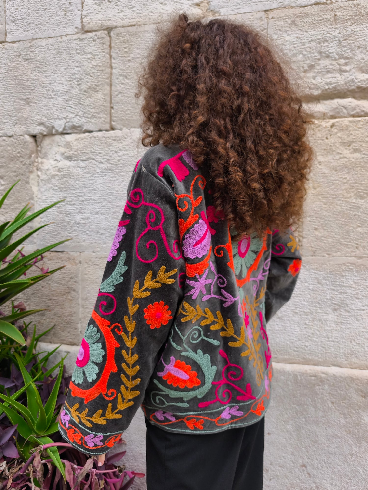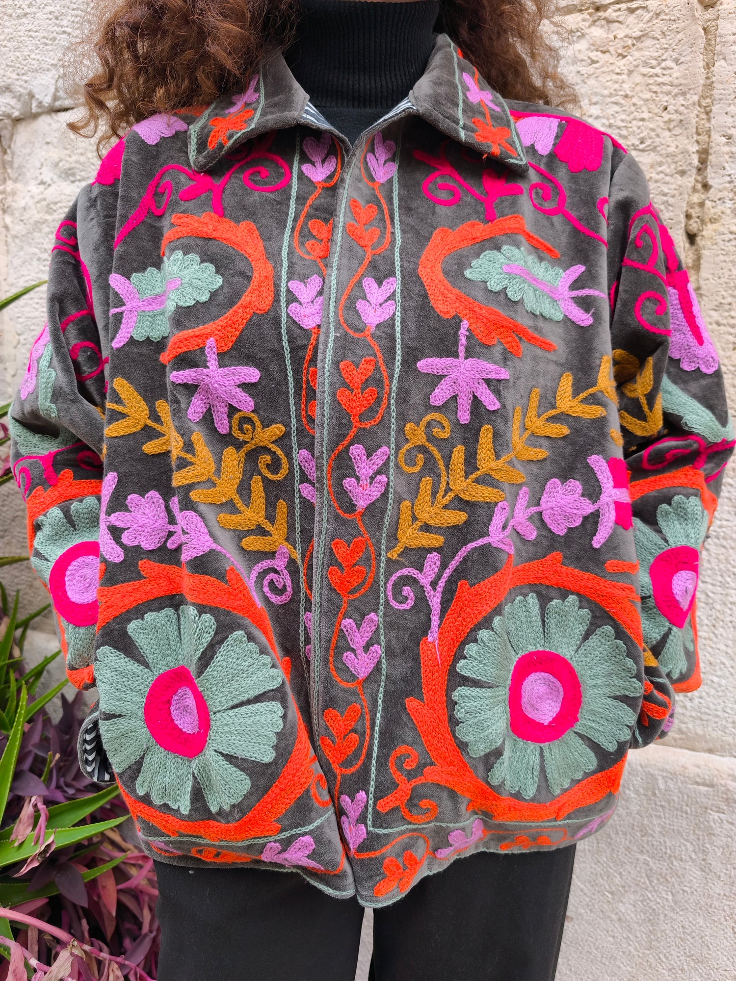 Colorata, luminosa e ricca di dettagli artigianali, questa giacca Suzani è un capo che unisce tradizione e creatività. Realizzata in velluto con ricami fatti a mano.