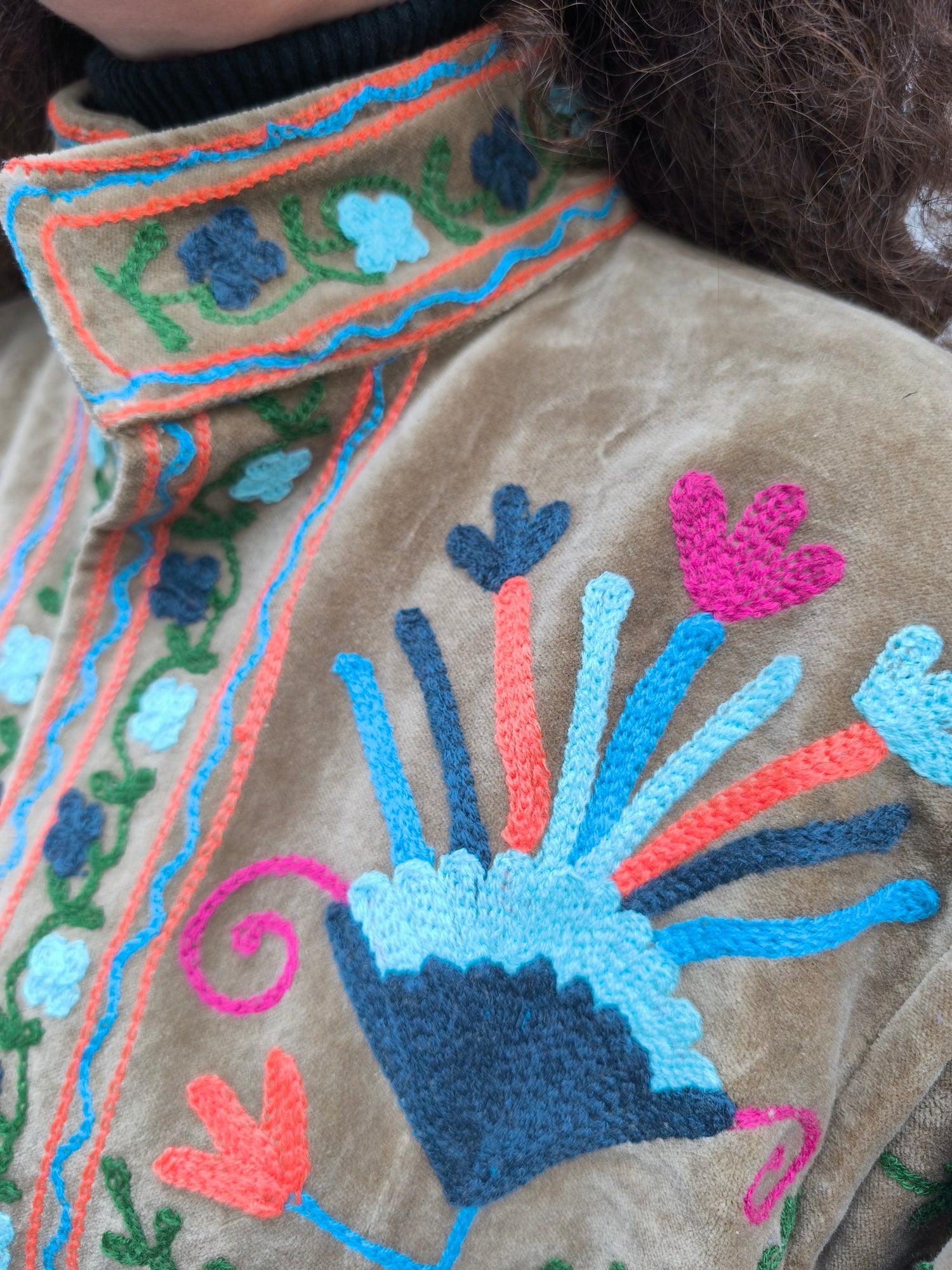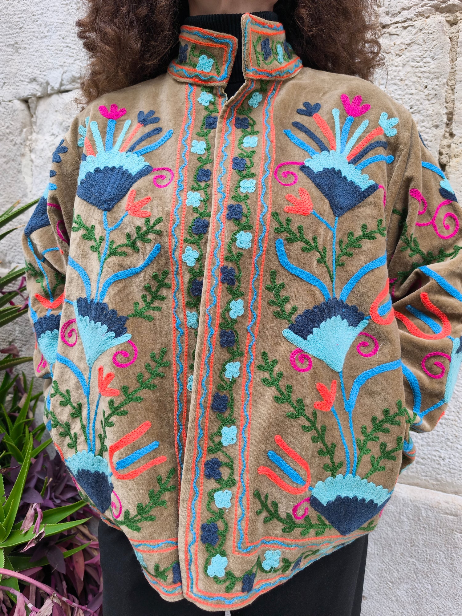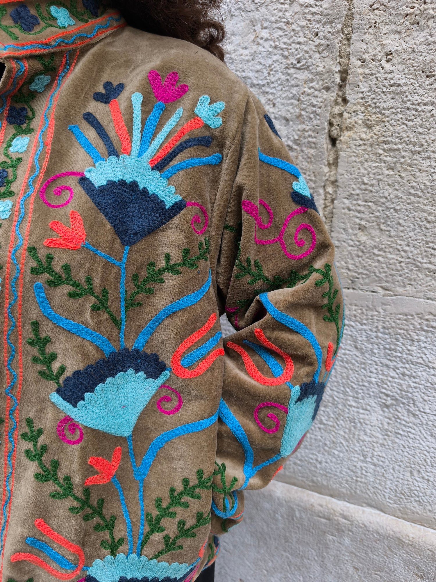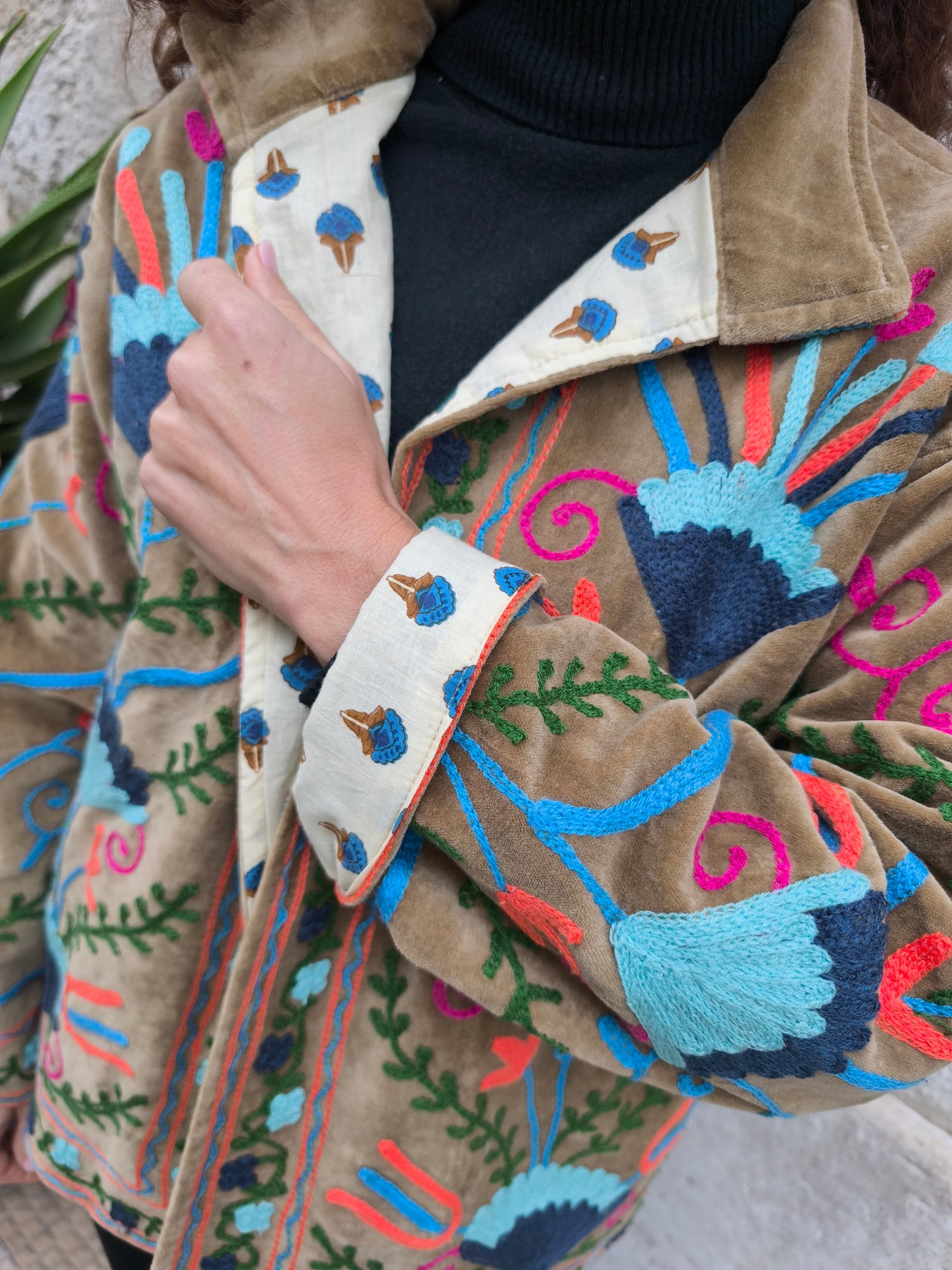 Colorata, luminosa e ricca di dettagli artigianali, questa giacca Suzani è un capo che unisce tradizione e creatività. Realizzata in velluto con ricami fatti a mano.