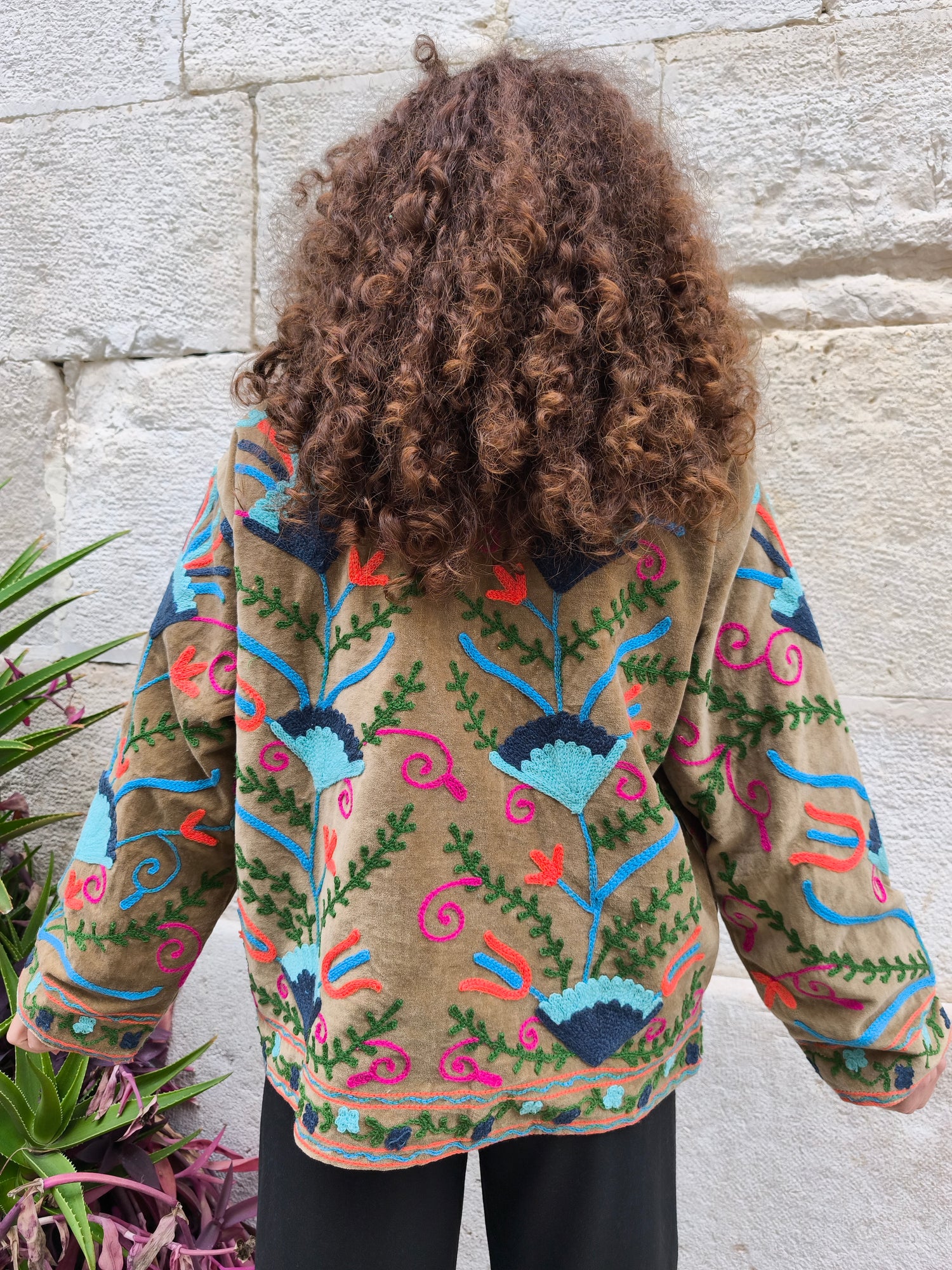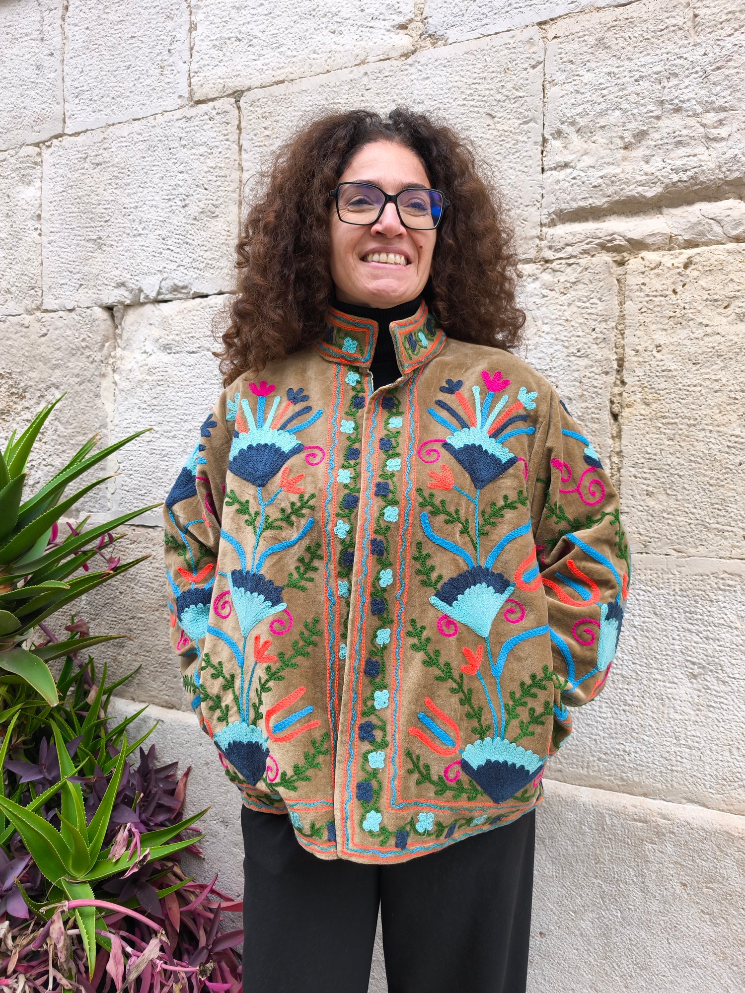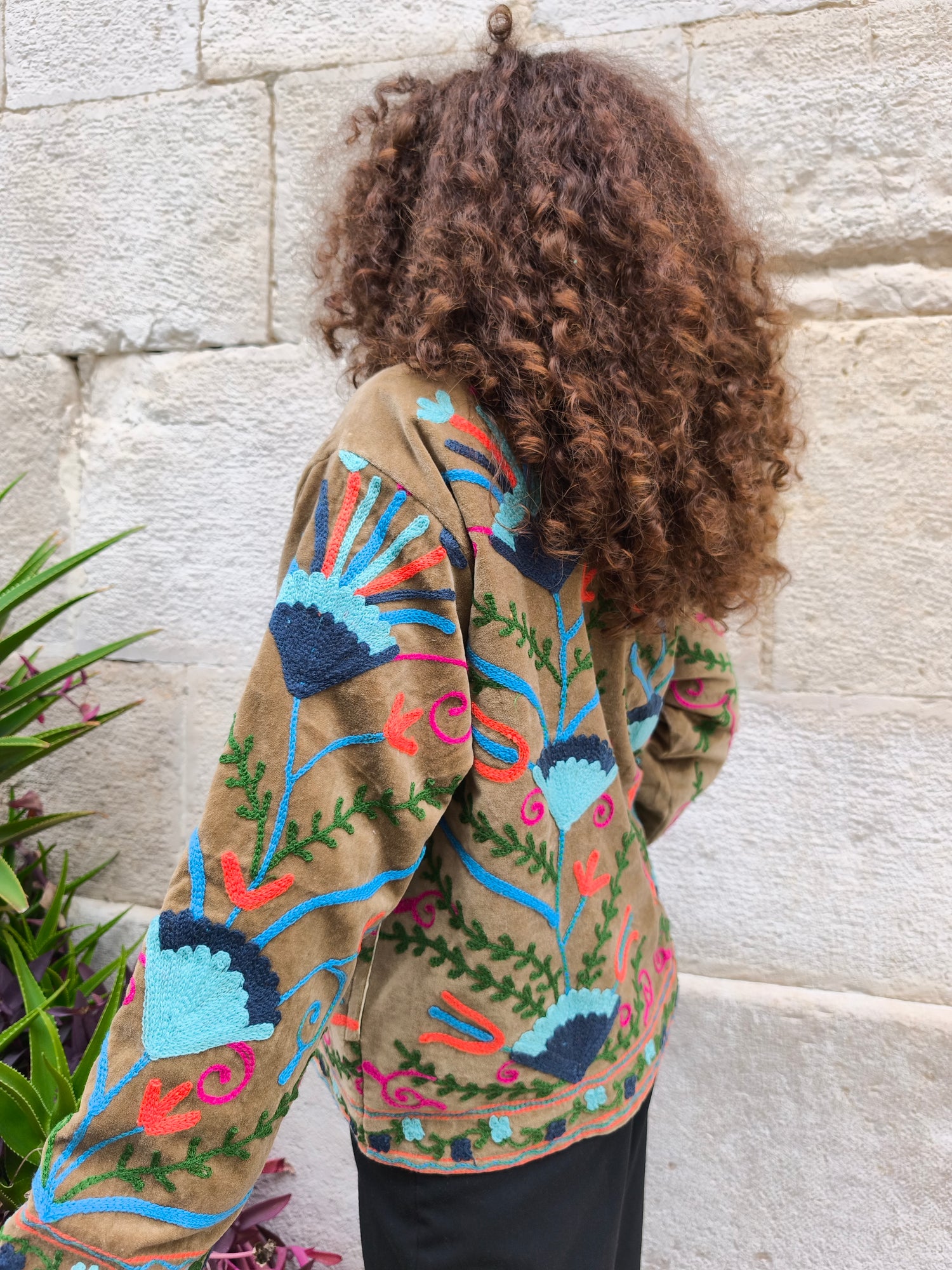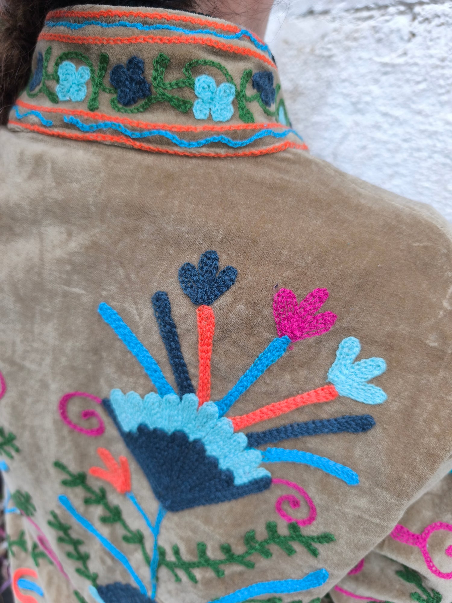 Colorata, luminosa e ricca di dettagli artigianali, questa giacca Suzani è un capo che unisce tradizione e creatività. Realizzata in velluto con ricami fatti a mano.