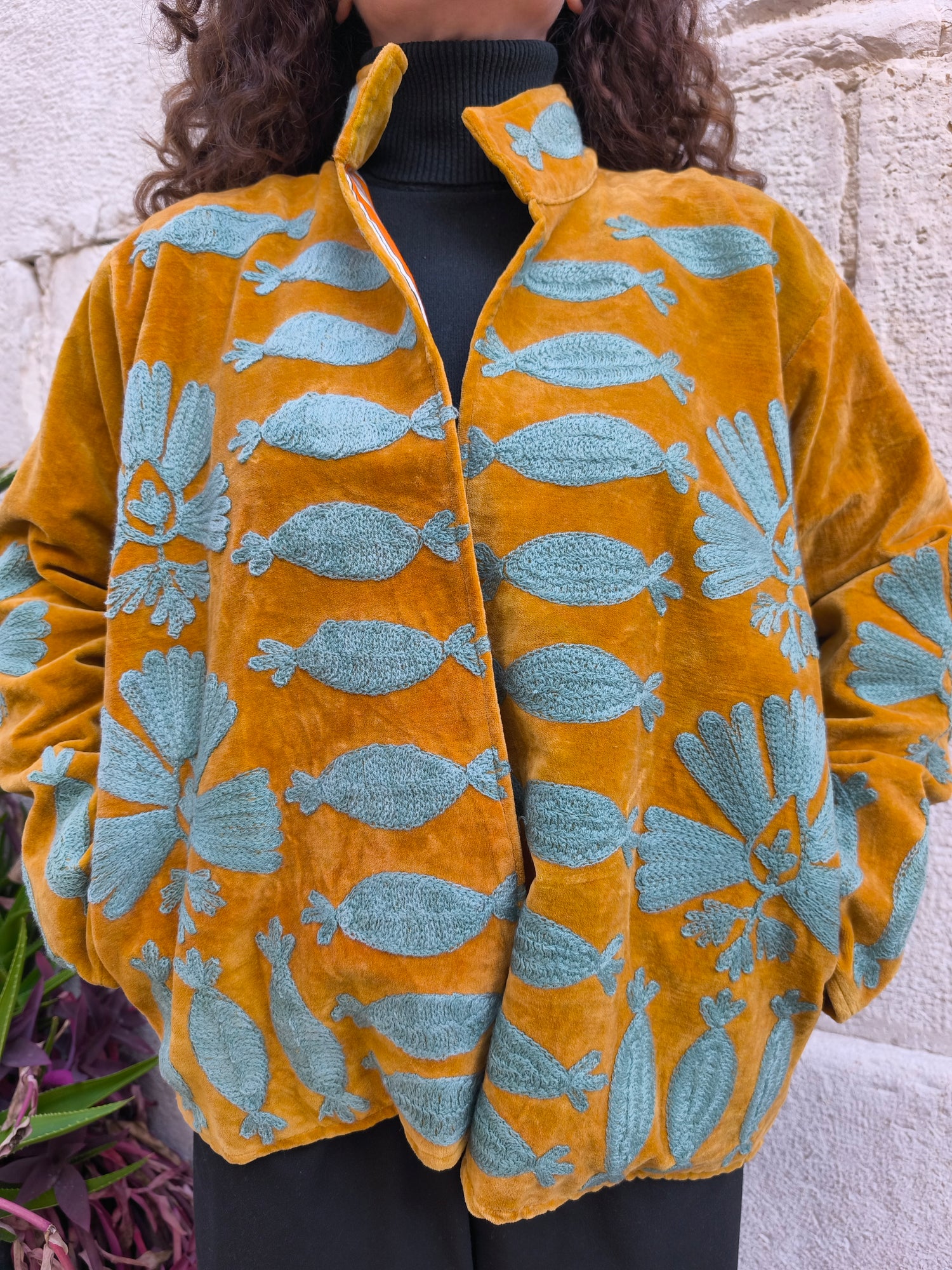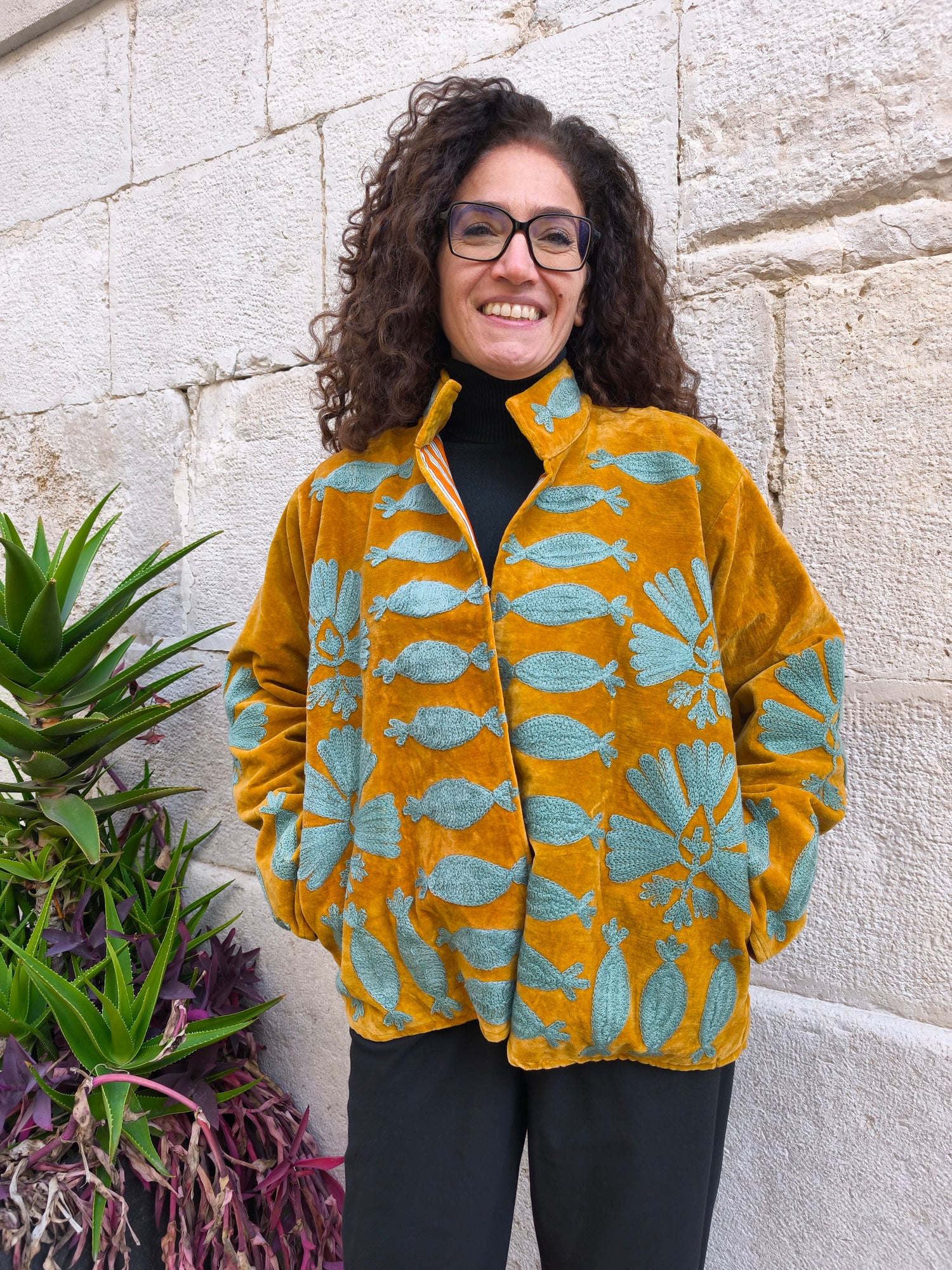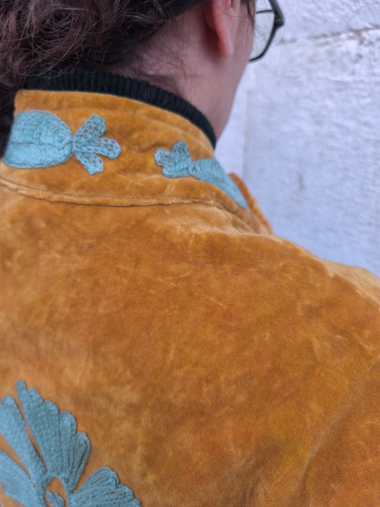 Colorata, luminosa e ricca di dettagli artigianali, questa giacca Suzani è un capo che unisce tradizione e creatività. Realizzata in velluto con ricami fatti a mano.
