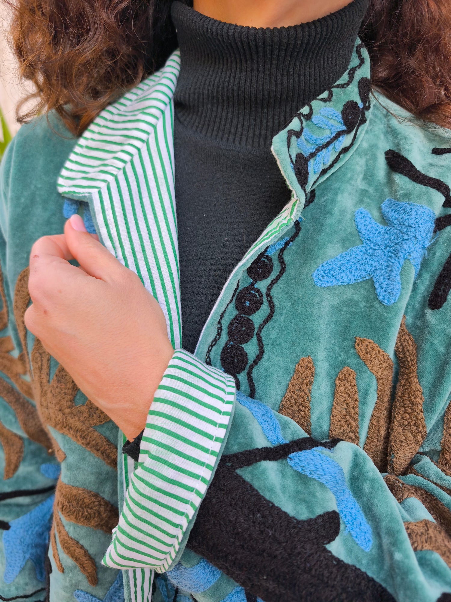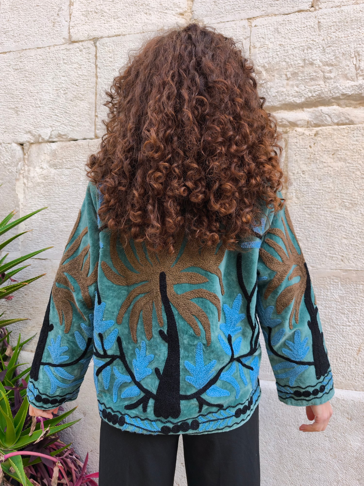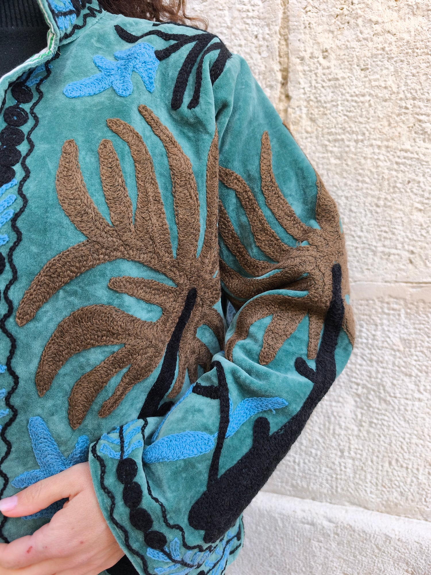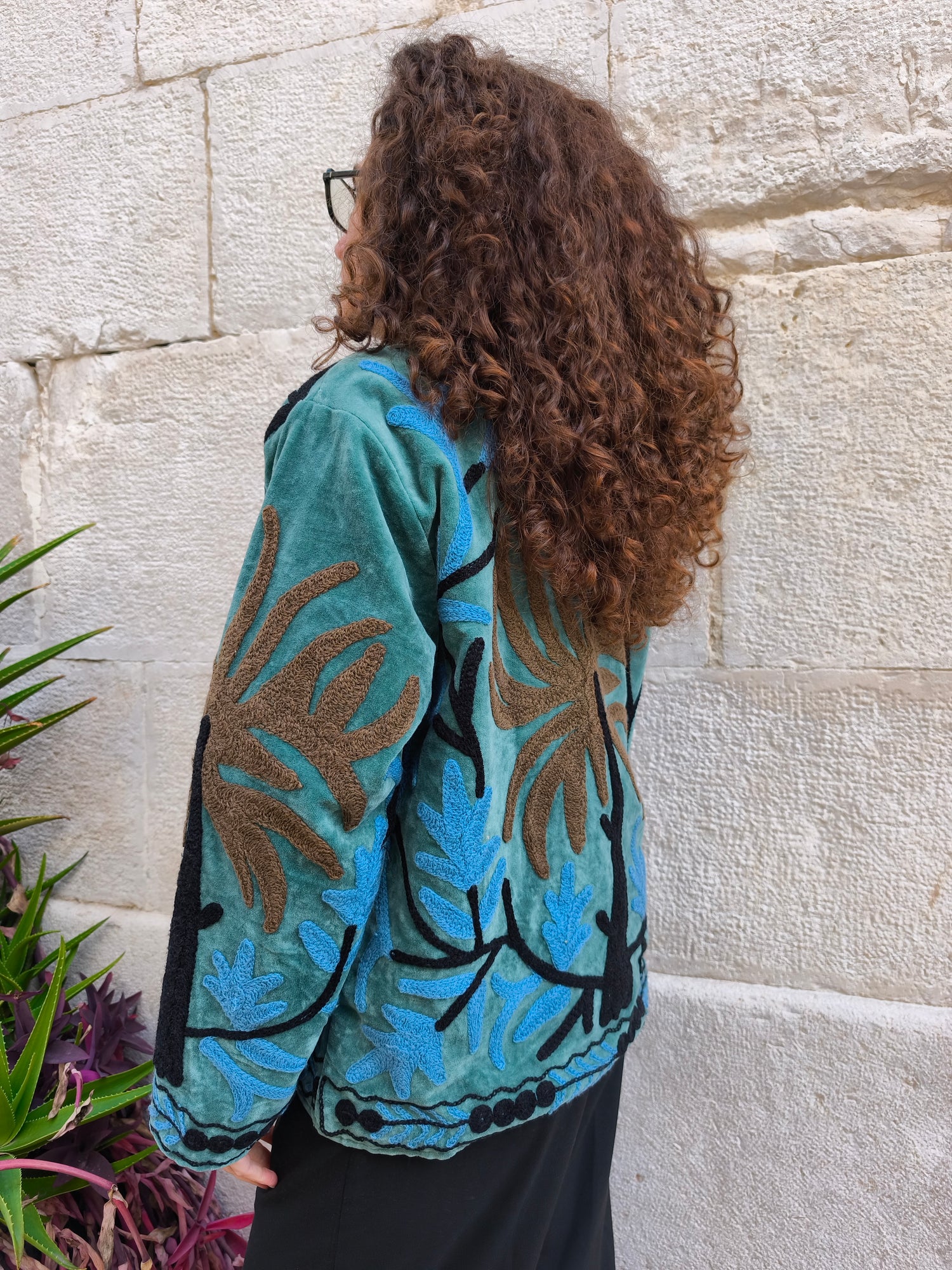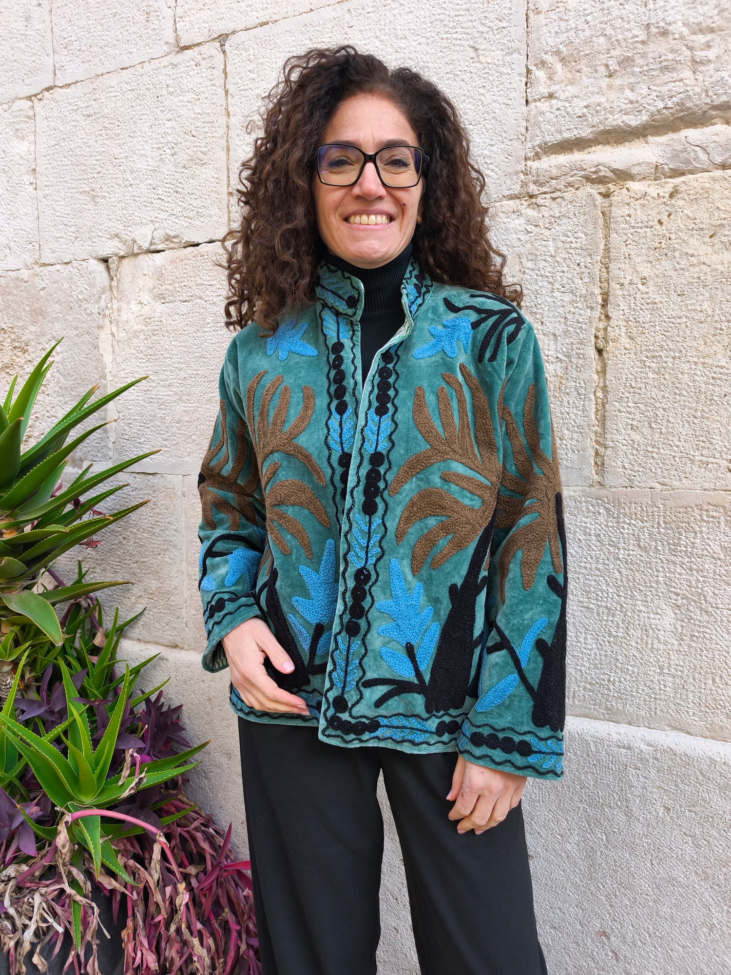 Colorata, luminosa e ricca di dettagli artigianali, questa giacca Suzani è un capo che unisce tradizione e creatività. Realizzata in velluto con ricami fatti a mano.