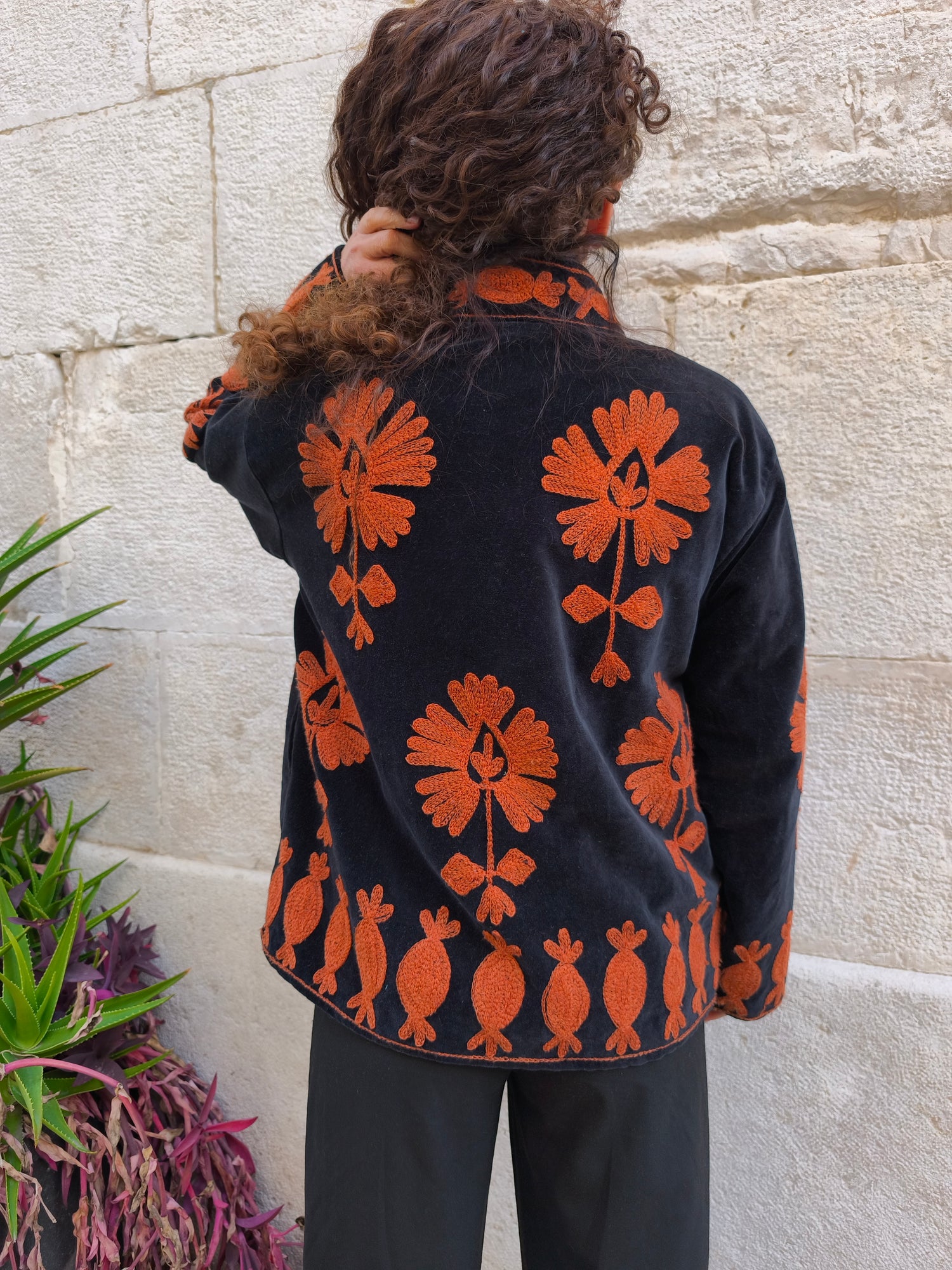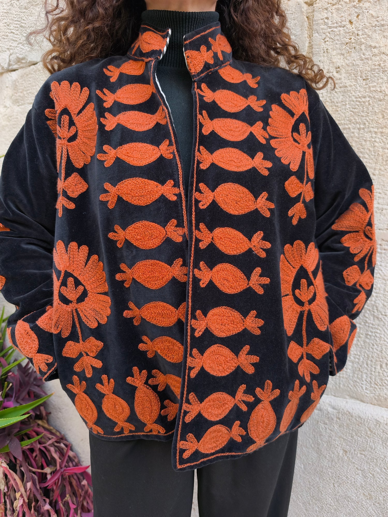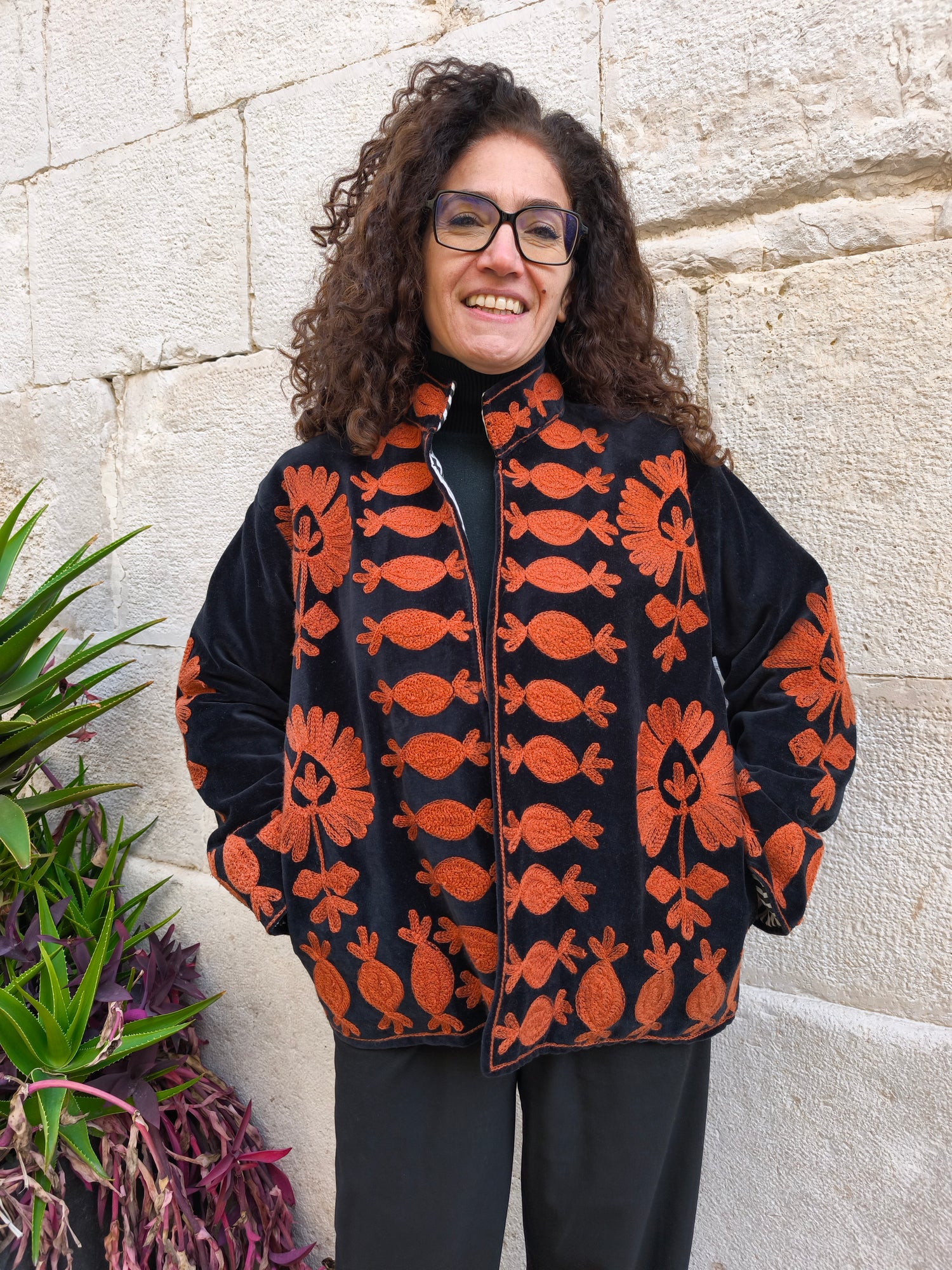 Colorata, luminosa e ricca di dettagli artigianali, questa giacca Suzani è un capo che unisce tradizione e creatività. Realizzata in velluto con ricami fatti a mano.