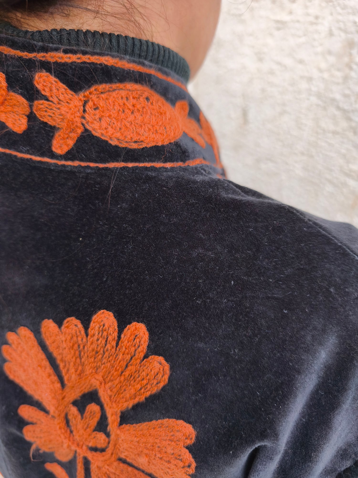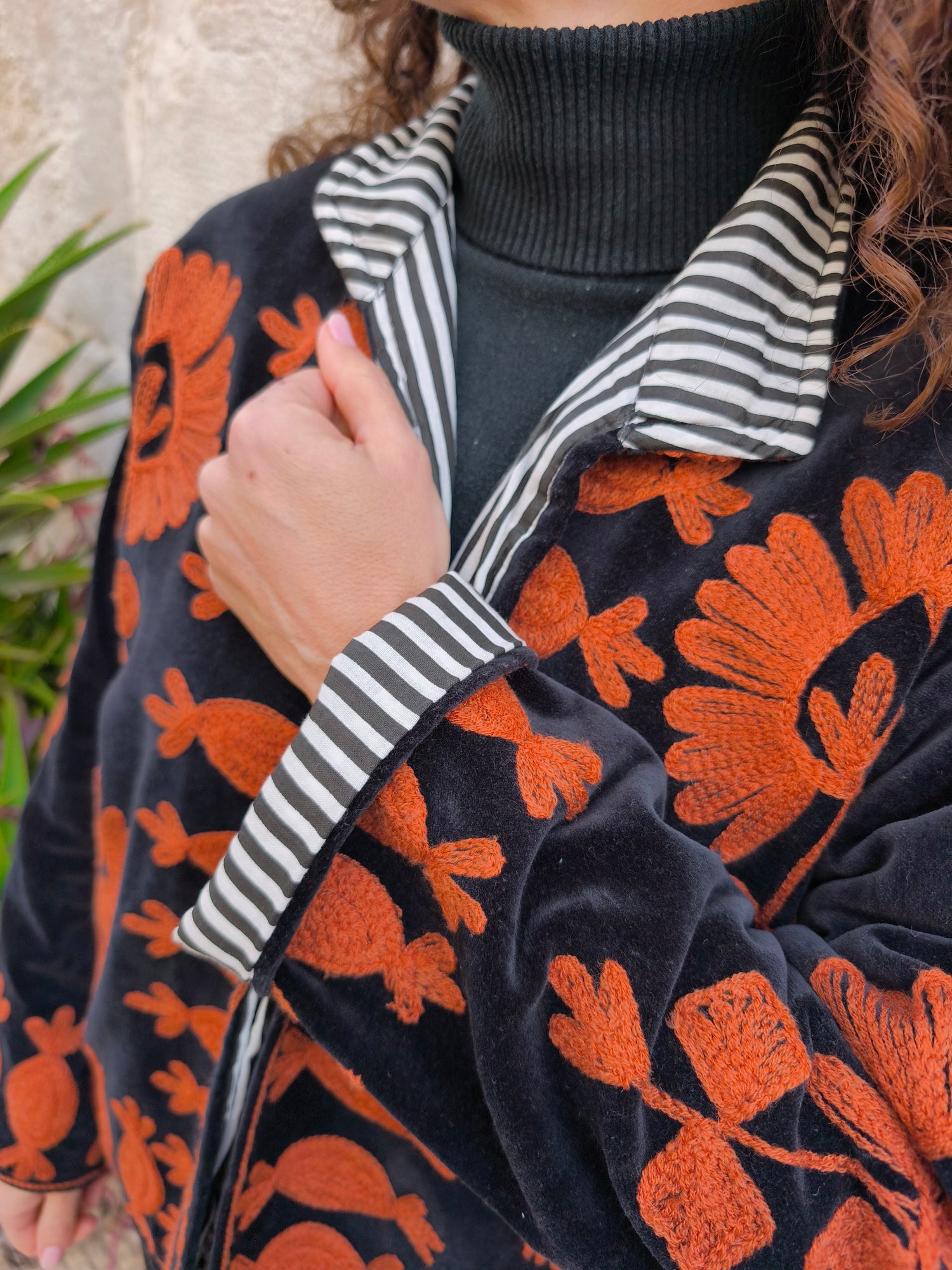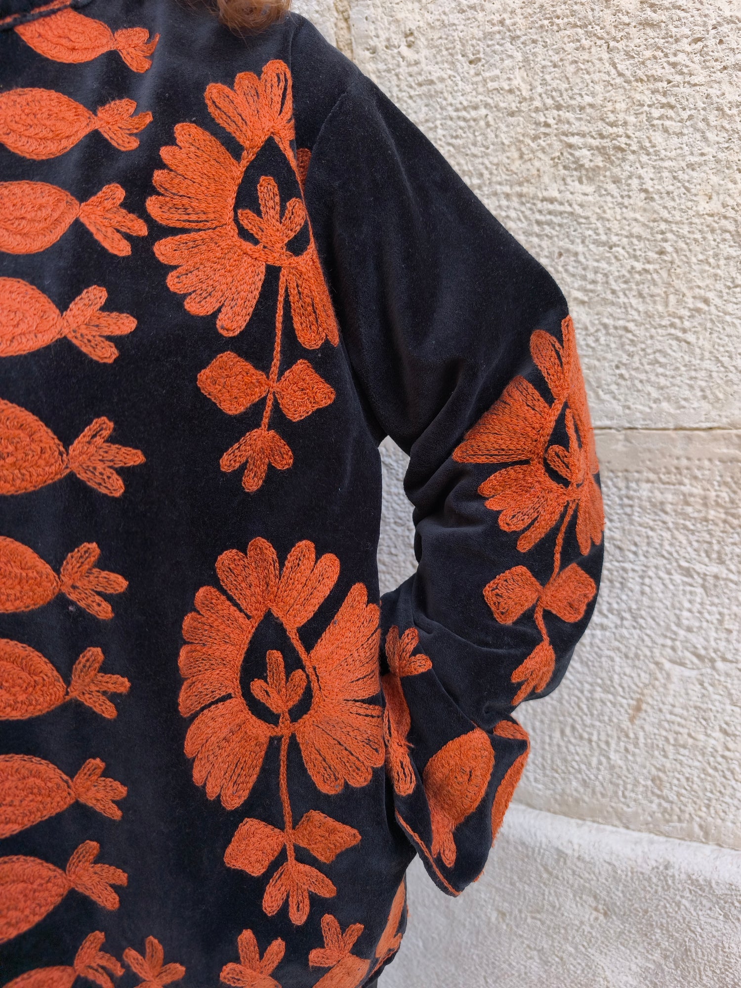 Colorata, luminosa e ricca di dettagli artigianali, questa giacca Suzani è un capo che unisce tradizione e creatività. Realizzata in velluto con ricami fatti a mano.