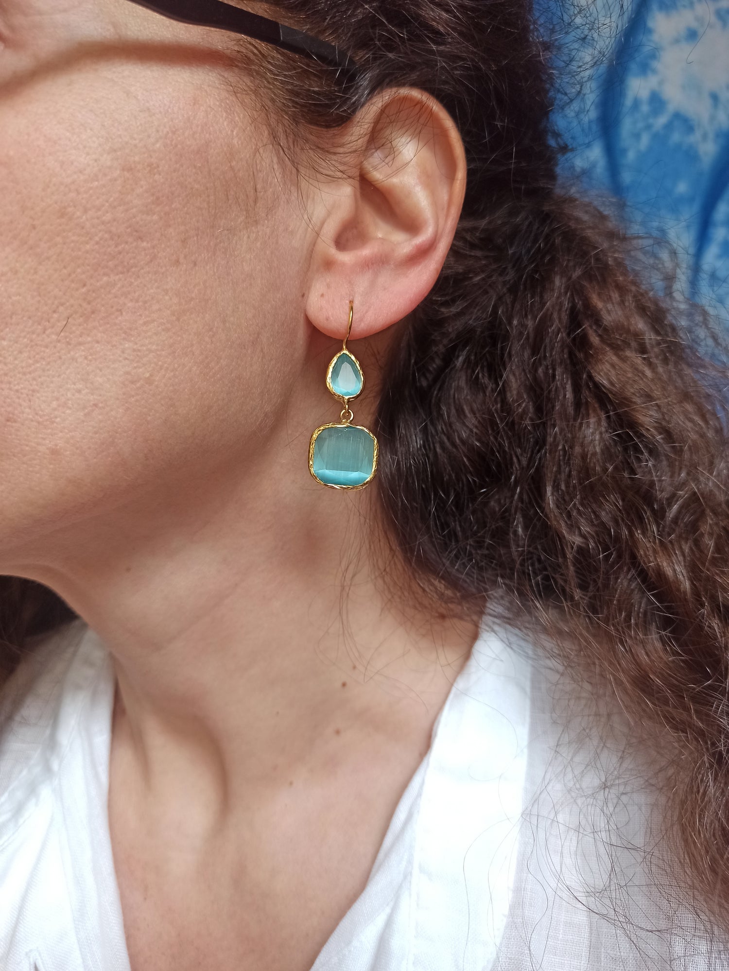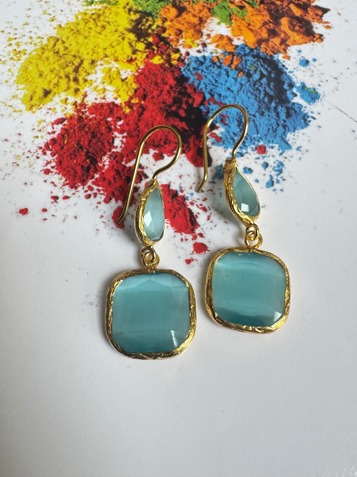 Orecchini in ottone anallergico con pietra occhio di gatto. Nichel free. Lunghezza 5cm.
