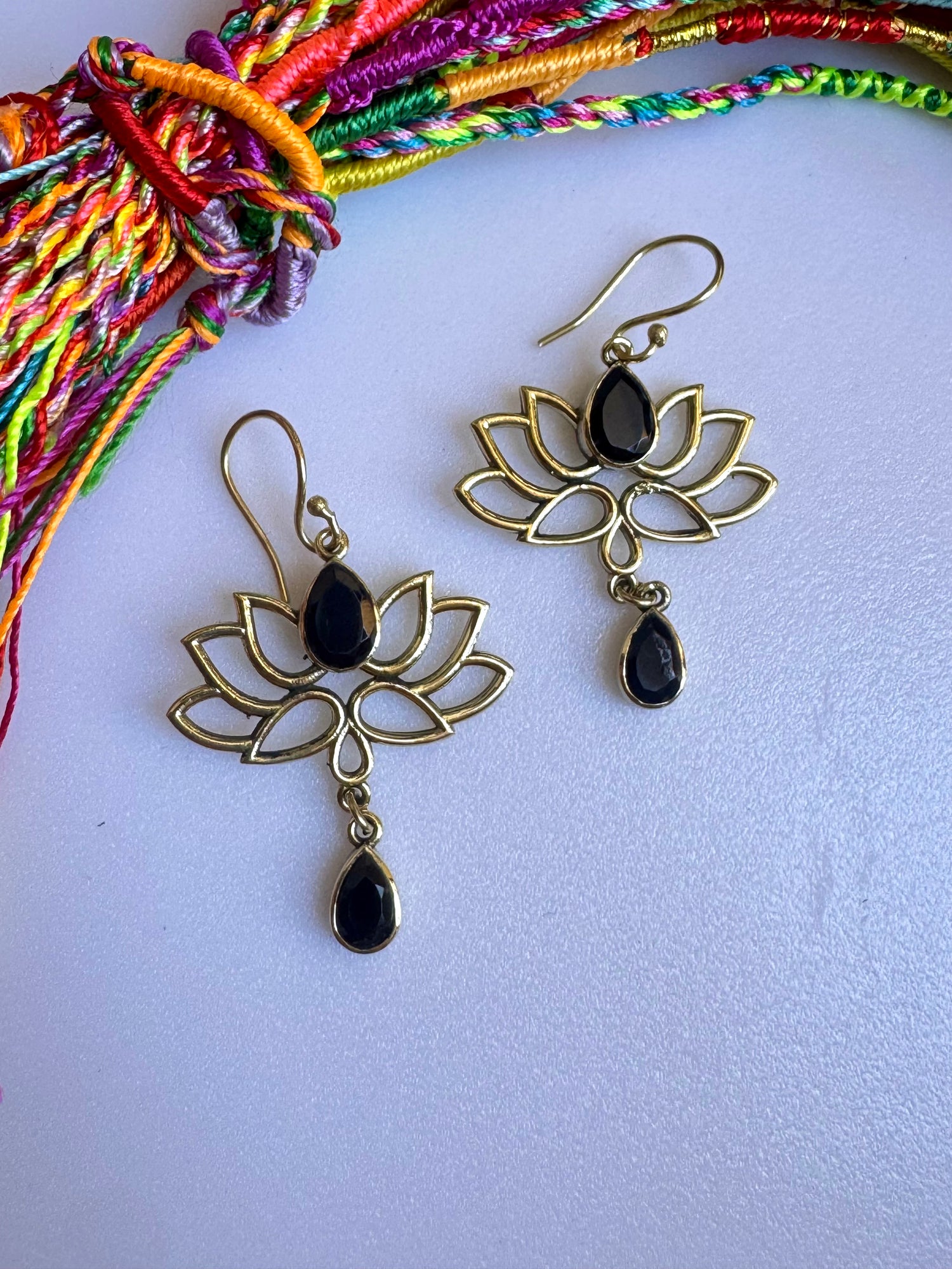 Orecchini in stile boho in ottone anallergico con inserto simil onice nero. Lunghezza 5cm circa compreso il gancio.
