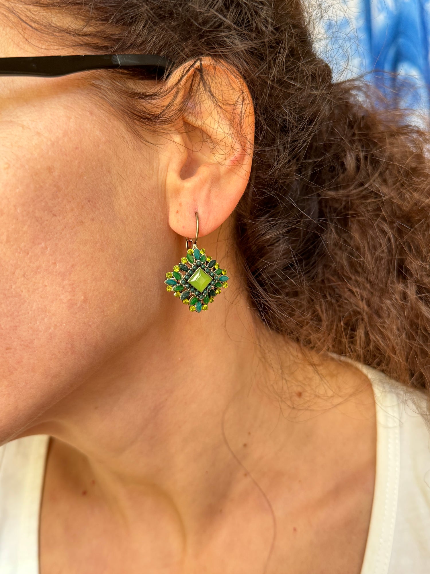 Orecchini pendenti decorati con strass color verde. Chiusura a clip. Lunghezza 2,5cm. Nichel free.