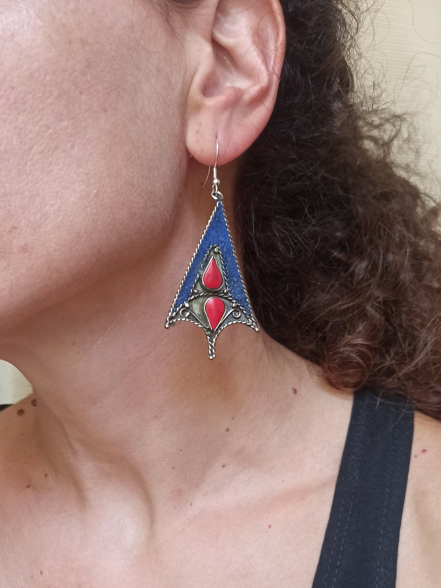 Leggerissimi orecchini in German silver con mosaico in chips di pietre dure nei toni del blu e rosso lavorati secondo la tradizione Nepalese.