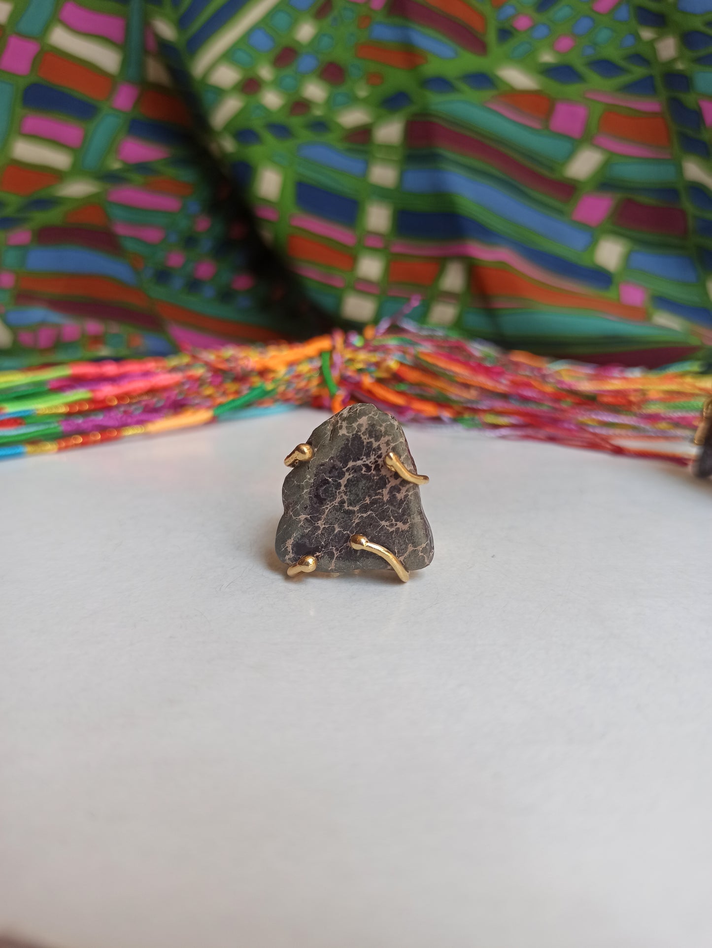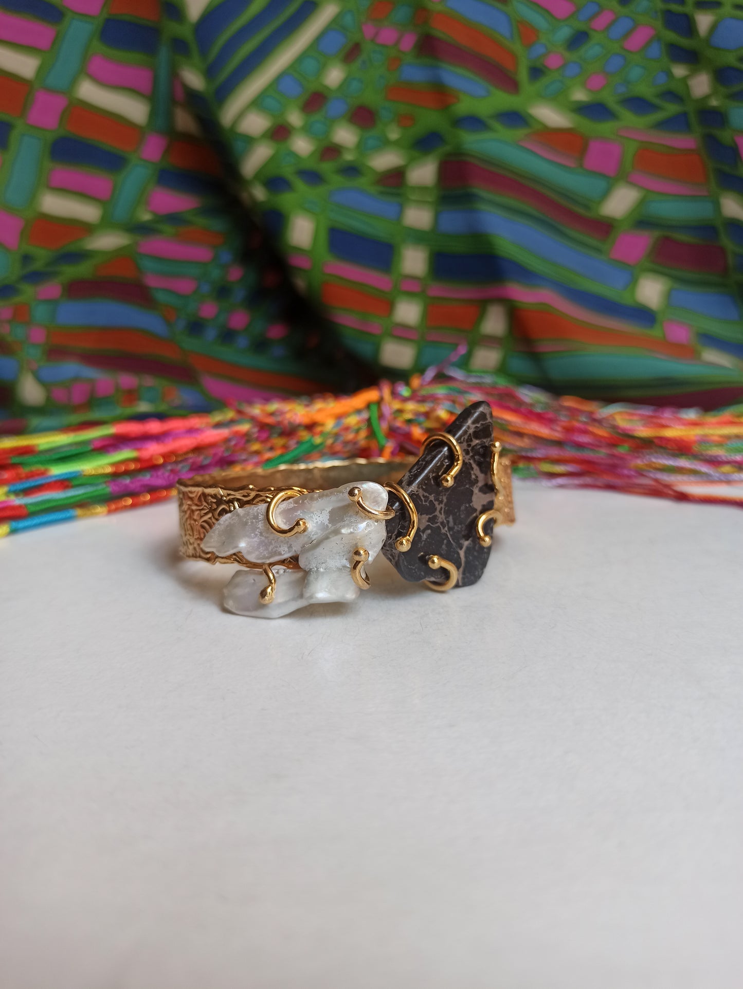 Questo spettacolare set è composto da un bacciale e un anello in lega di metallo con placcatura oro arricchito da madreperla e un inserto con sfumature del grigio marmorizzato.