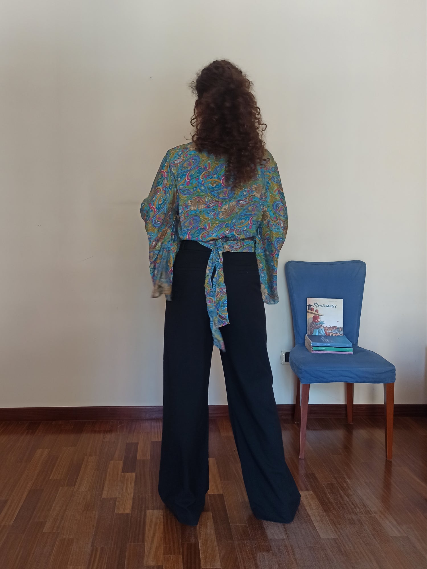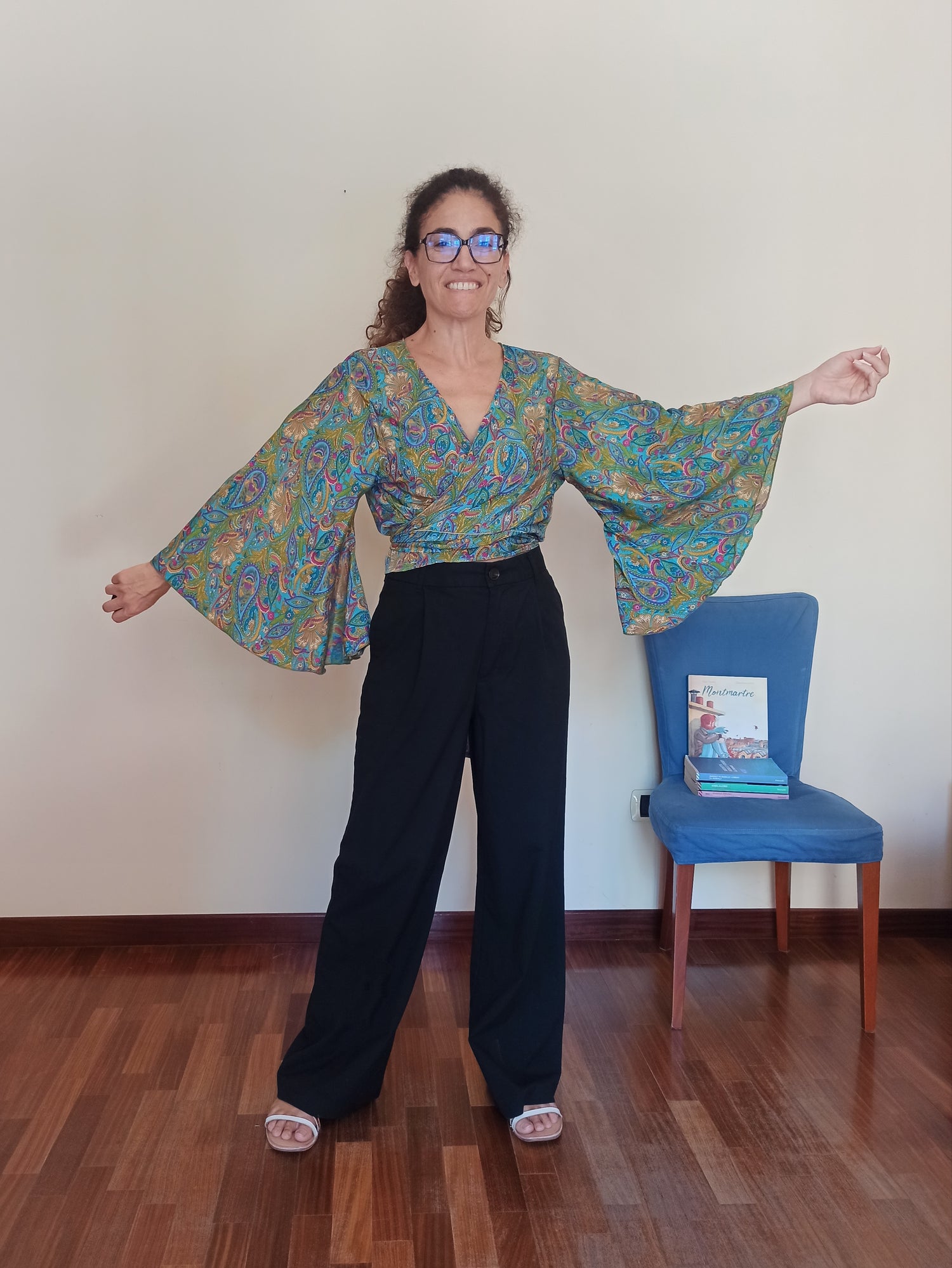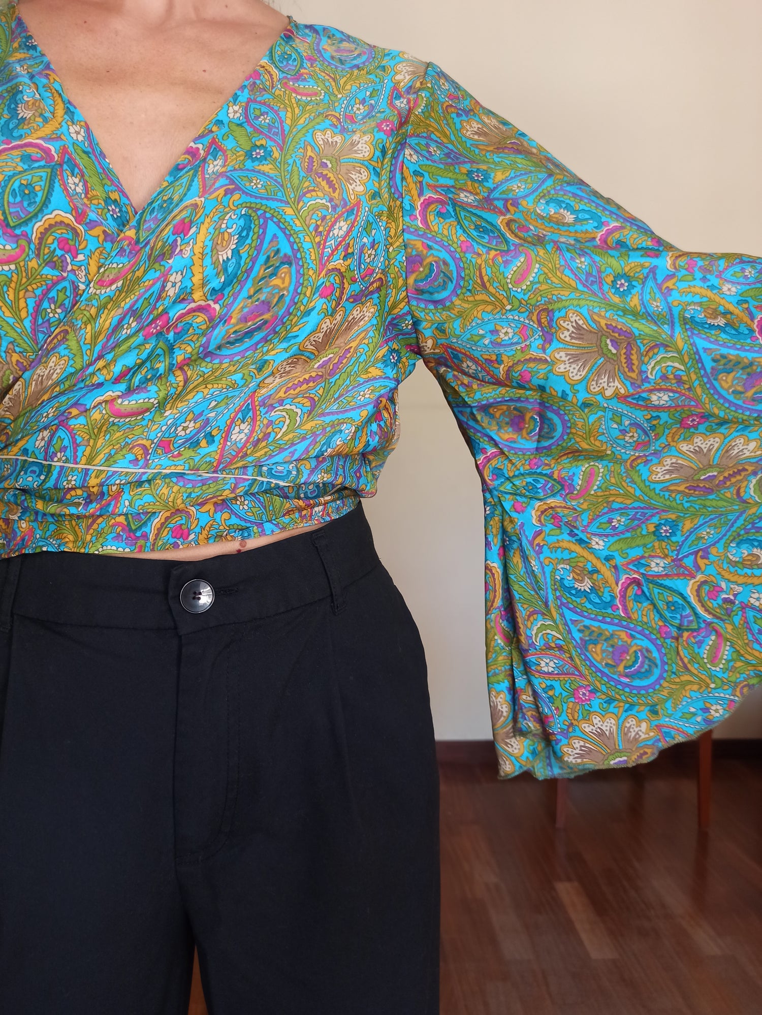 Questo top incrociato è un’esplosione di colori e stile! Caratterizzato da una vivace fantasia paisley multicolor, presenta un design a portafoglio che si annoda elegantemente sul fianco o dietro, valorizzando la silhouette con un tocco boho-chic. Le maniche ampie a pipistrello offrono comfort e libertà di movimento, mentre la lunghezza crop aggiunge un tocco moderno e fresco, perfetto da abbinare a pantaloni a vita alta o gonne fluide. Realizzato in un tessuto leggero e traspirante, è ideale per le giornate calde o le serate estive.